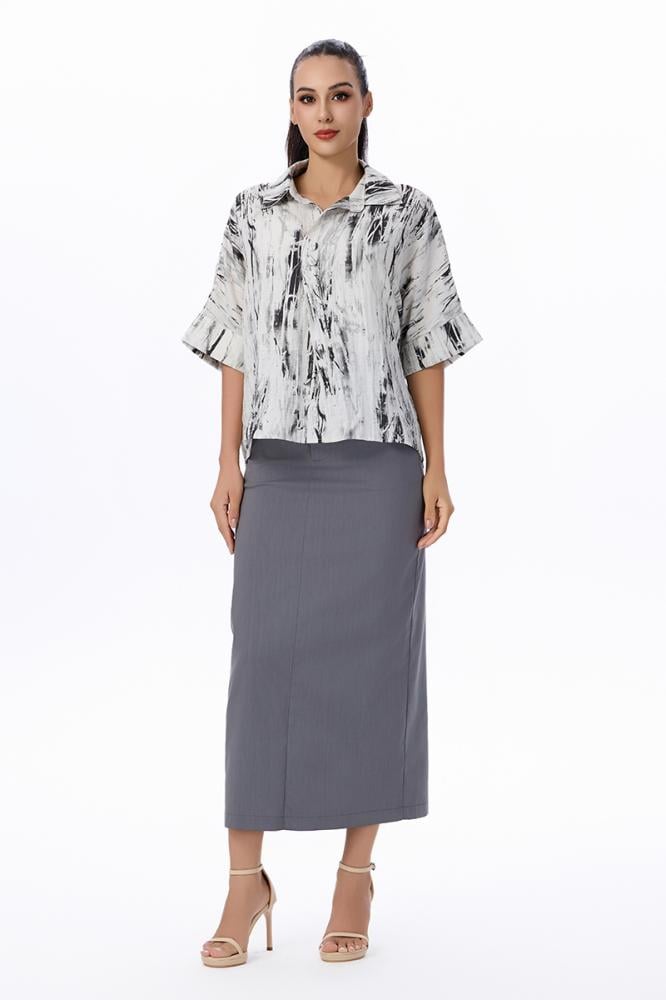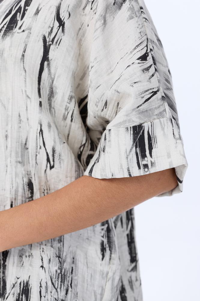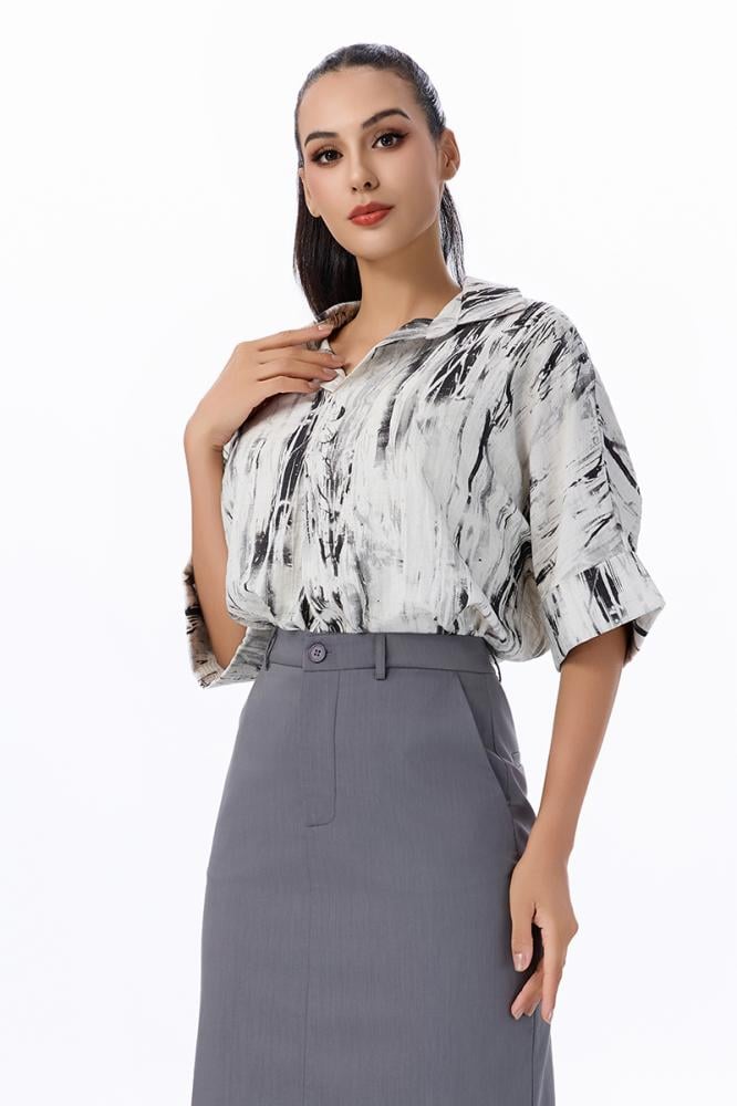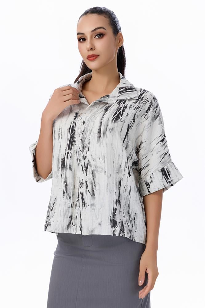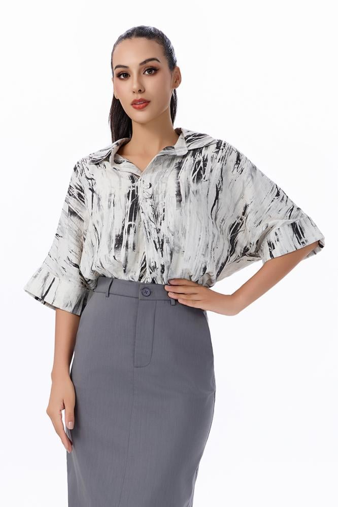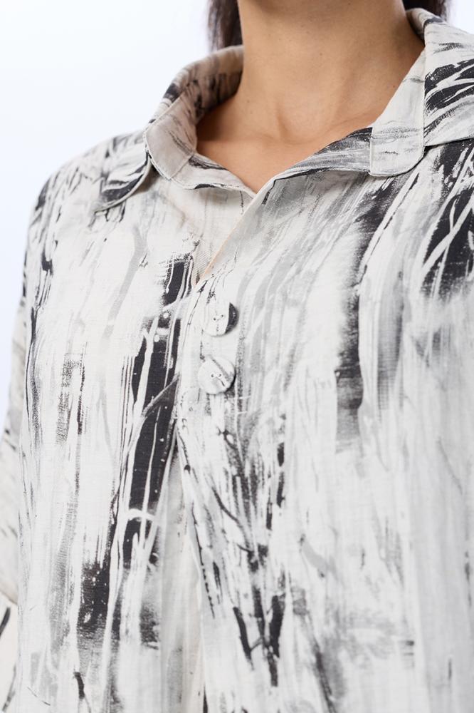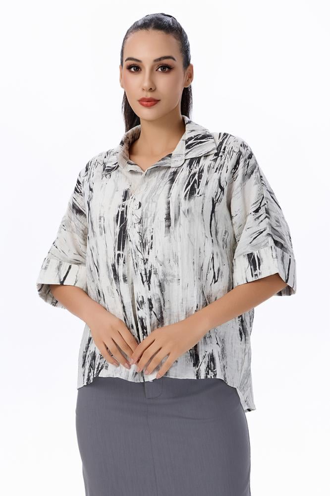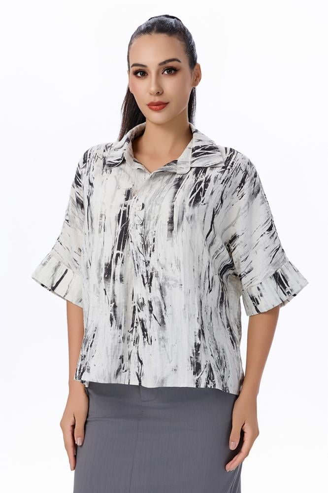 اعكسي أسلوبك الفريد مع هذه البلوزة الأنيقة ذات التصميم الفضفاض بطبعة فنية تجريدية بالألوان الأسود والرمادي على خلفية أوف وايت ناعمة. تتميز بقصة مريحة وأكمام متوسطة بطيات أنيقة، وياقة كلاسيكية تمنحها توازناً مثالياً بين الطابع العملي والستايل الجريء.