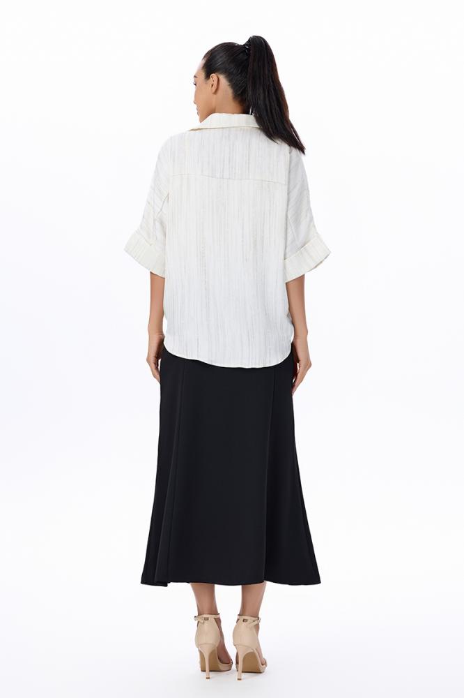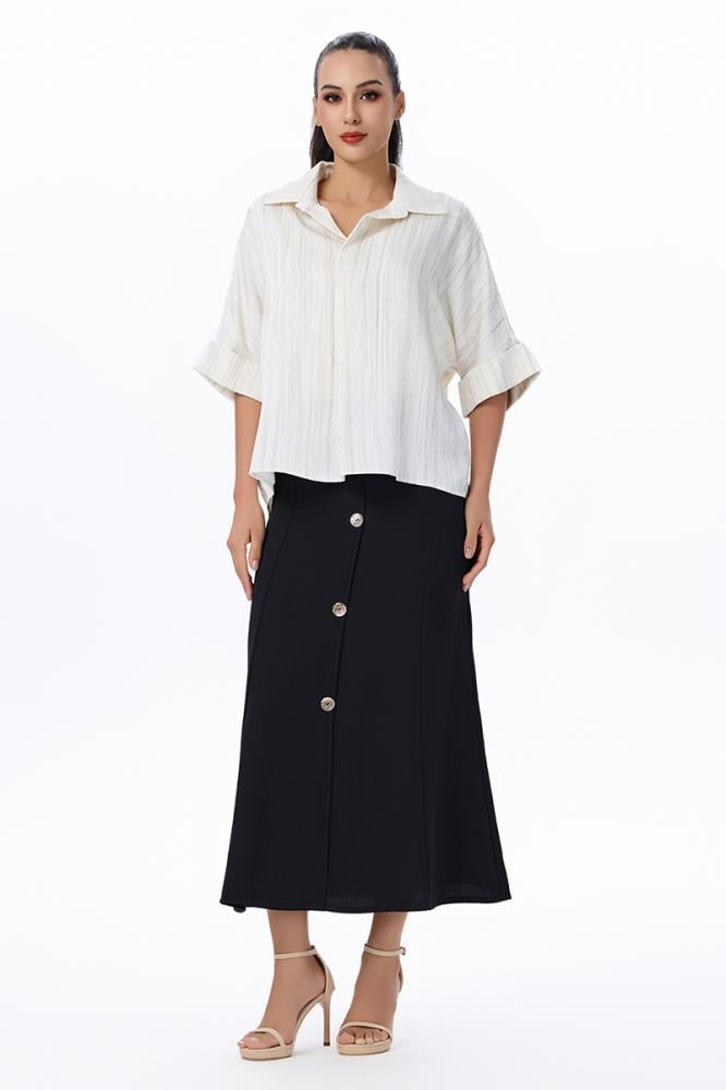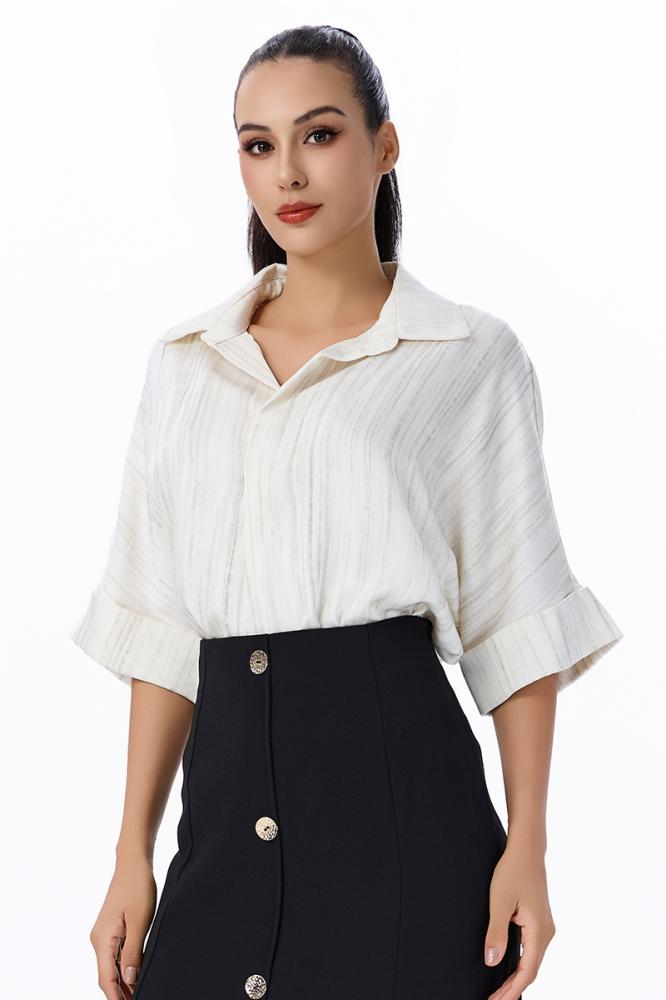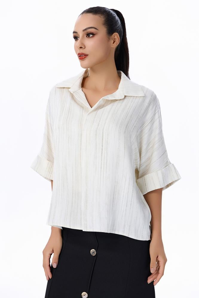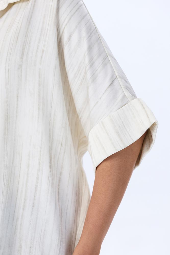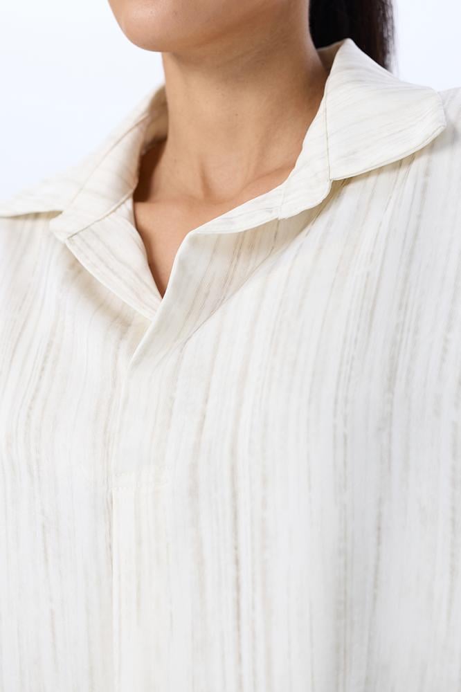 أضيفي إلى خزانة ملابسك قطعة أساسية أنيقة مع هذه البلوزة الواسعة بلون أوف وايت المزين بخطوط طولية ناعمة تضفي طابعاً عصرياً وبسيطاً في آنٍ واحد. تأتي بقصة فضفاضة وأكمام عريضة منثنية لراحة وأناقة طوال اليوم، مع ياقة كلاسيكية تمنحها طابعاً عملياً يناسب مختلف الإطلالات.