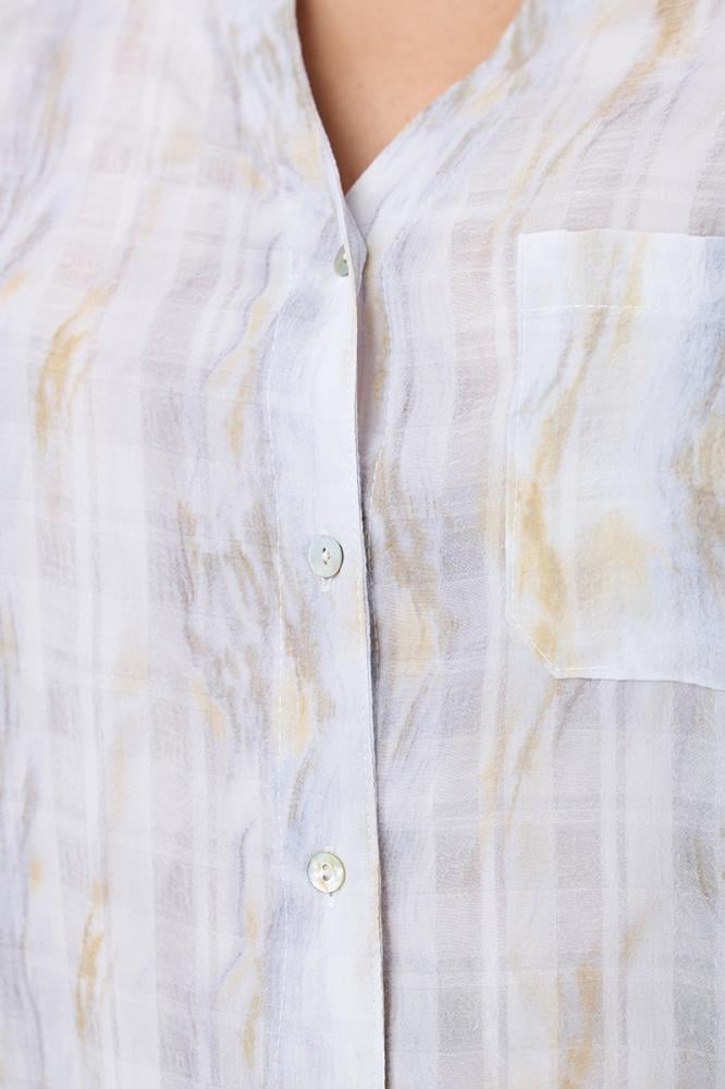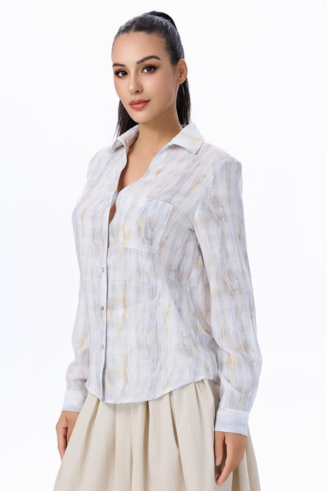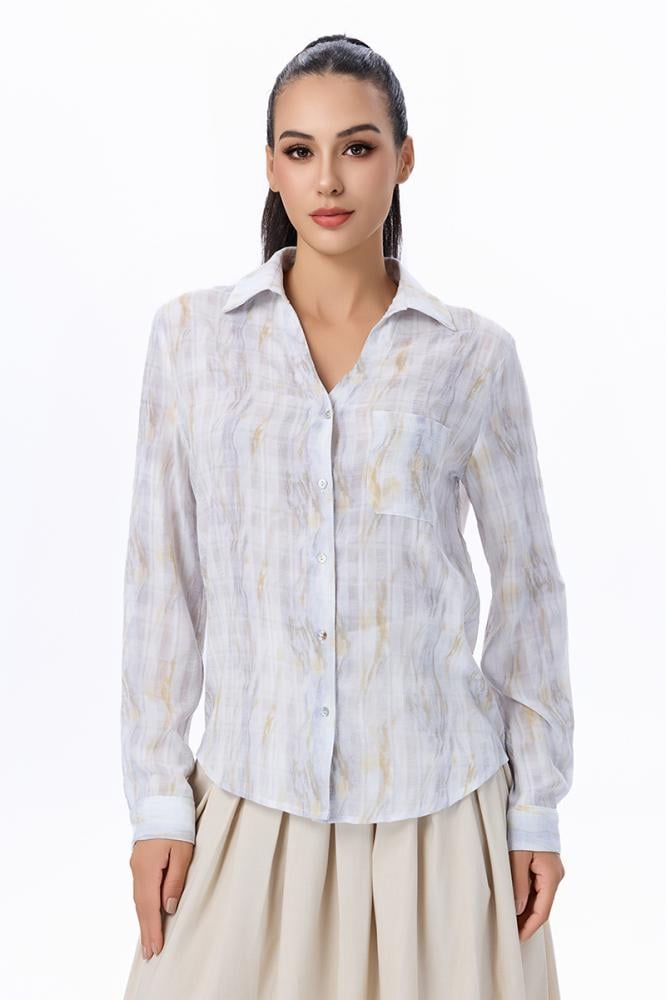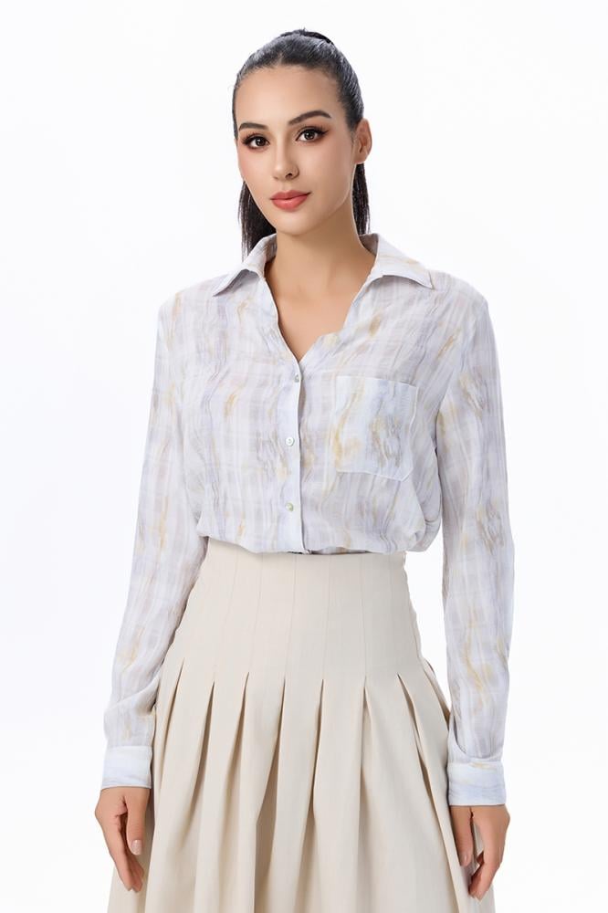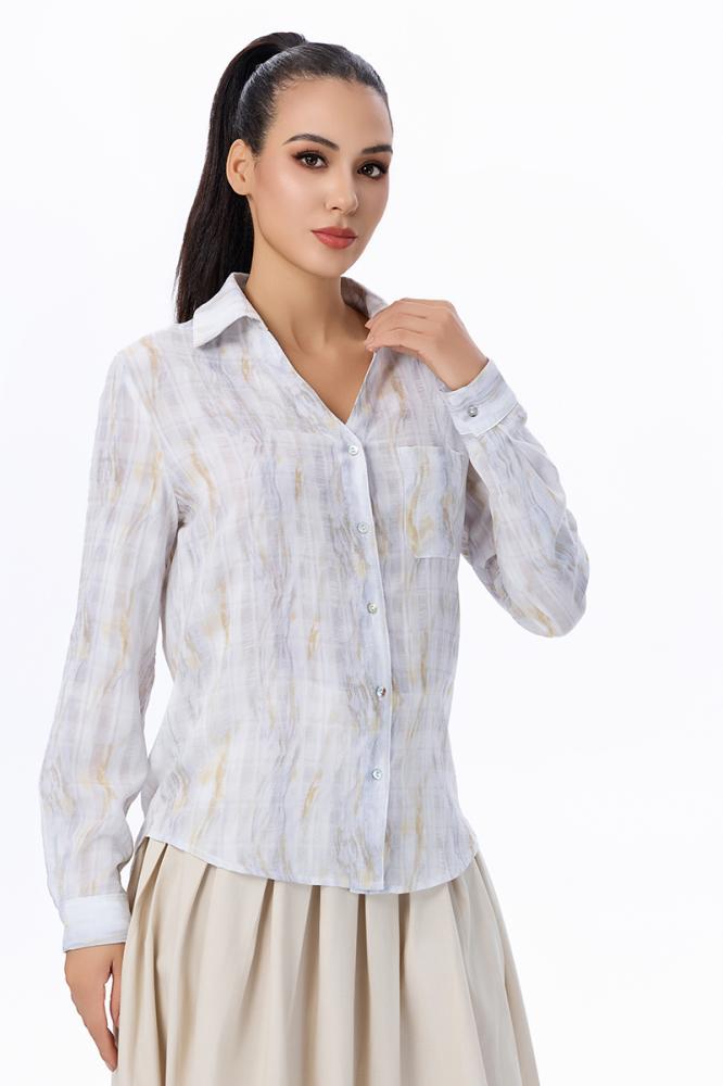 استمتعي بإطلالة ناعمة وأنيقة مع هذه البلوزة ذات النقشة الخفيفة والألوان الفاتحة التي تضفي إحساساً بالهدوء والراحة. مصممة بقصة كلاسيكية مريحة، وياقة رسمية وأزرار أمامية، مع جيب صغير على الصدر يضفي لمسة عملية.