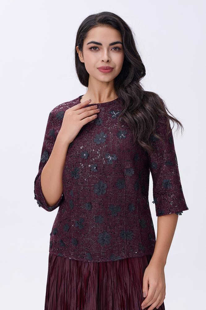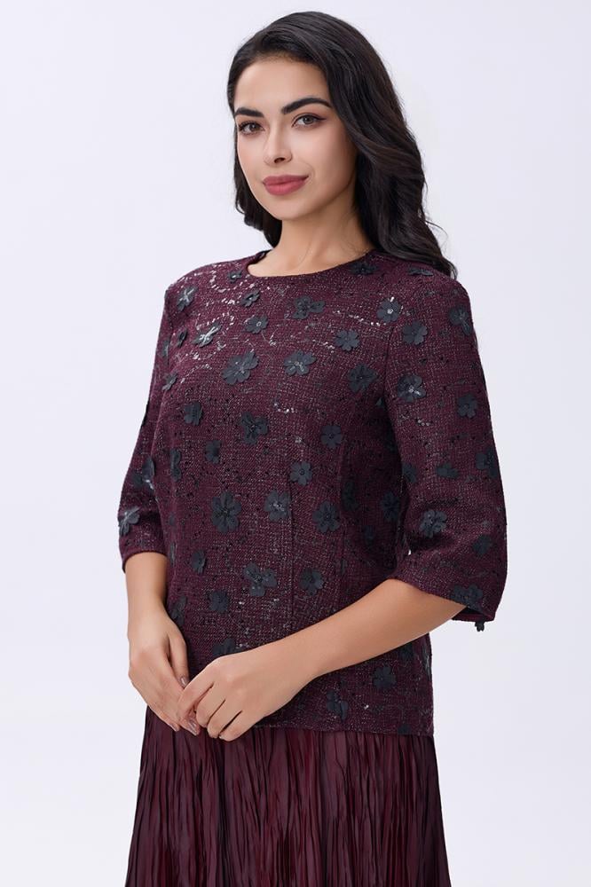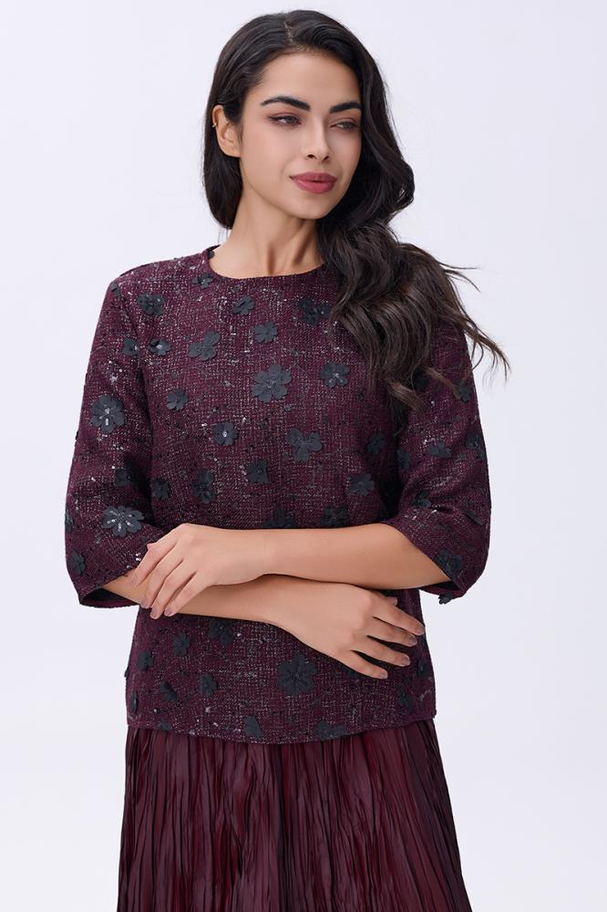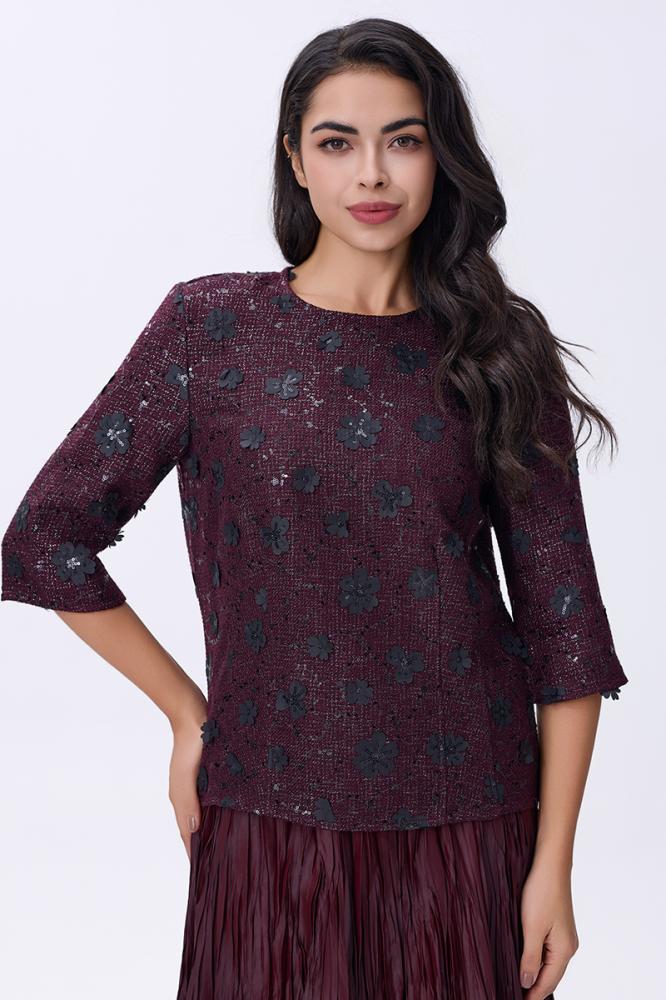 أضيفي لمسة فاخرة إلى إطلالتك مع هذه البلوزة البورغندي الأنيقة بتصميم ناعم يفيض أنوثة. تتميز بتطريزات زهرية براقة تضيف لمسة لامعة فخمة، مع أكمام متوسطة الطول وقماش غني يبرز فخامة التفاصيل. خيار مثالي للمناسبات الراقية أو السهرات الشتوية.