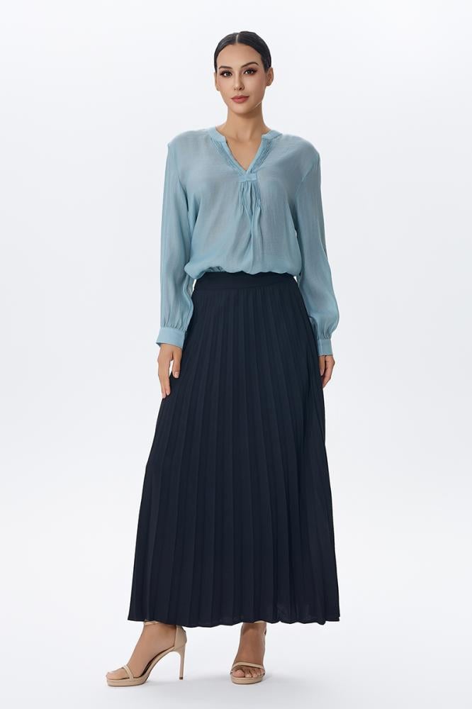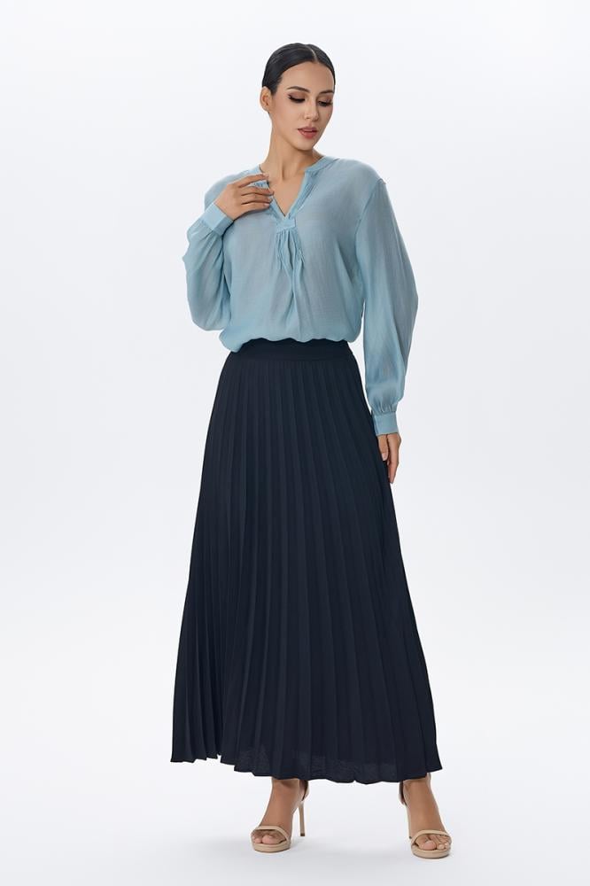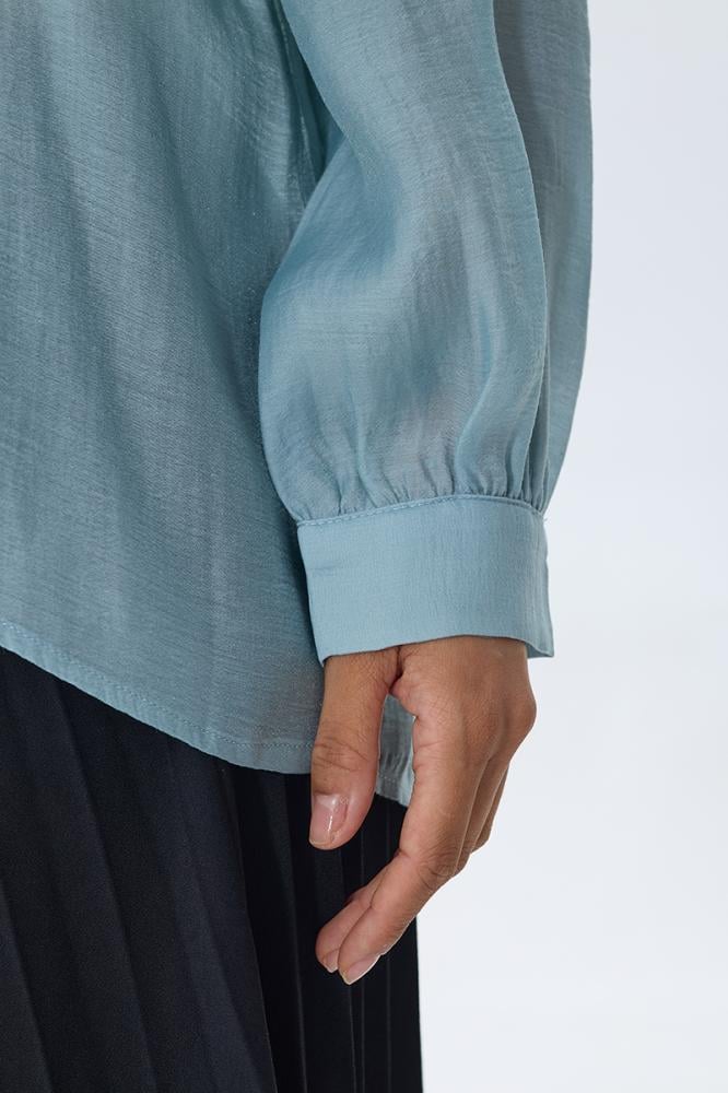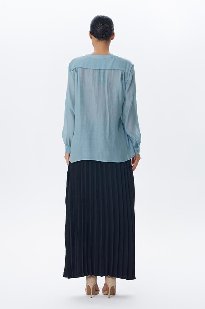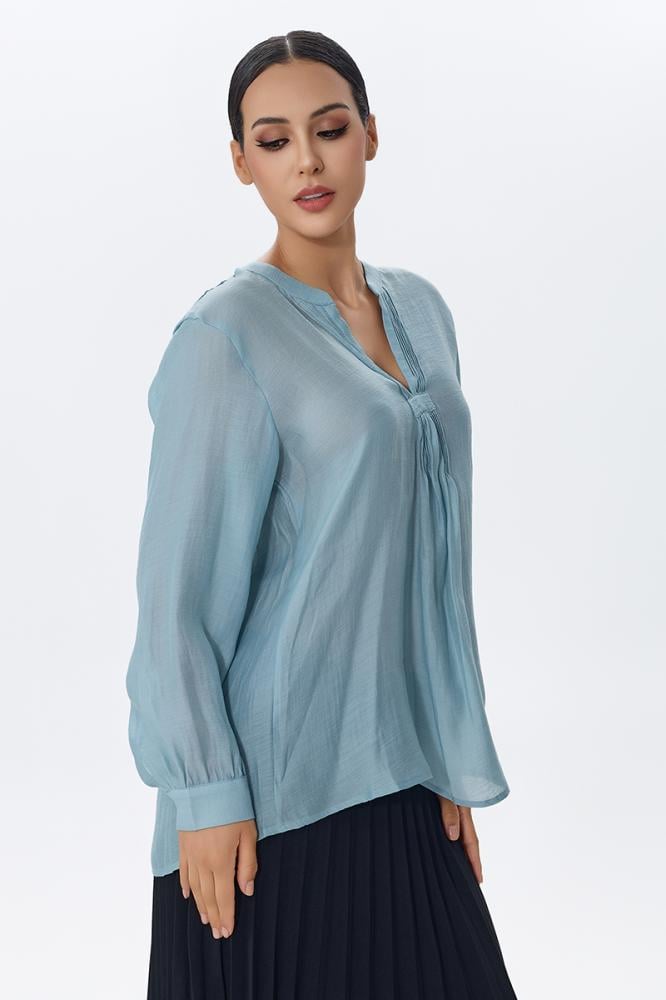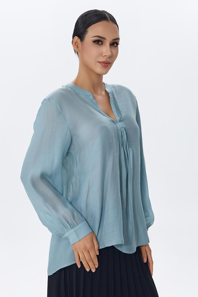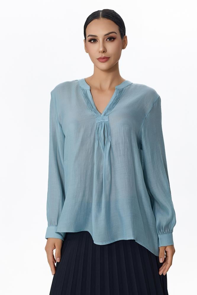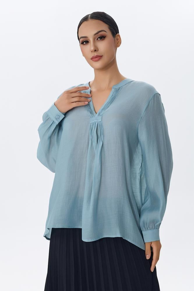 بلوزة بياقة مفتوحة بلون أزرق سماوي – نعومة أنثوية بإطلالة هادئة