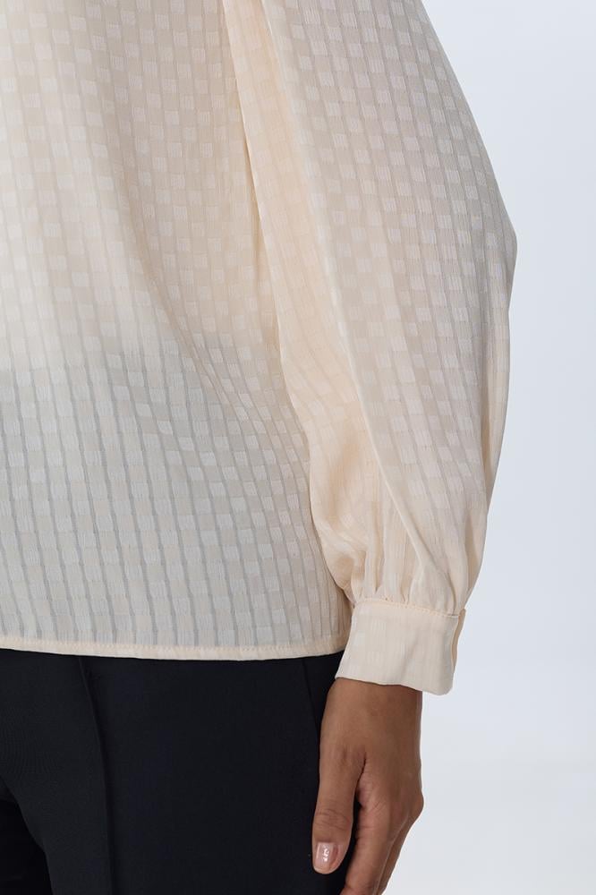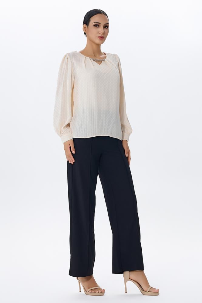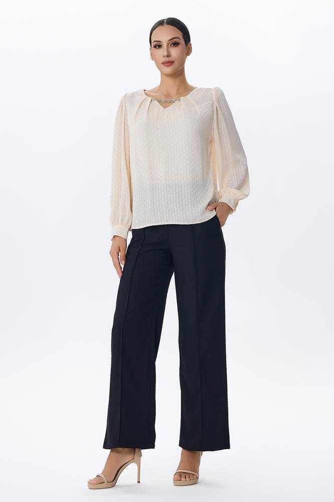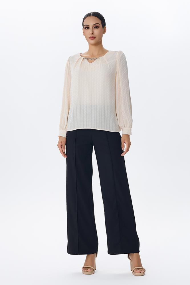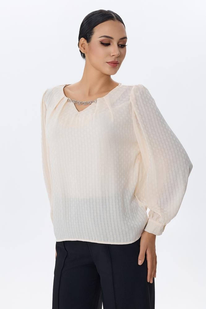 بلوزة بيج شيفون ناعمة بإكسسوار – أناقة ناعمة بلمسة فاخرة