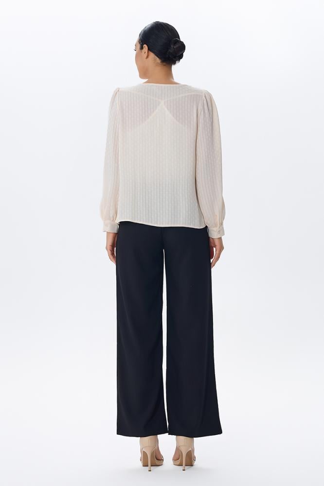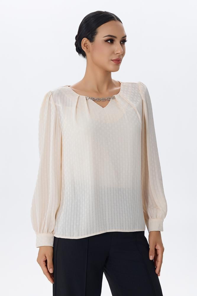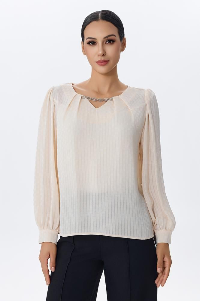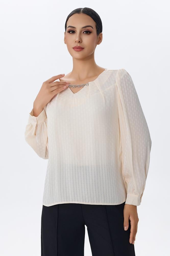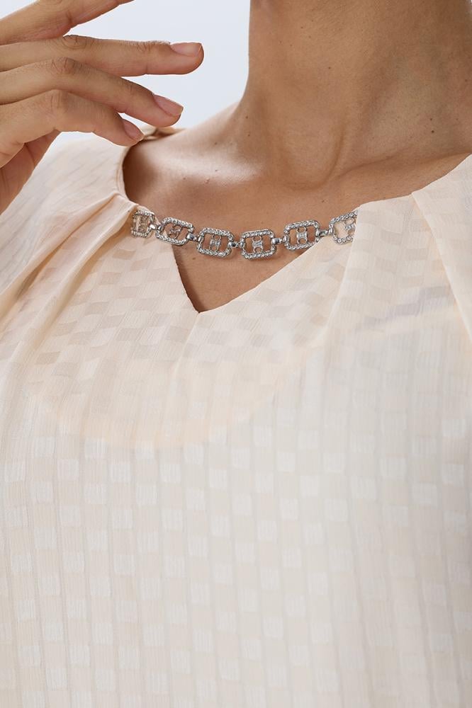 استمتعي بإطلالة أنثوية ناعمة مع هذه البلوزة الأنيقة بلون البيج الهادئ، المصممة بخطوط طولية رقيقة تمنح الجسم مظهرًا أكثر توازناً. يزين الياقة الأمامية سلسلة معدنية فضية تضيف لمسة فاخرة دون الحاجة لإكسسوارات إضافية. مثالية لإطلالة رسمية أو مسائية أنيقة.