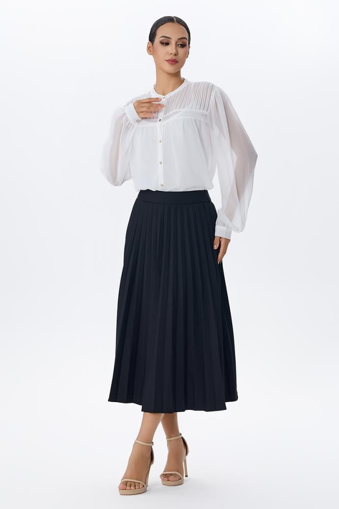 تألقي بإطلالة ناعمة وراقية مع هذه البلوزة البيضاء ذات التصميم الشفاف والتفاصيل الدقيقة من الكسرات العلوية. تجمع بين البساطة والأنوثة بأسلوب عصري مثالي للمناسبات الأنيقة أو الإطلالات اليومية الفاخرة. قصة واسعة مريحة تنسدل بنعومة وتمنحك حرية في الحركة مع لمسة فاخرة لا تُقاوم.