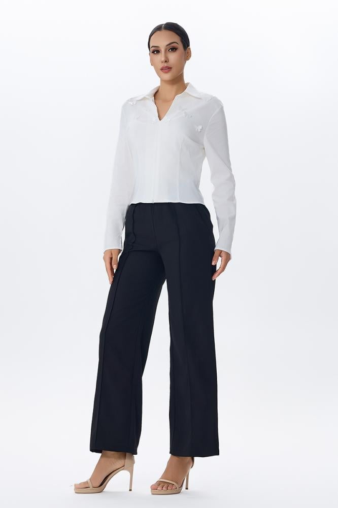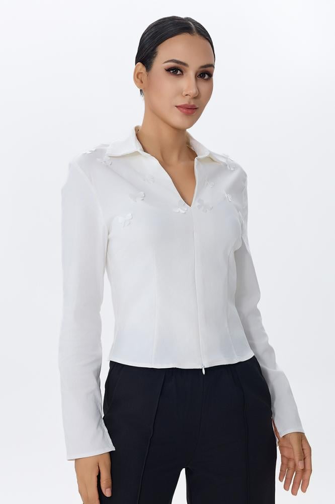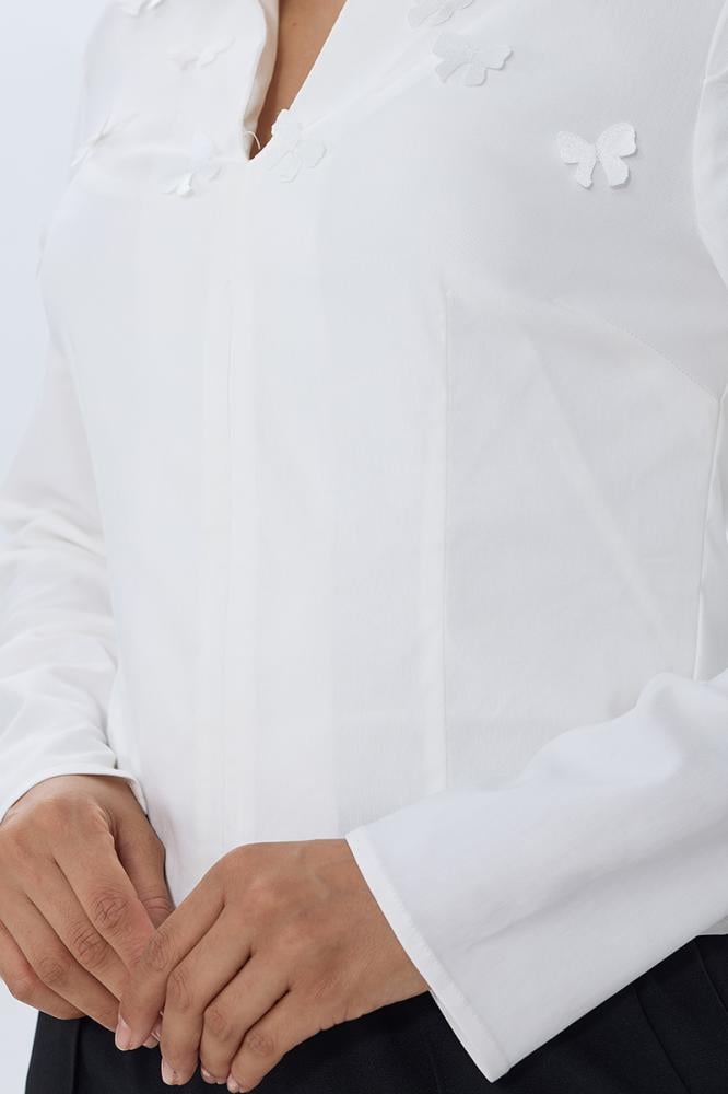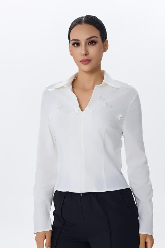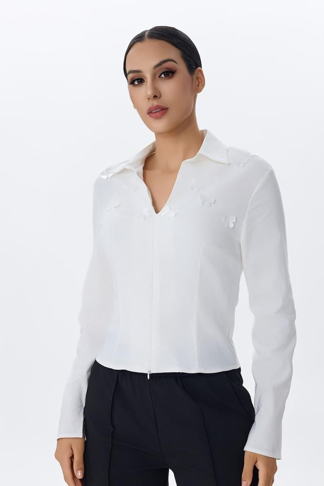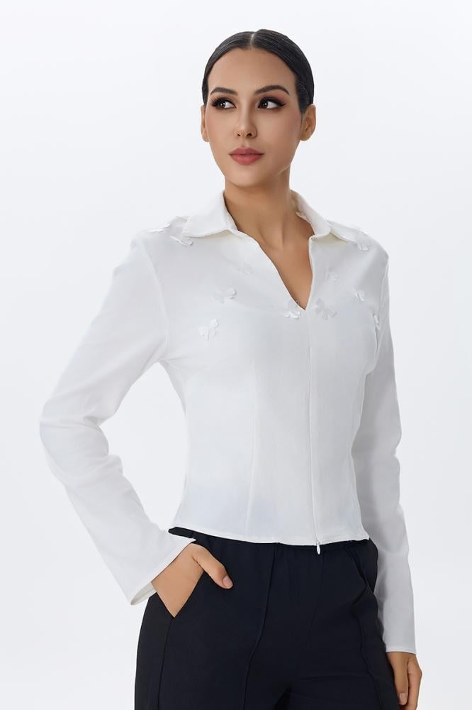 بلوزة بيضاء مزينة بتطريز ناعم وسحاب أمامي – أناقة أنثوية ناعمة