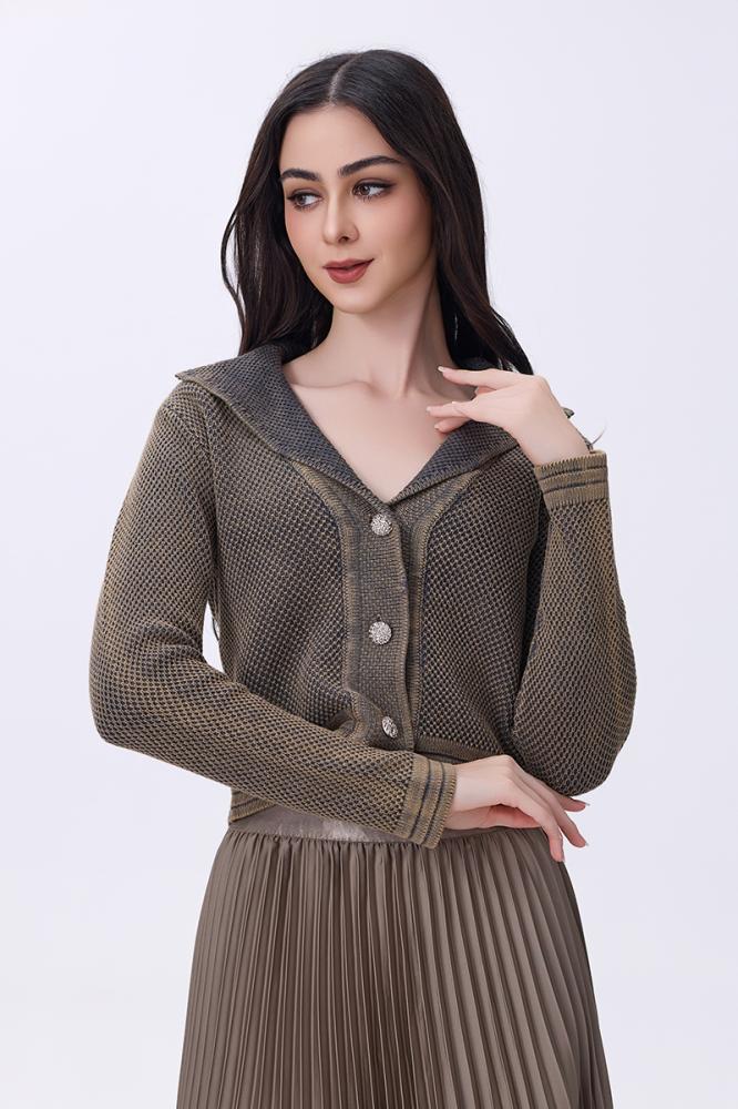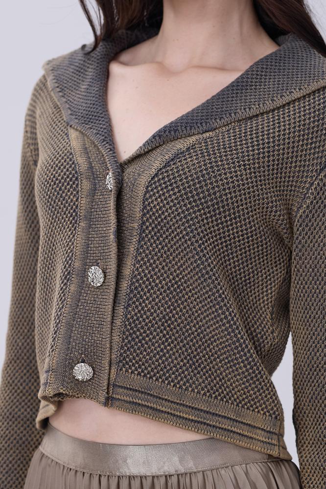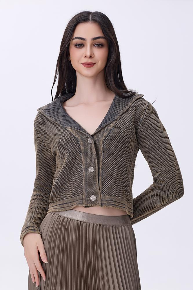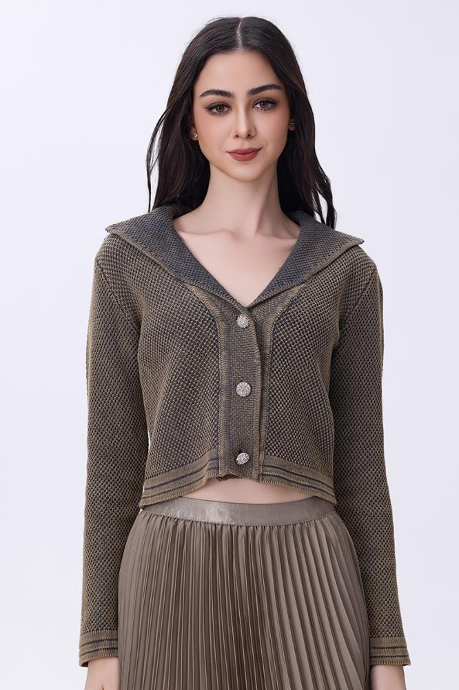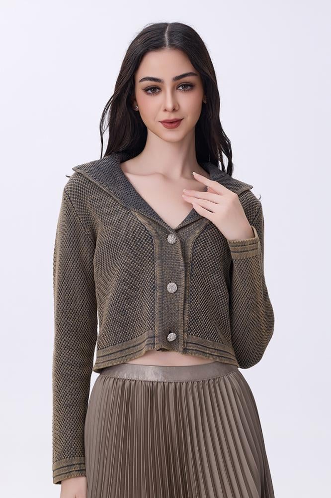بلوزة بُنية قصيرة بياقة عريضة وأزرار لؤلؤية