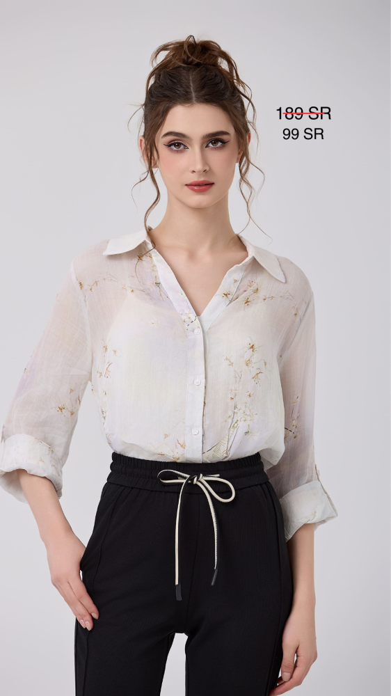 بلوزة شيفون بيج بنقشة ورود ناعمة وقصة كلاسيكية مريحة