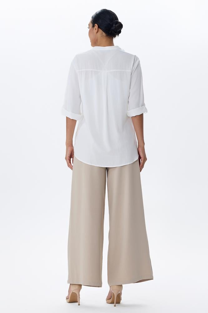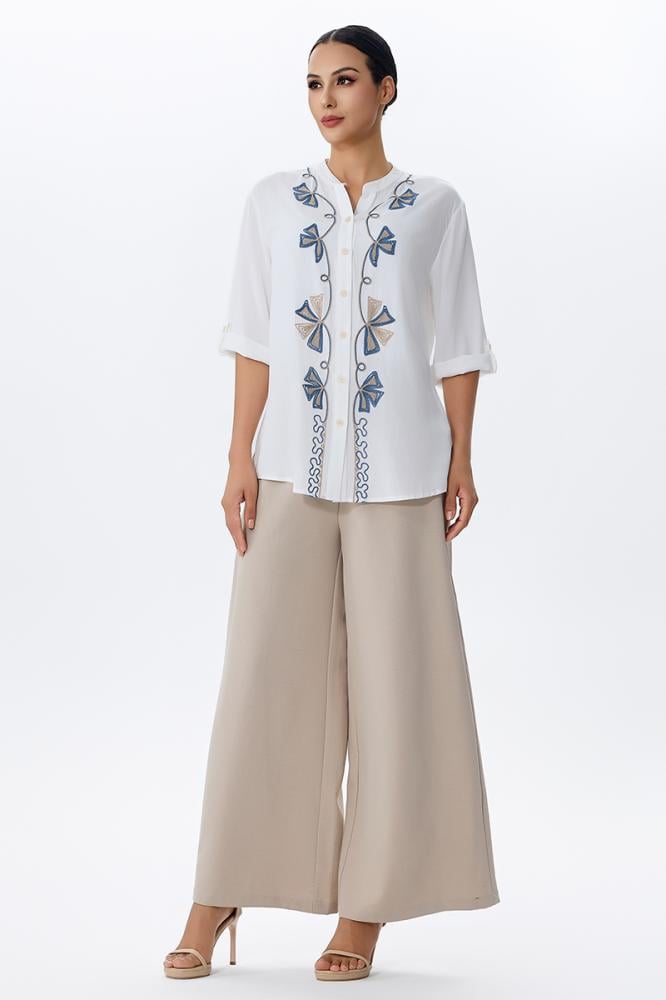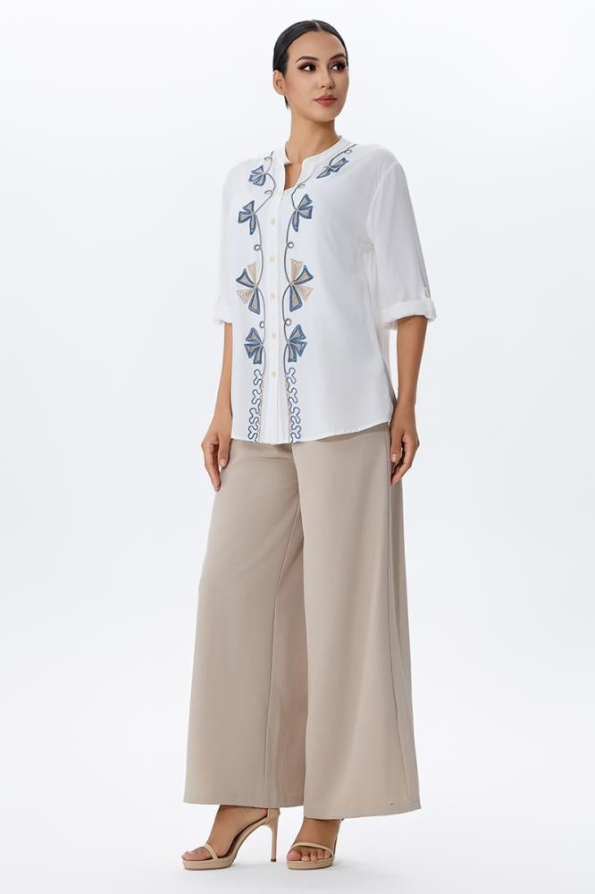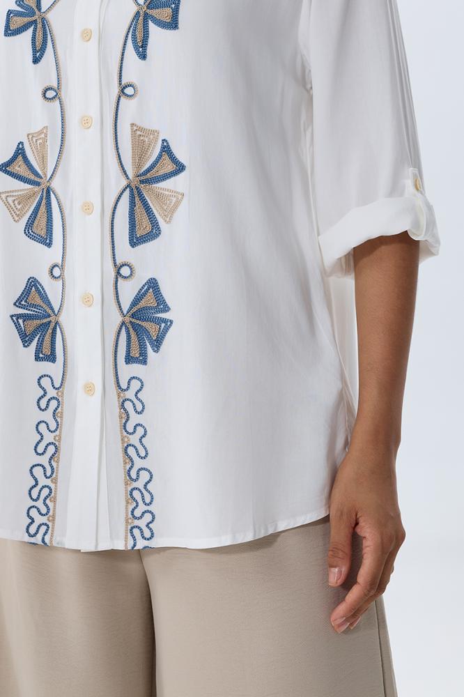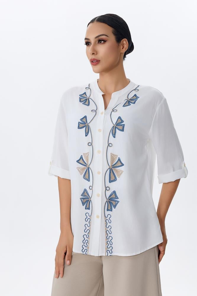 استوحي أناقتك من التفاصيل الشرقية الأصيلة مع هذه البلوزة البيضاء المزيّنة بتطريز بارز على الجانبين الأماميين. تصميم ناعم بأكمام قابلة للطي وياقة دائرية لإطلالة محتشمة وعصرية تناسب إطلالات النهار والمساء.