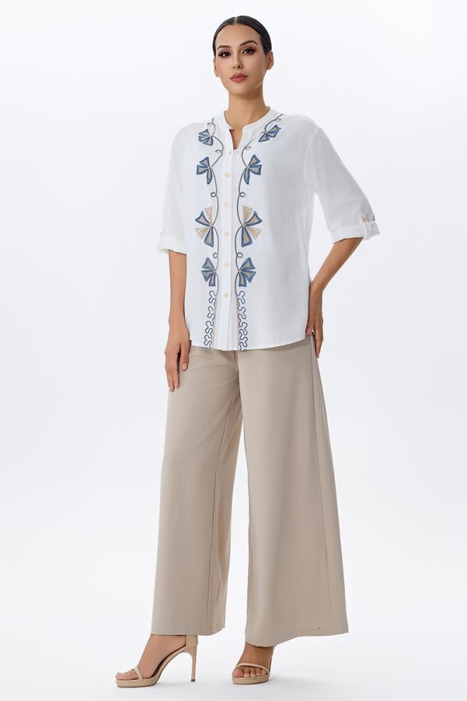 بلوزة كتان بتطريز شرقي باللونين الأزرق والبيج