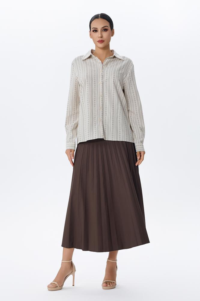 بلوزة تجمع بين الكلاسيكية والعصرية بتصميم مخطط طولي يضفي مظهرًا أنيقًا وانسيابيًا. تأتي بقصة مستقيمة وأكمام طويلة وياقة تقليدية، مما يجعلها خيارًا مثاليًا للإطلالات اليومية أو الرسمية الراقية. خامة خفيفة وناعمة تناسب مختلف المواسم.