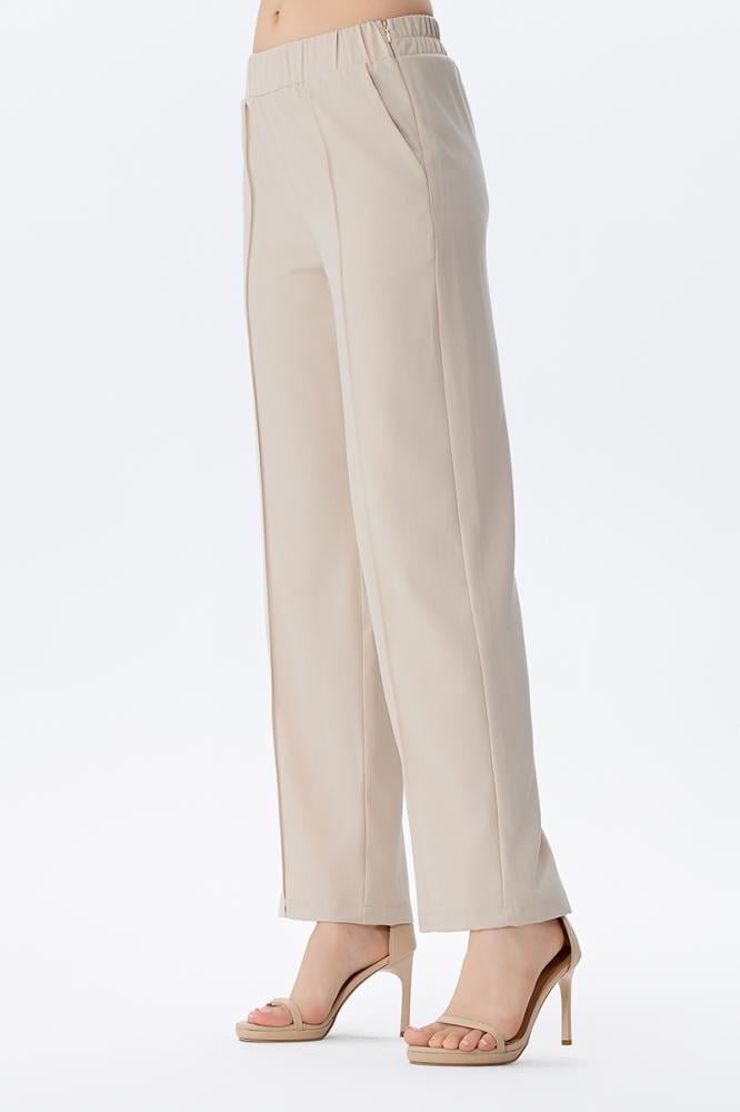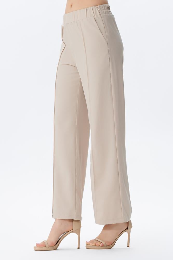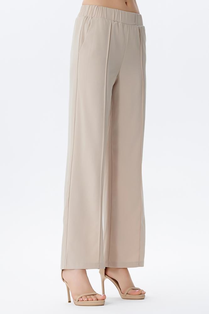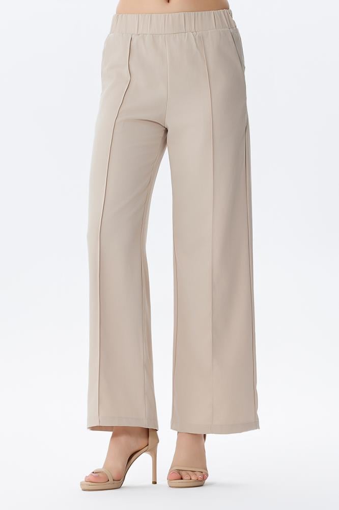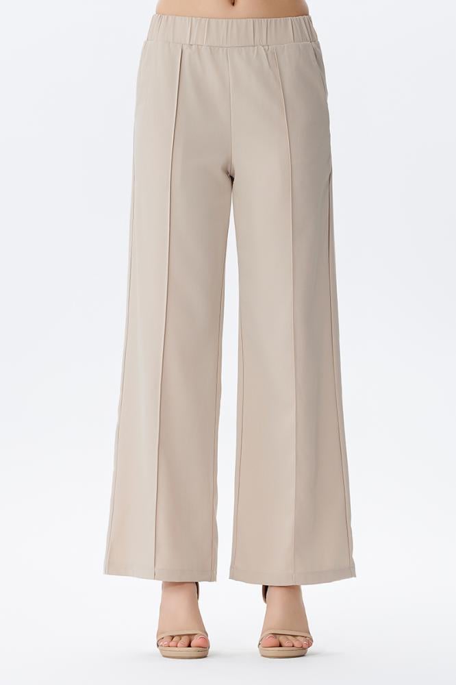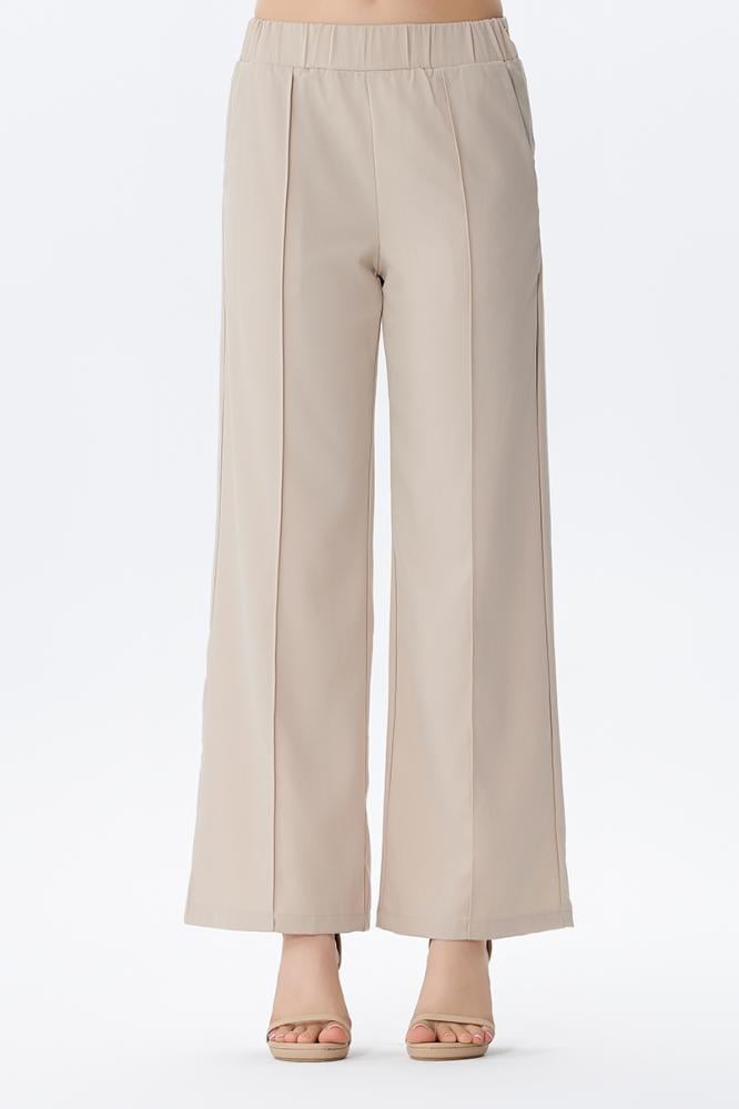 أضيفي لمسة من الرقي والراحة إلى إطلالتك مع هذا البنطلون البيج الواسع، المصمم بخطوط أمامية تضيف طابعًا أنيقًا وانسيابيًا. يتميز بقصة مستقيمة وخصر مطاطي عملي، ما يجعله خيارًا مثاليًا للإطلالات اليومية والمكتبية.
