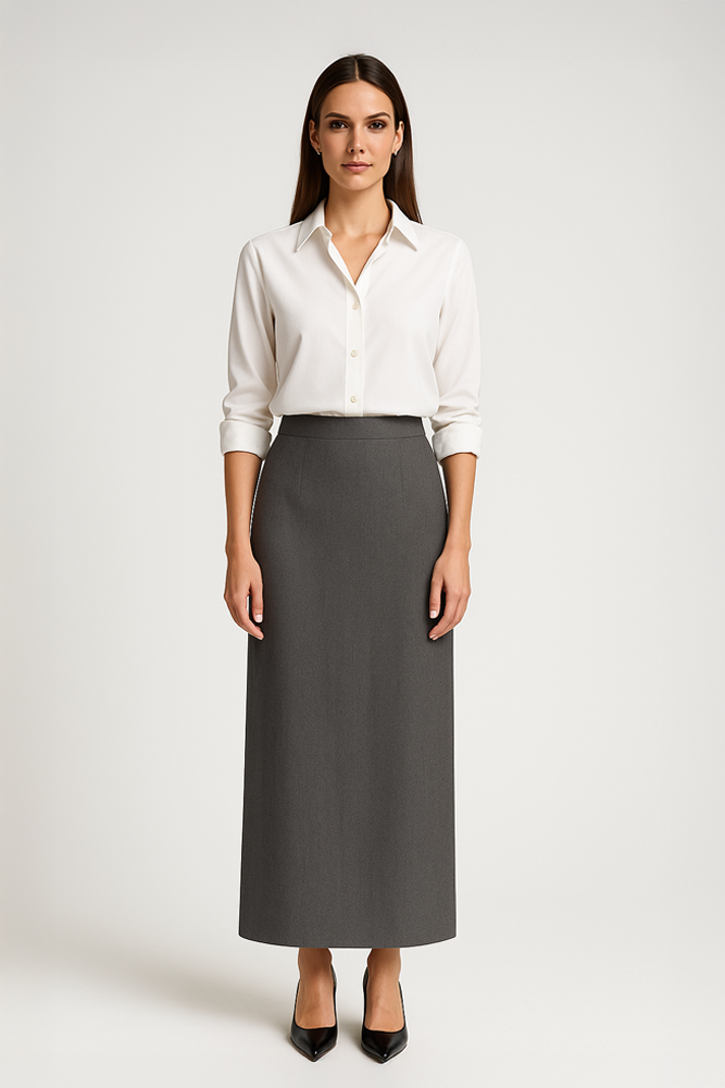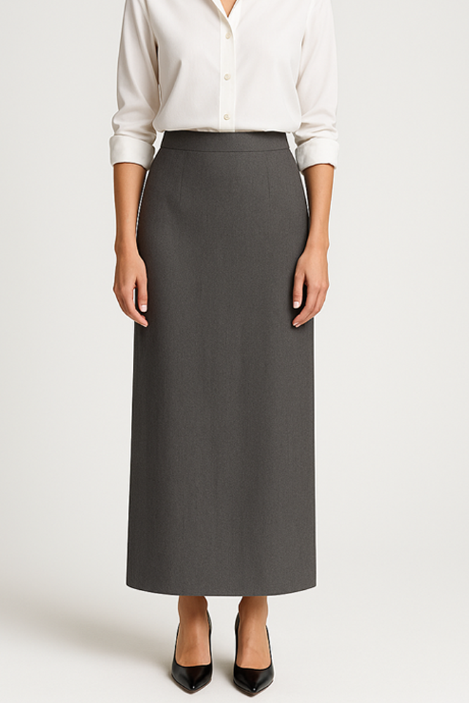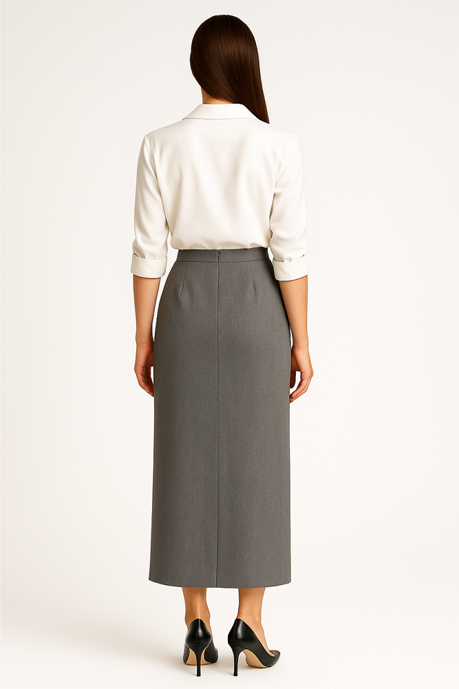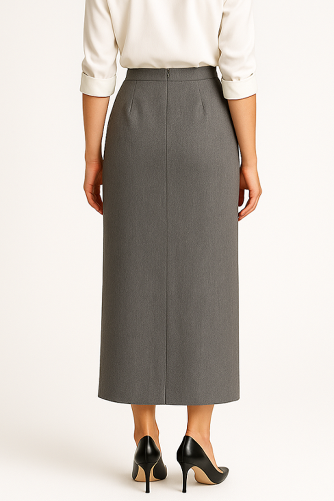 تميّزي بإطلالة أنثوية وراقية مع هذه التنورة الطويلة ذات التصميم المستقيم واللون الرمادي. مصممة بسحاب خلفي لسهولة الارتداء وفتحة خلفية تضيف لمسة من الأناقة والراحة في الحركة. قطعة أساسية لا غنى عنها لإطلالة مكتبية أو رسمية متقنة.