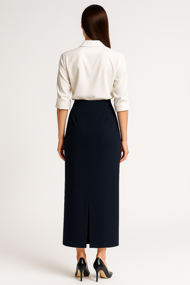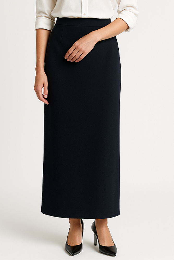 تميّزي بإطلالة أنثوية وراقية مع هذه التنورة الطويلة ذات التصميم المستقيم واللون الكحلي . مصممة بسحاب خلفي لسهولة الارتداء وفتحة خلفية تضيف لمسة من الأناقة والراحة في الحركة. قطعة أساسية لا غنى عنها لإطلالة مكتبية أو رسمية متقنة.