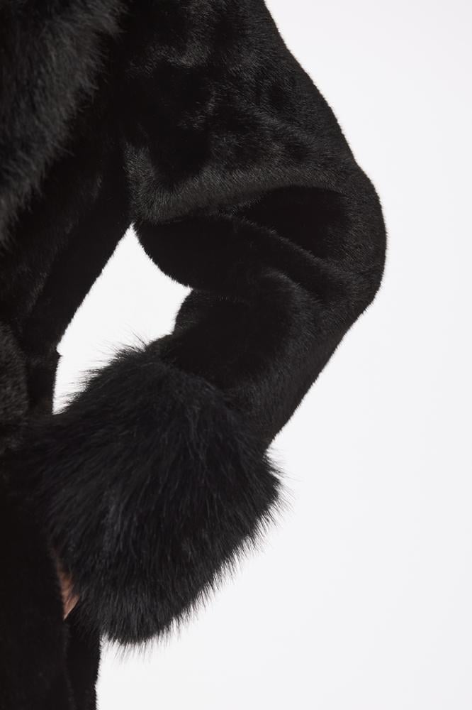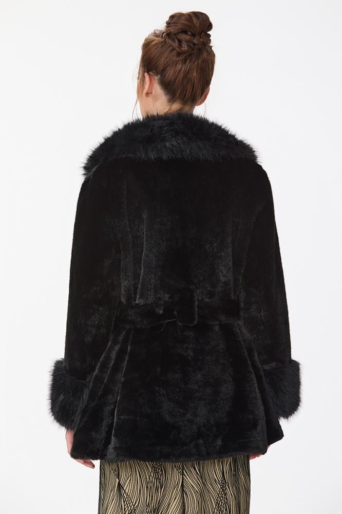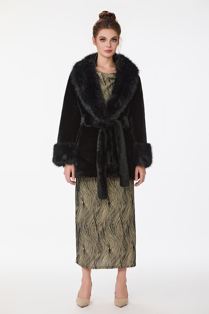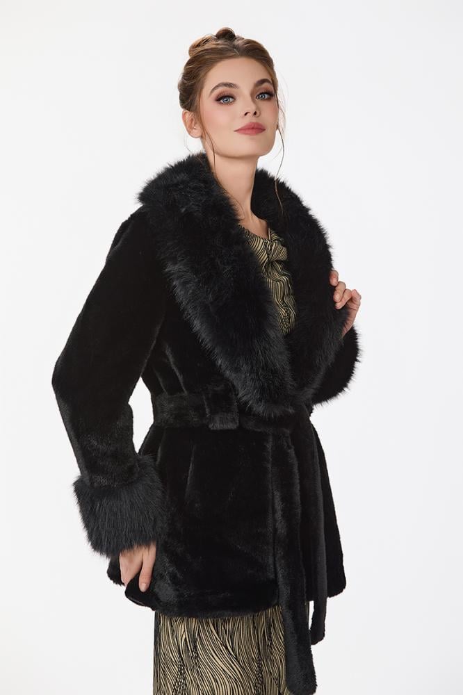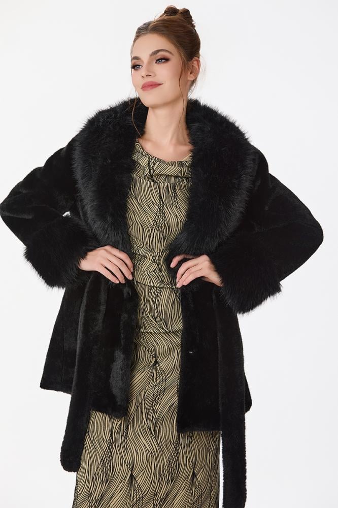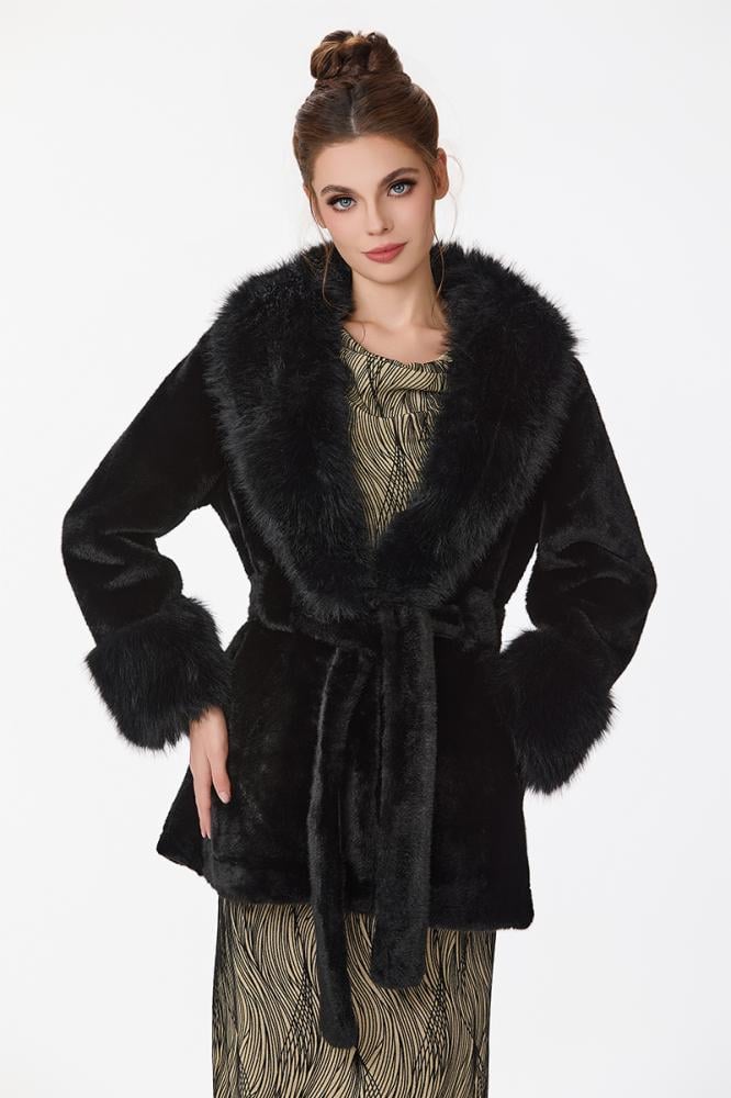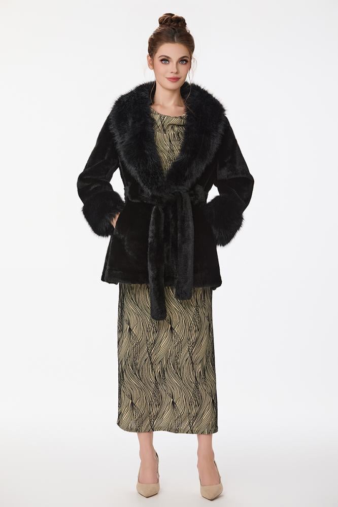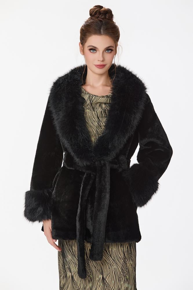 جاكيت فرو اسود بياقة عريضة وقصة كلاسيكية مع رباط على الخصر