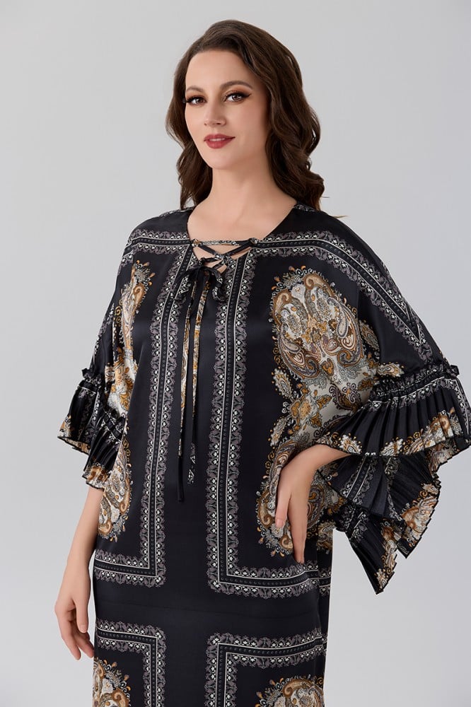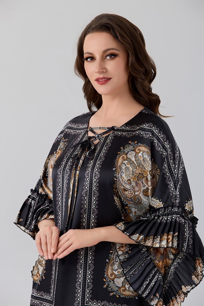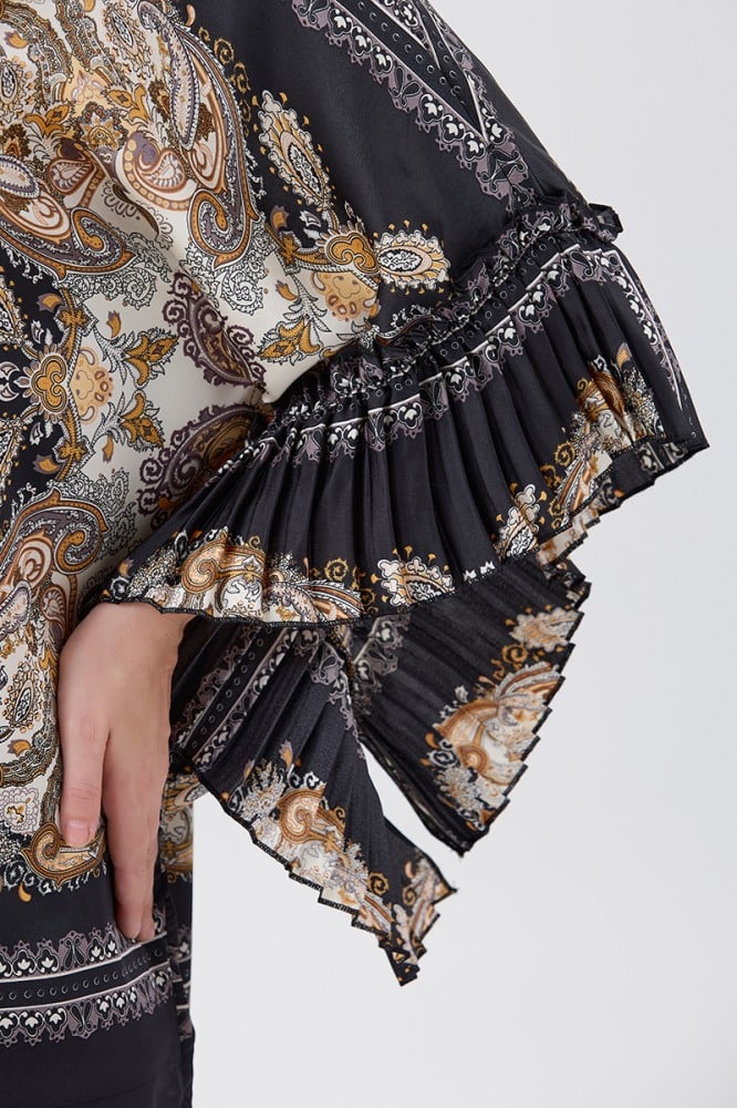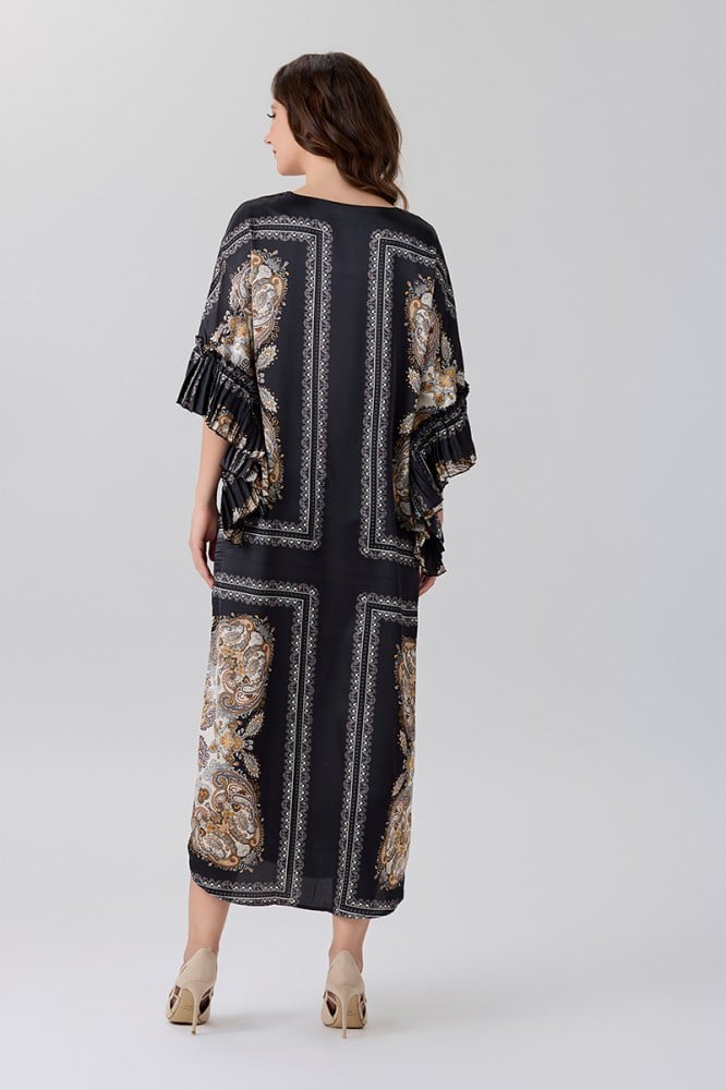 جلابية ستان لون أسود مع نقشات تقليدية بألوان ترابية مع كشكش بليسية على طرف الأكمام ياقة سبعة مع رباط