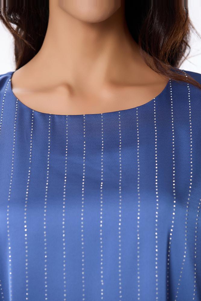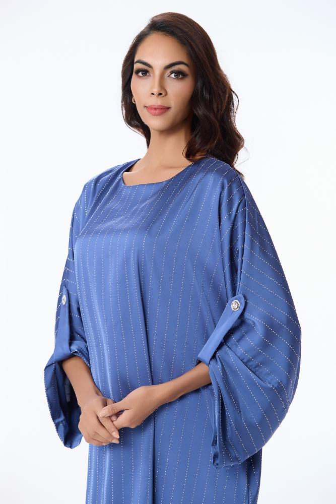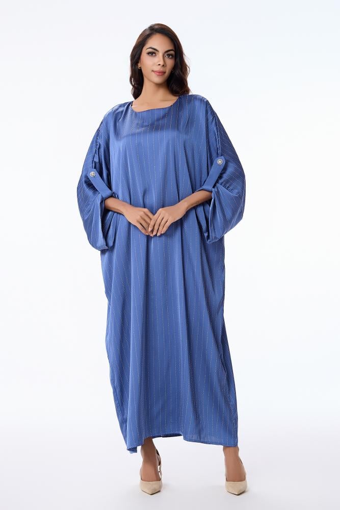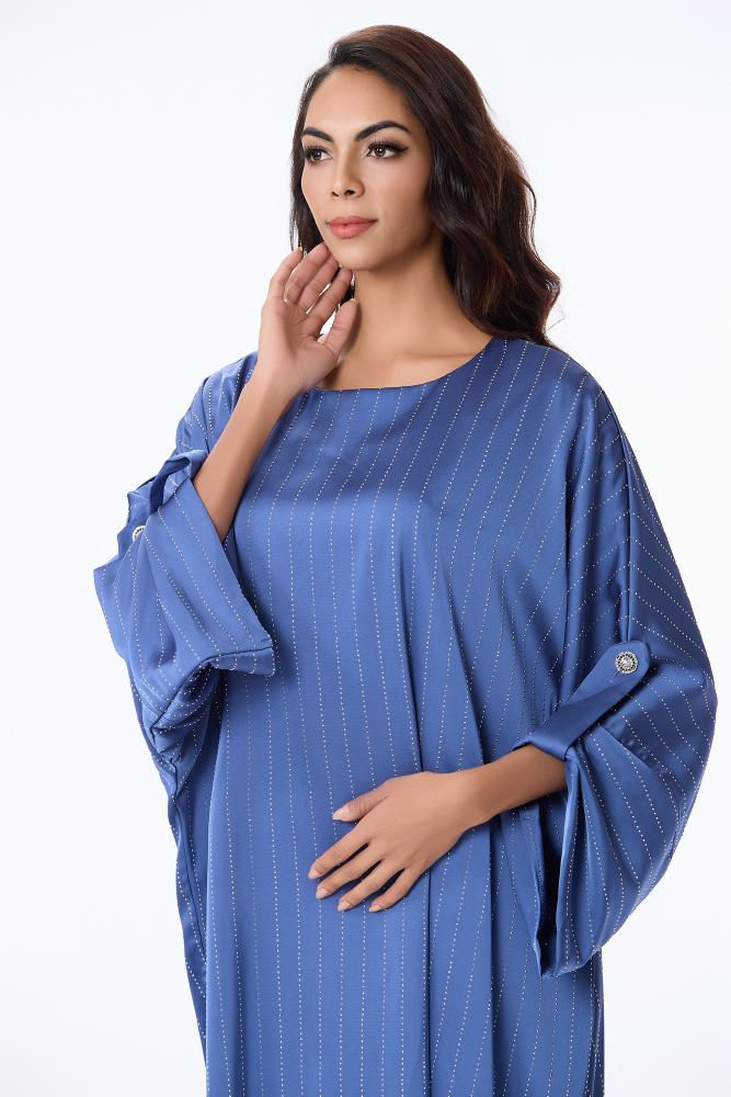 جلابية ستان ناعم كحلي بتقليم كريستال عصري بقصة فضفاضة واكمام قابلة للثني بأزرار فخمة