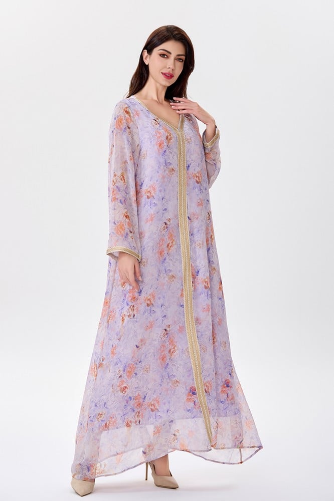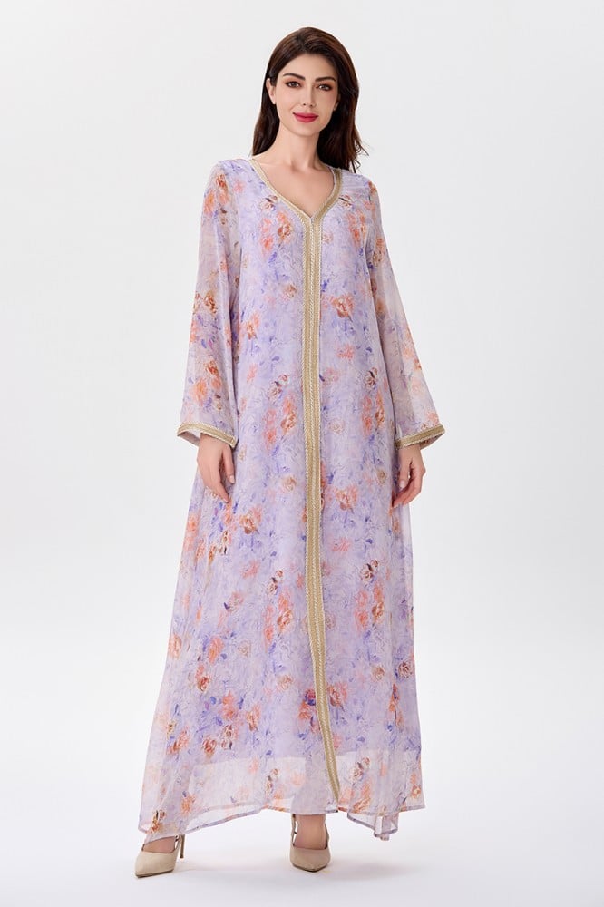 جلابية شيفون مع كلف ذهبية على الياقة ونقشة مموجة بألوان البنفشج والبرتقالي قصة كلاسيكيةالخامة شيفون : غير قابلة للتمددسماكة النسيج : خفيفةدليل المقاسات