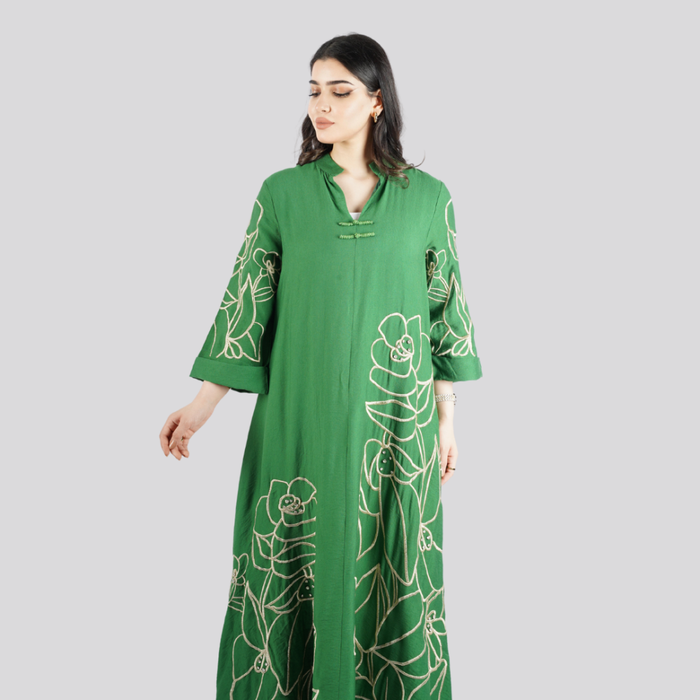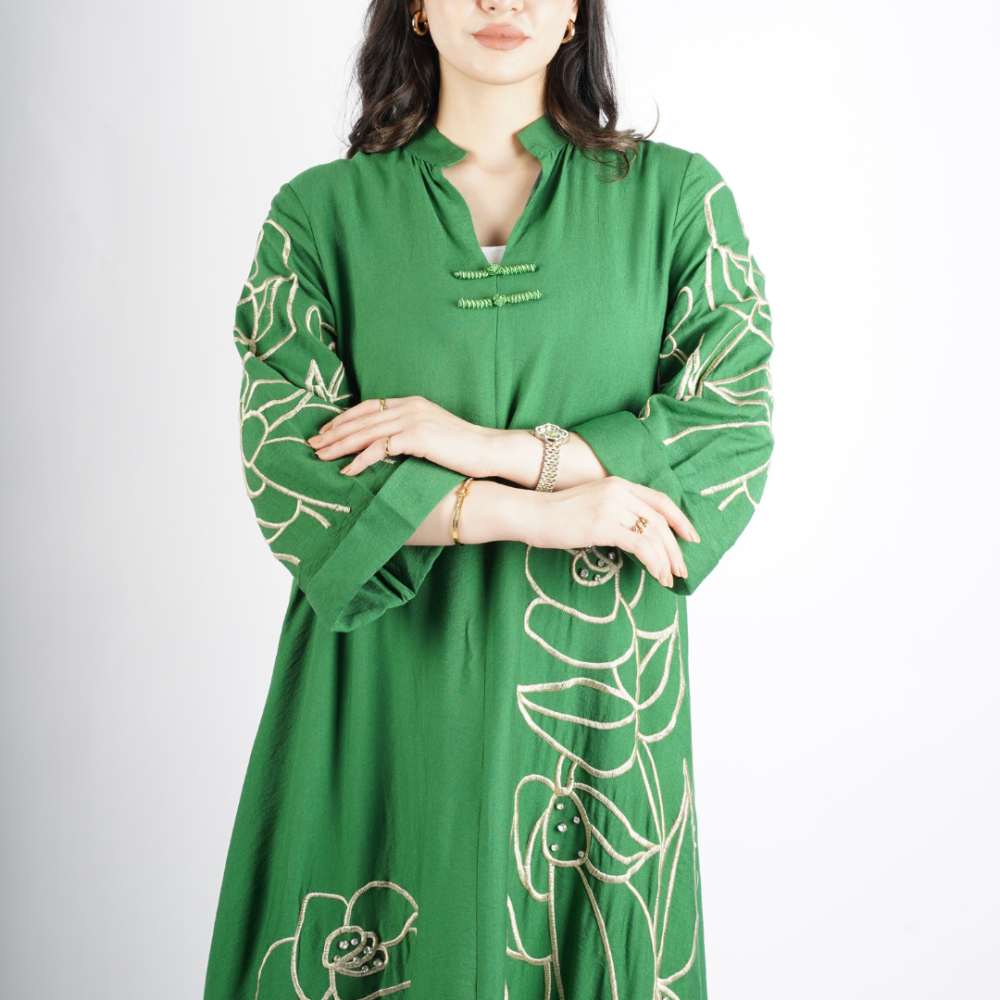جلابية كتان اخضر مع تطريز ذهبي وكريستال بارز برسمة مميزة وقصة فضفاضة مريحة