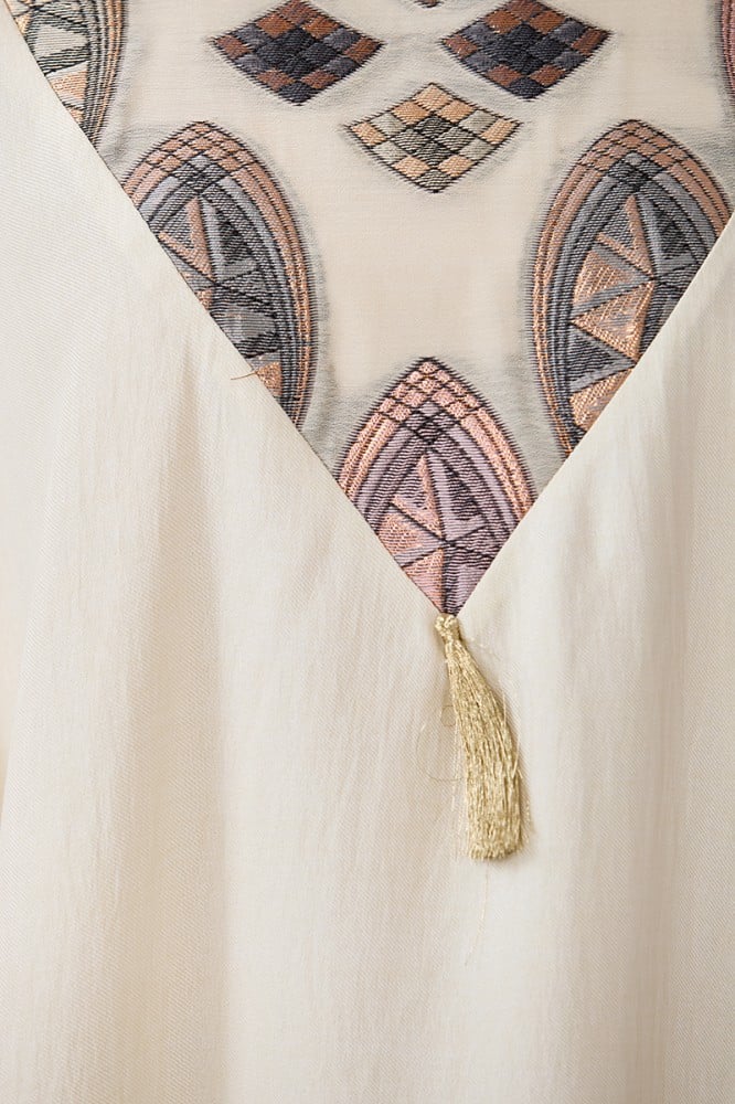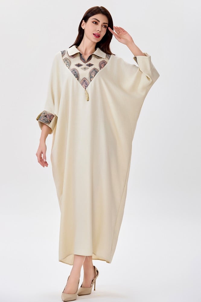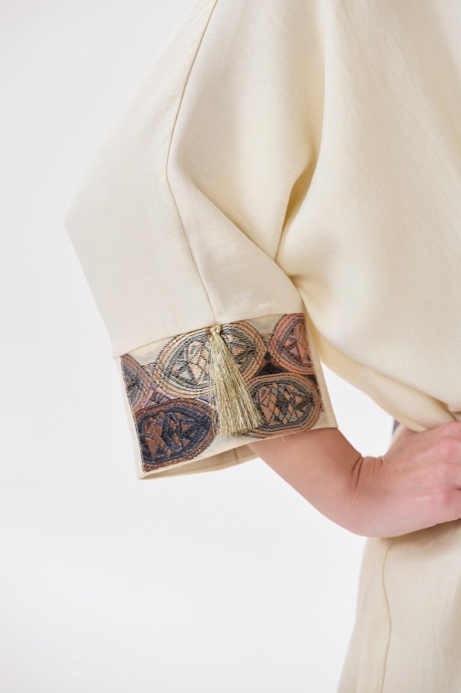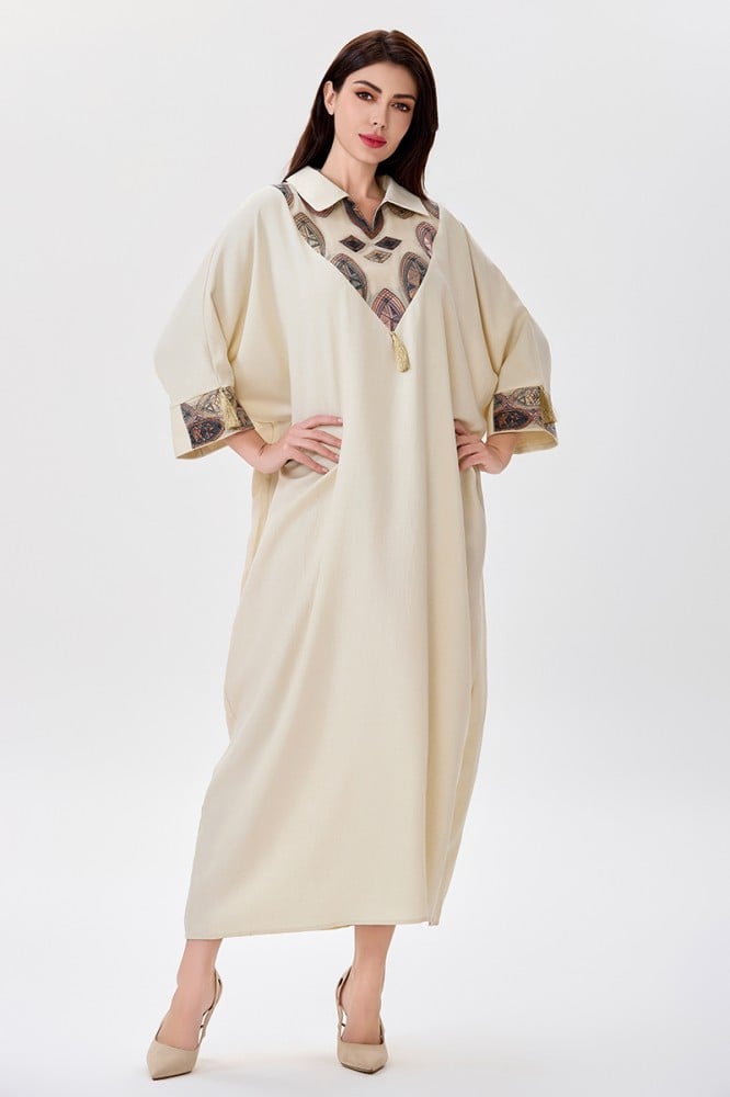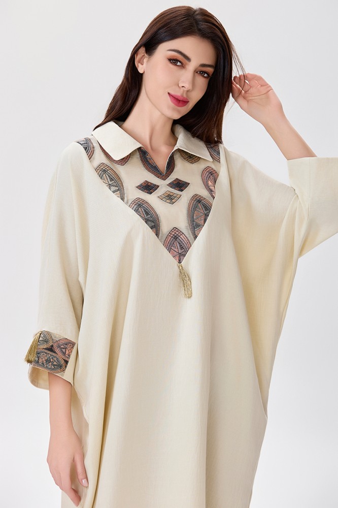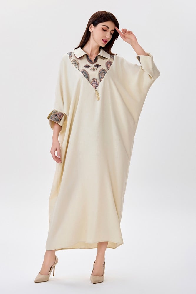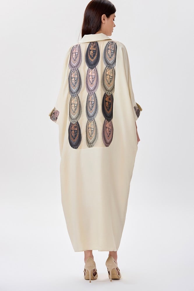 جلابية كتان بيج قصة فراشة مع ياقة كلاسيكية وتطريز بأشكال هندسية الخامة كتان : غير قابلة للتمددسماكة النسيج : خفيفة