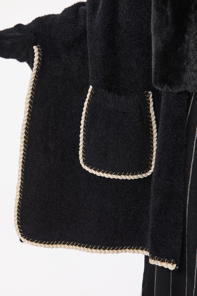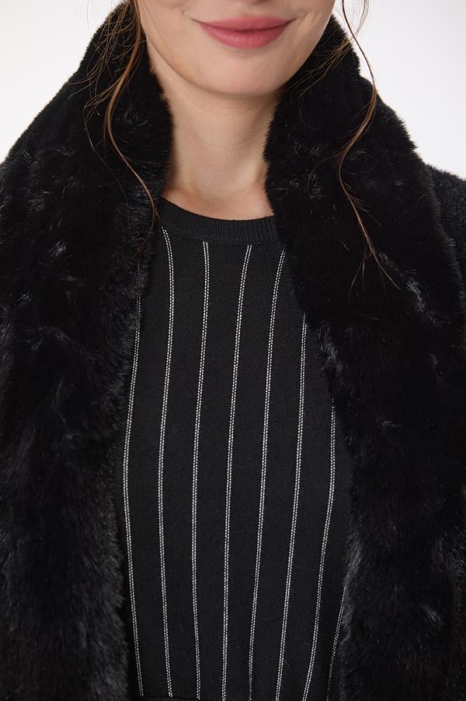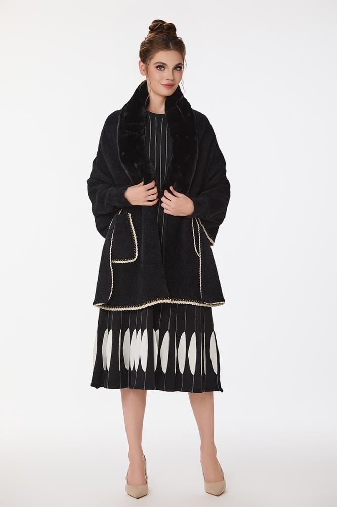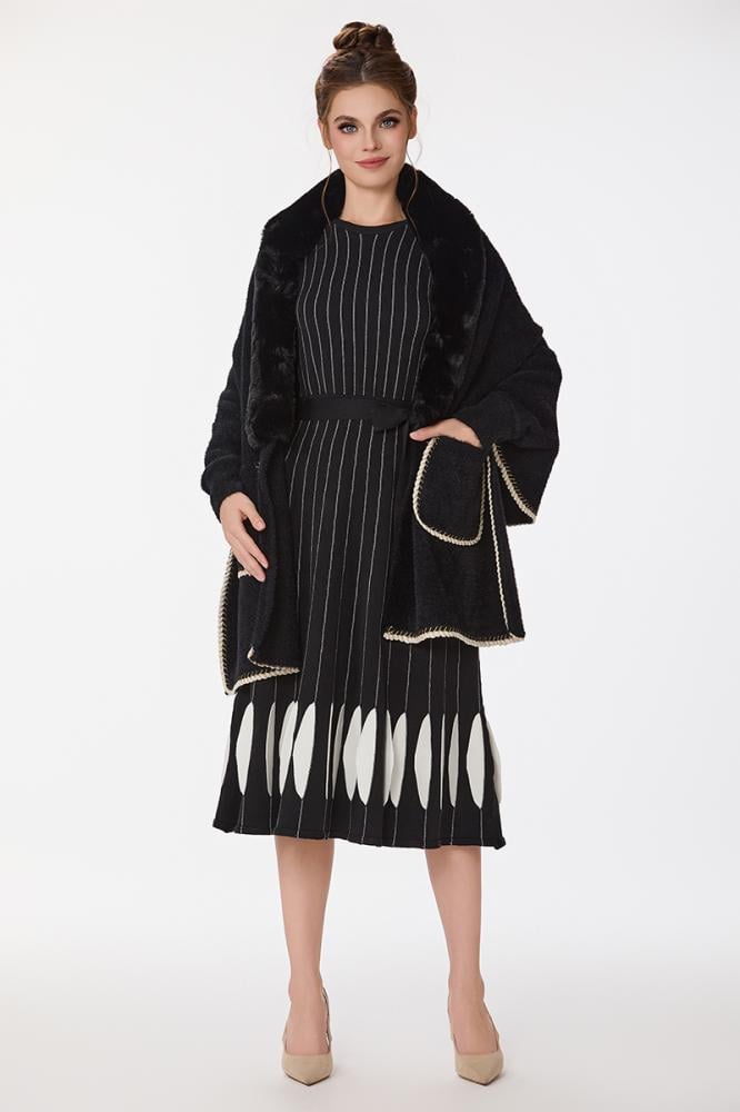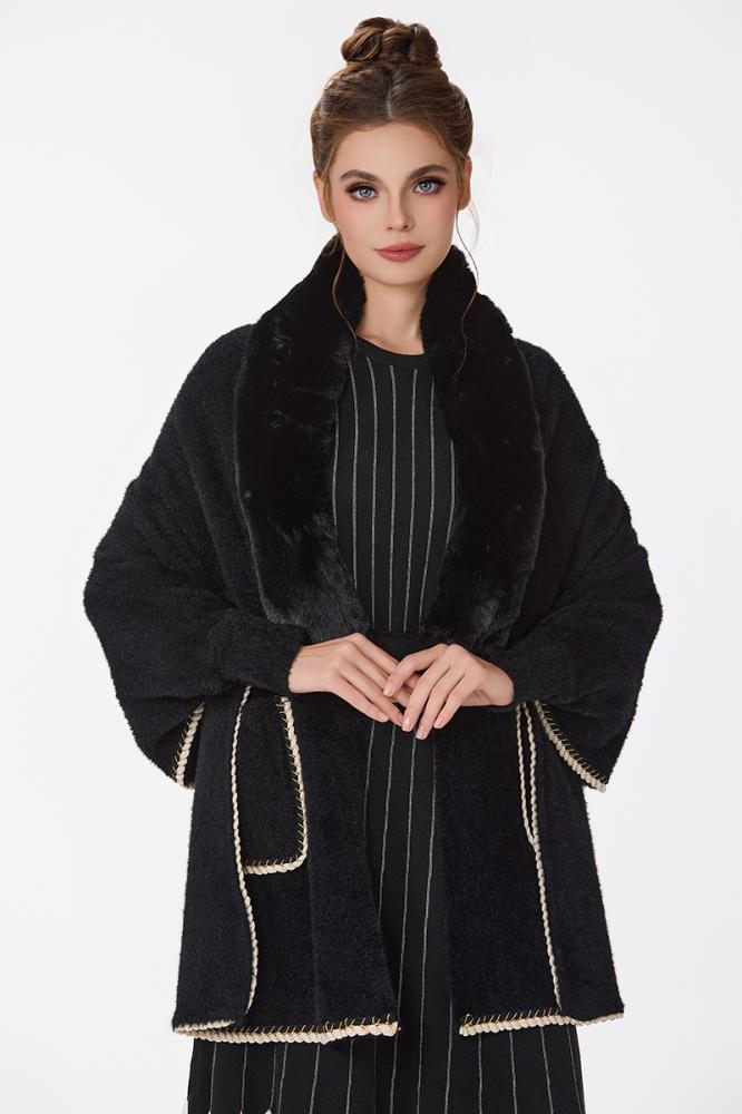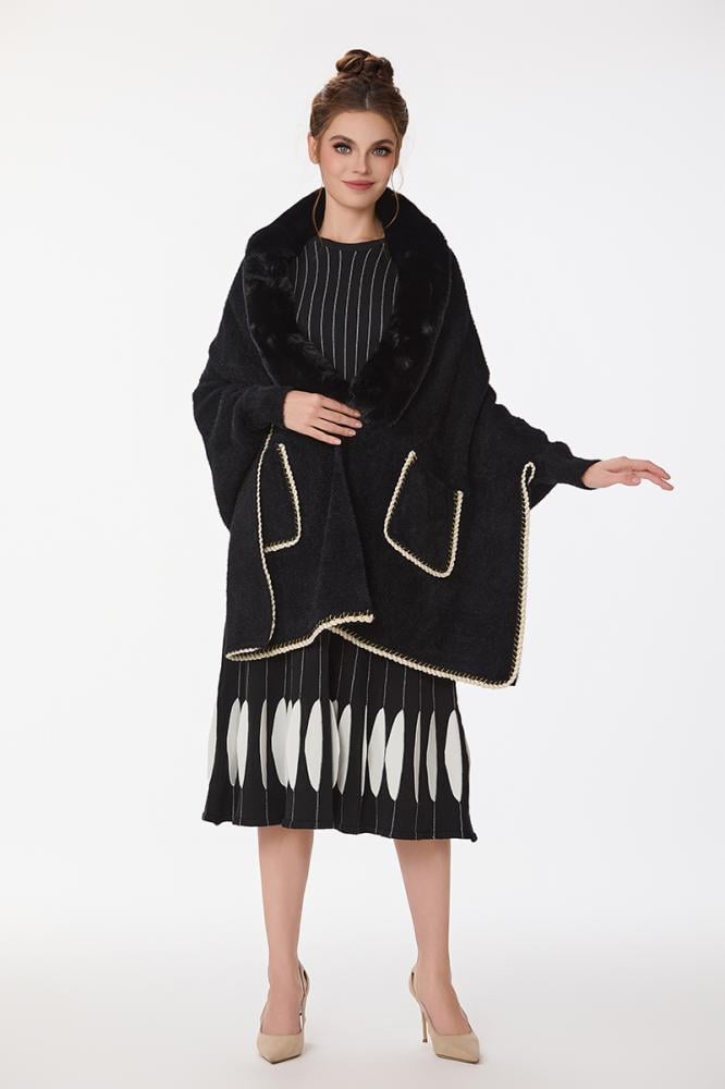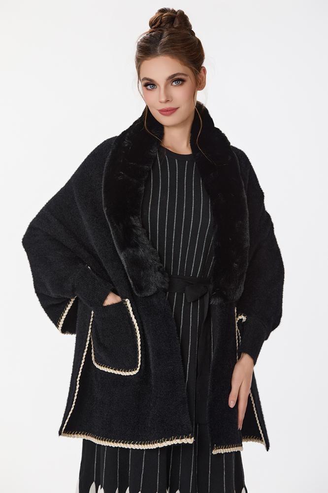 • شال عريض باكمام مع ياقة فرو لون أسود وجيوب عريضة