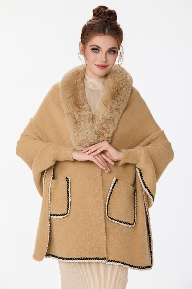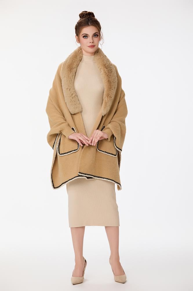 شال عريض باكمام مع ياقة فرو لون بيج وجيوب عريضة