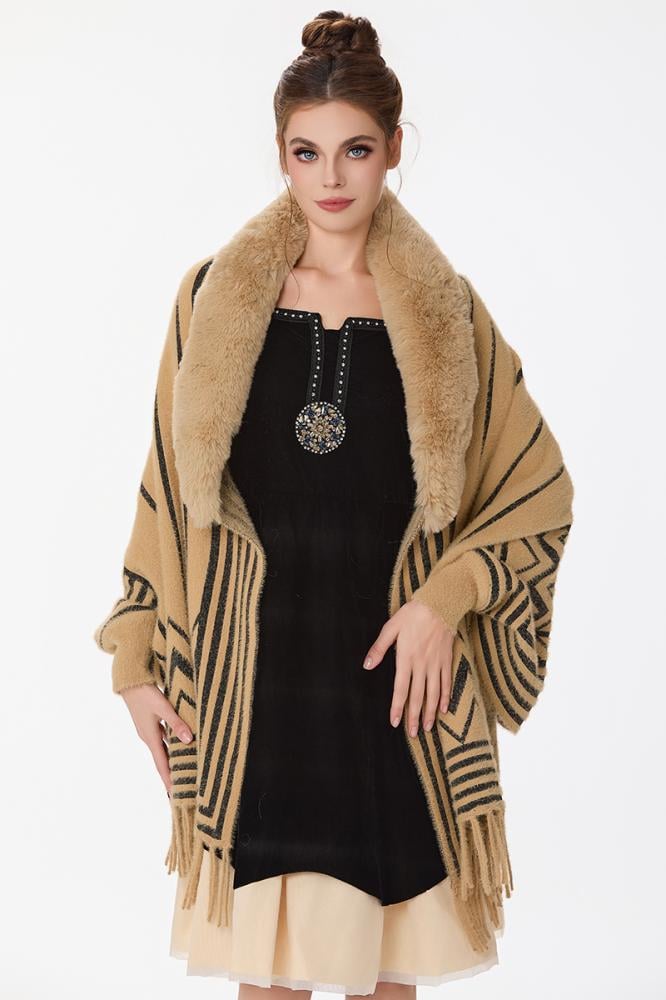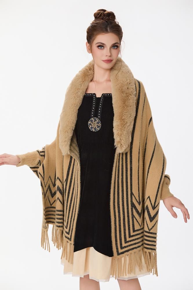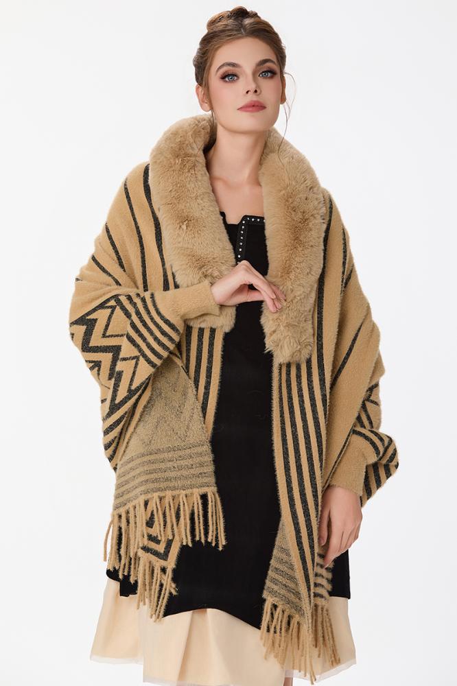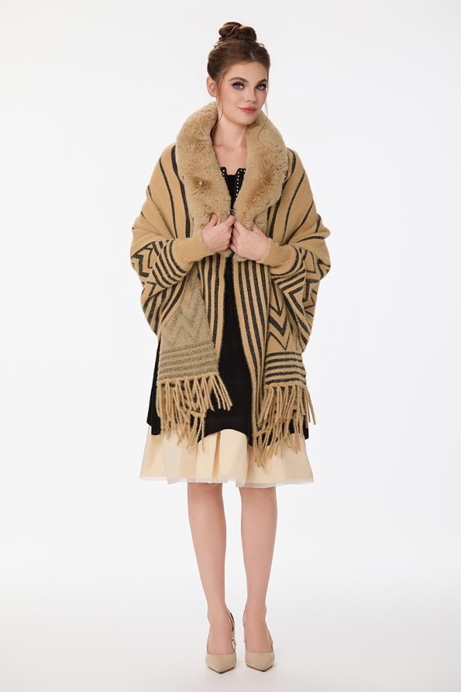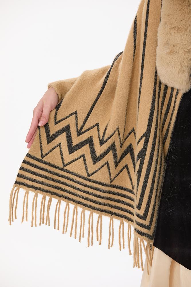 شال مع فرو بنقشة بيج واسود مع هدب على الاطراف