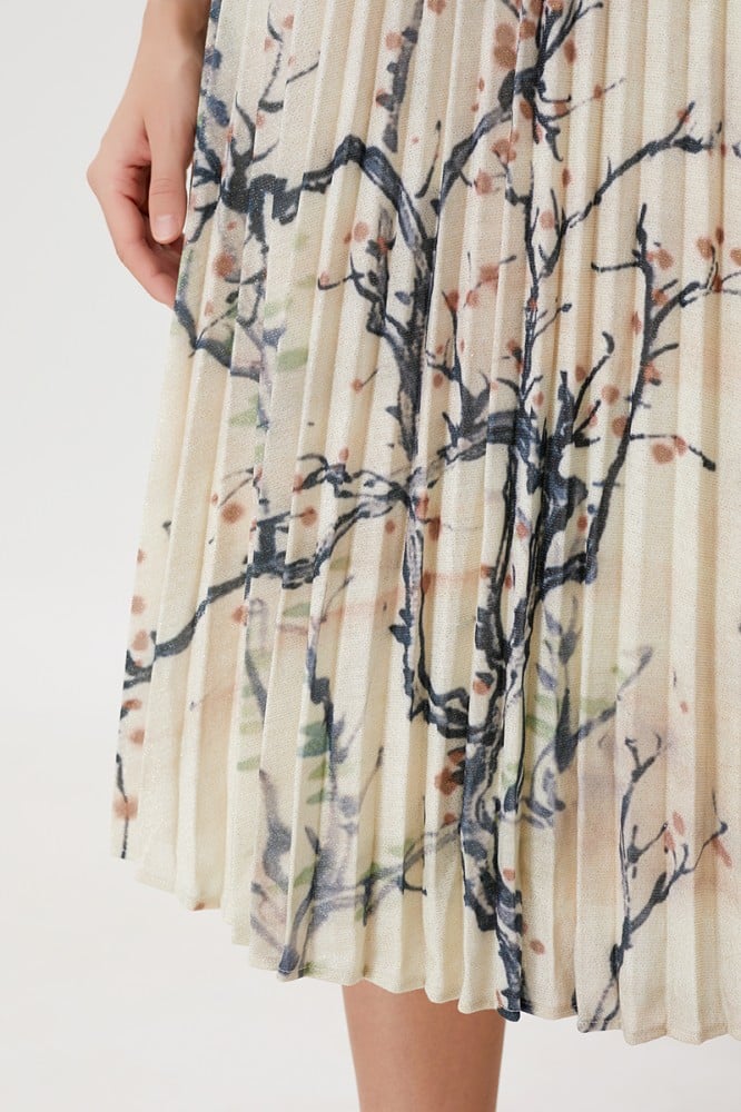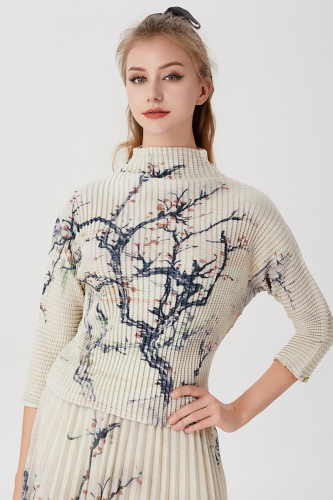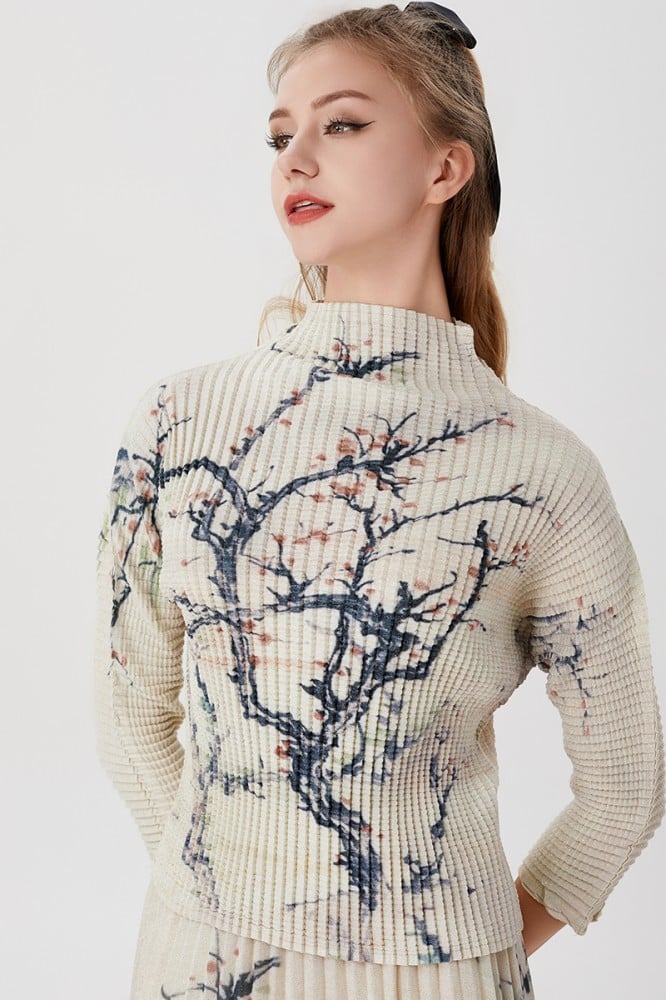 بلوزة لوريكس بليسية ليكرا ياقة بنقشة مميزة بألوان البيج والكحلي
