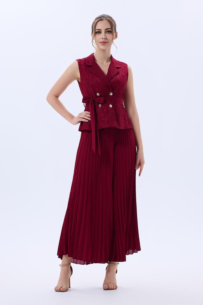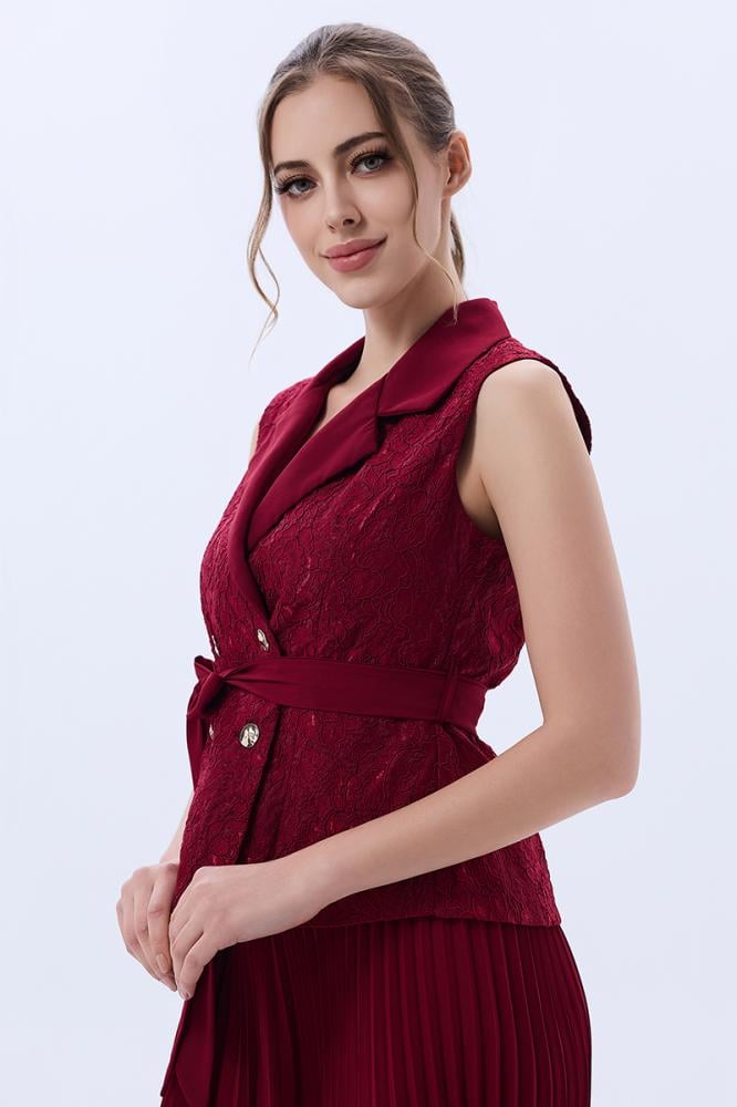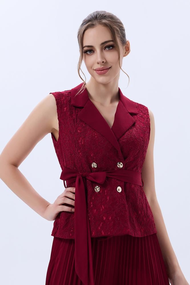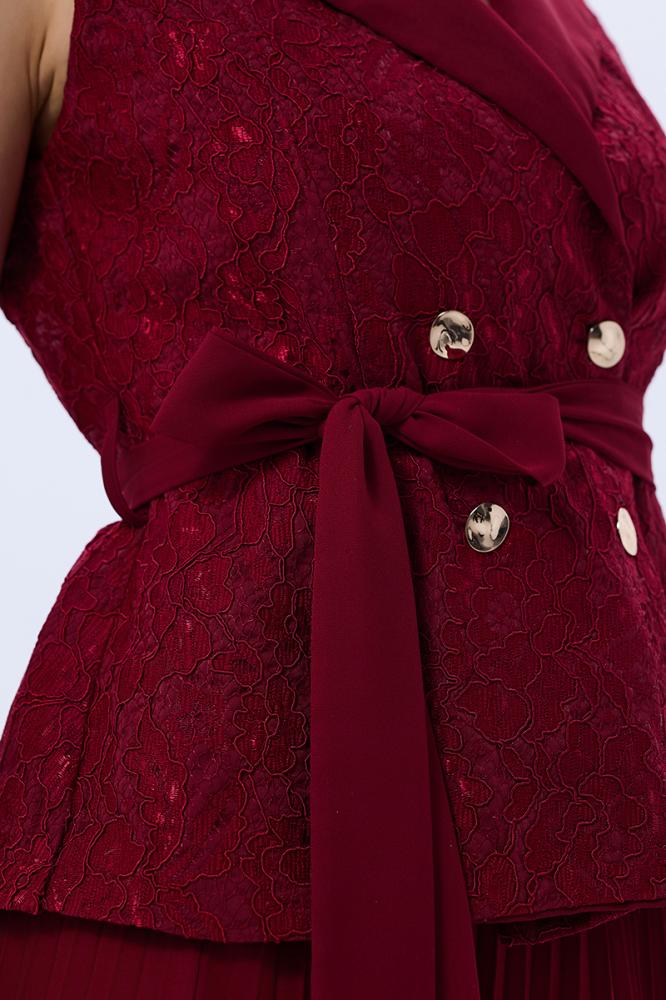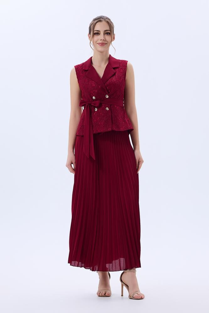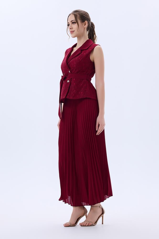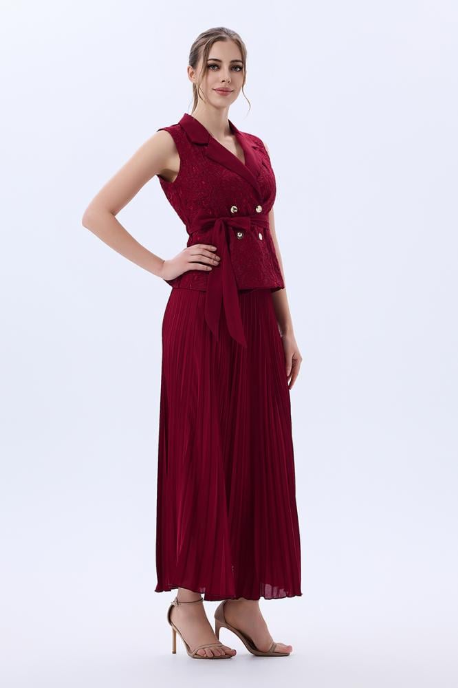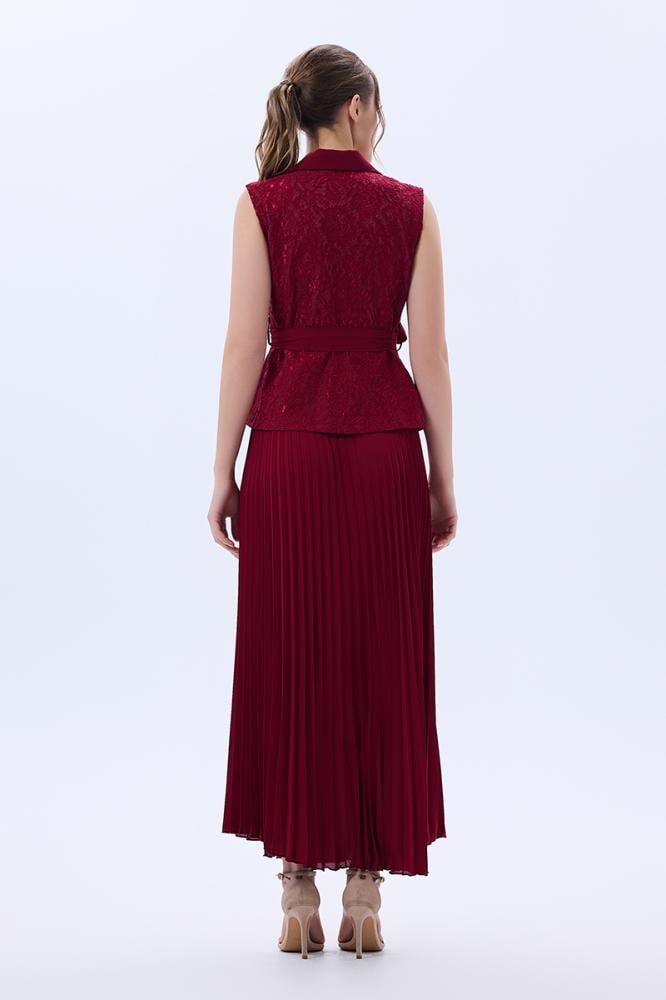 طقم نسائي عنابي مؤلف من جاكيت دانتيل من دون اكمام بقصة مزدوجة مع رباط على الخصر ومن تنورة كلوش بليسيه