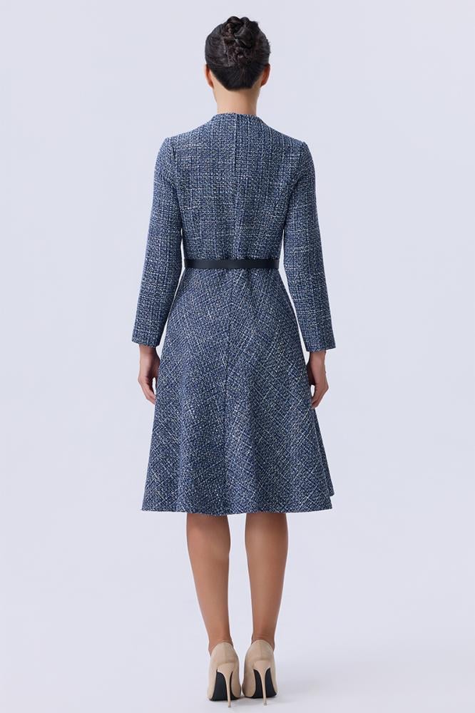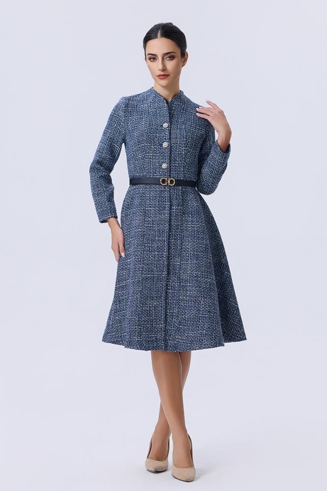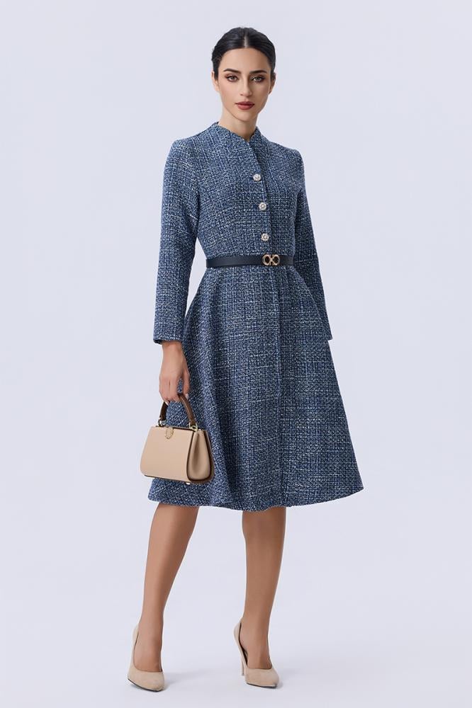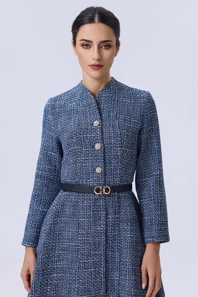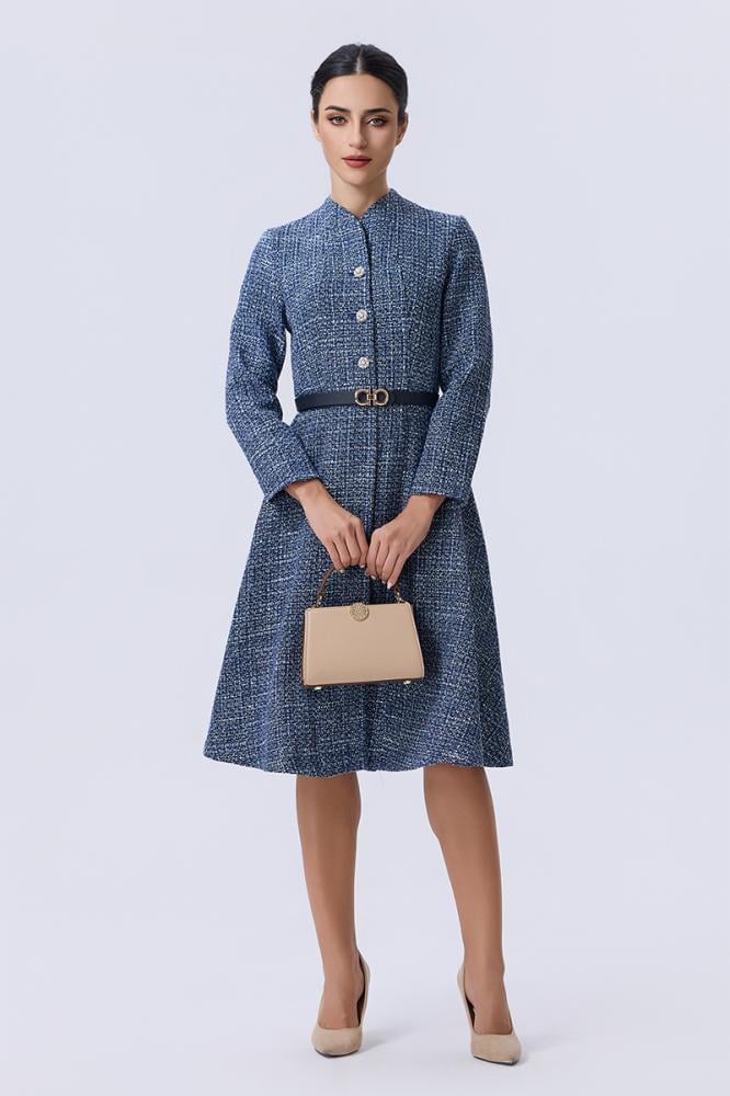 فستان أزرق فاخر بتصميم مستوحى من الأناقة الكلاسيكية العصرية، يجمع بين الرقي والبساطة في إطلالة واحدة. مصنوع من قماش التويد الراقي الذي يمنح الفستان ملمسًا فخمًا ومظهرًا راقياً. يتميز بياقة دائرية وأزرار أمامية أنيقة مع حزام خصر يحدد القوام برقة. خيار مثالي لإطلالات العمل أو المناسبات النهارية الأنيقة.