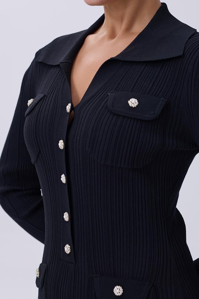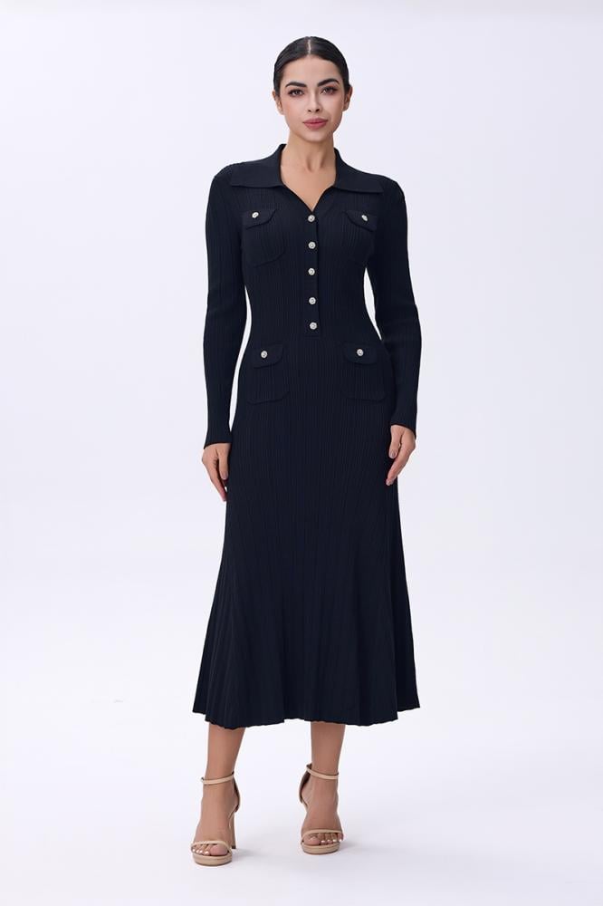 فستان أسود أنيق بقصة أنثوية ناعمة تمنحك مظهراً راقياً ومريحاً في آنٍ واحد. يتميز بخامة استرتش مرنة تنسدل بسلاسة على الجسم لتبرز القوام بأناقة، مع أزرار أمامية مزدوجة تضيف لمسة كلاسيكية جذابة. تصميم الأكمام الطويلة والطول المتوسط يجعله خياراً مثالياً للإطلالات اليومية أو المناسبات الهادئة.