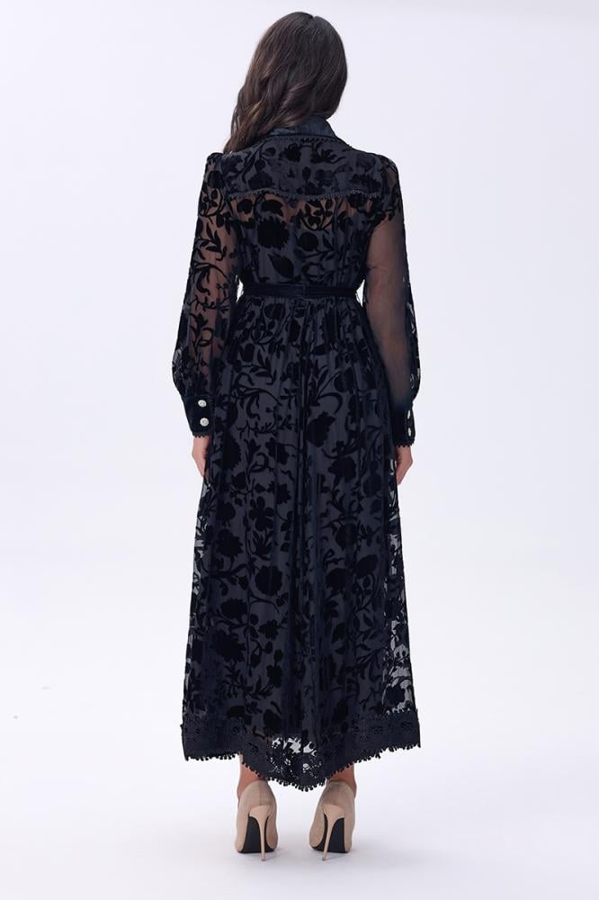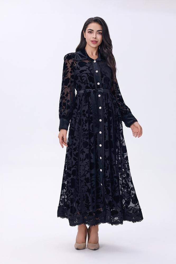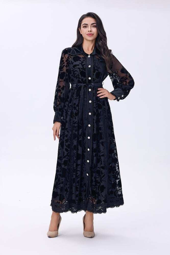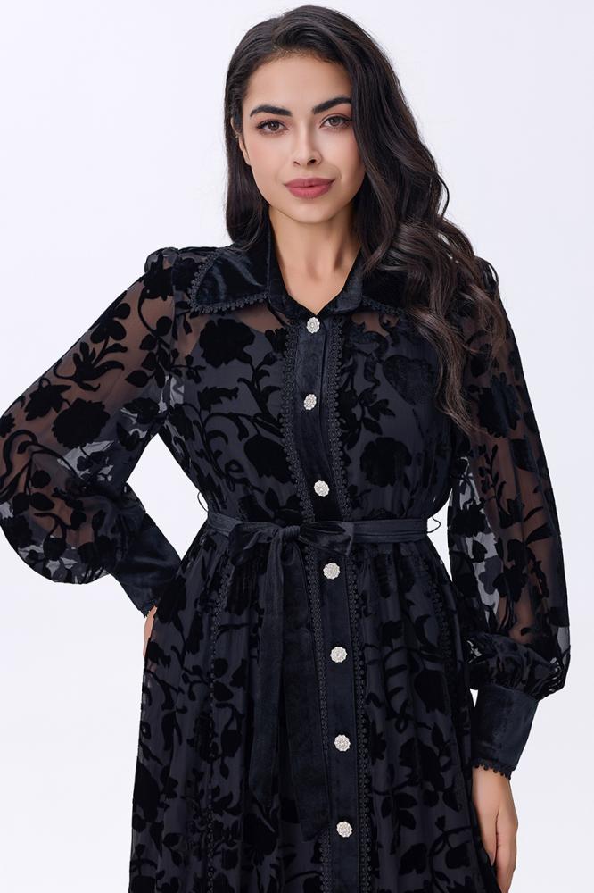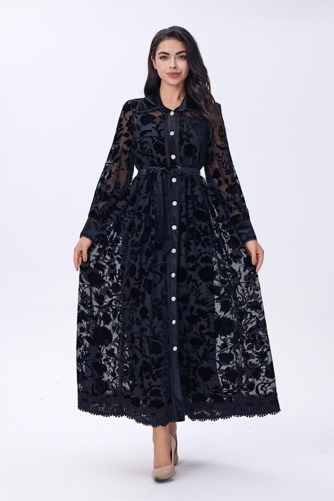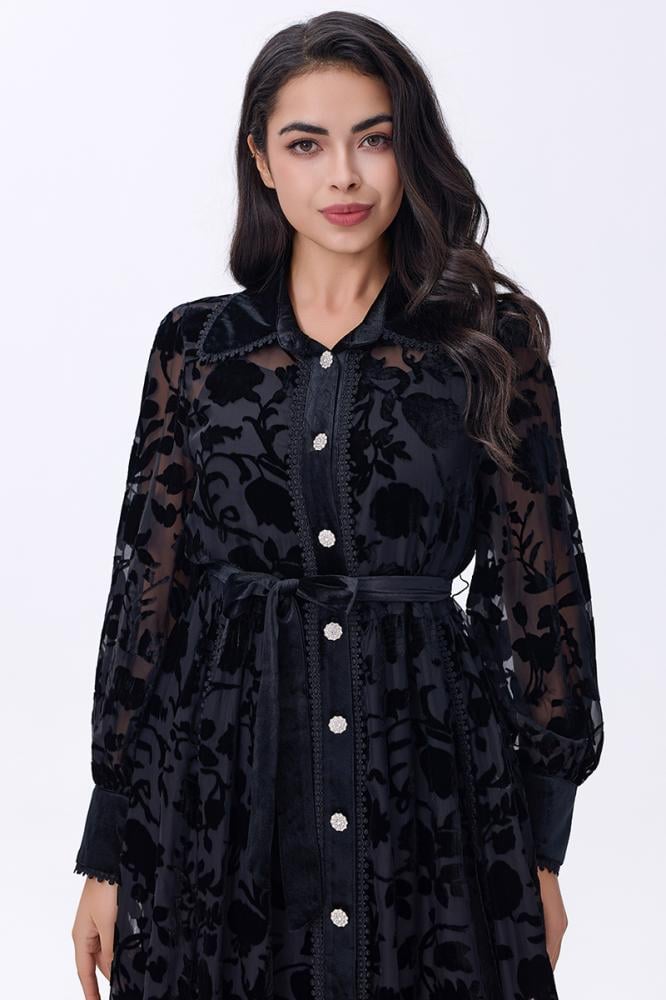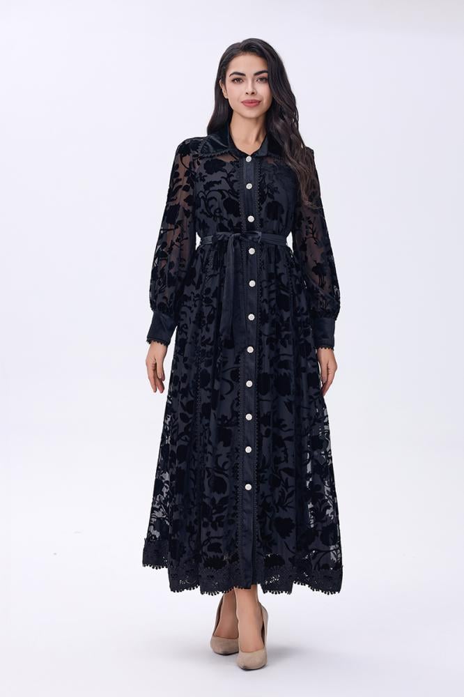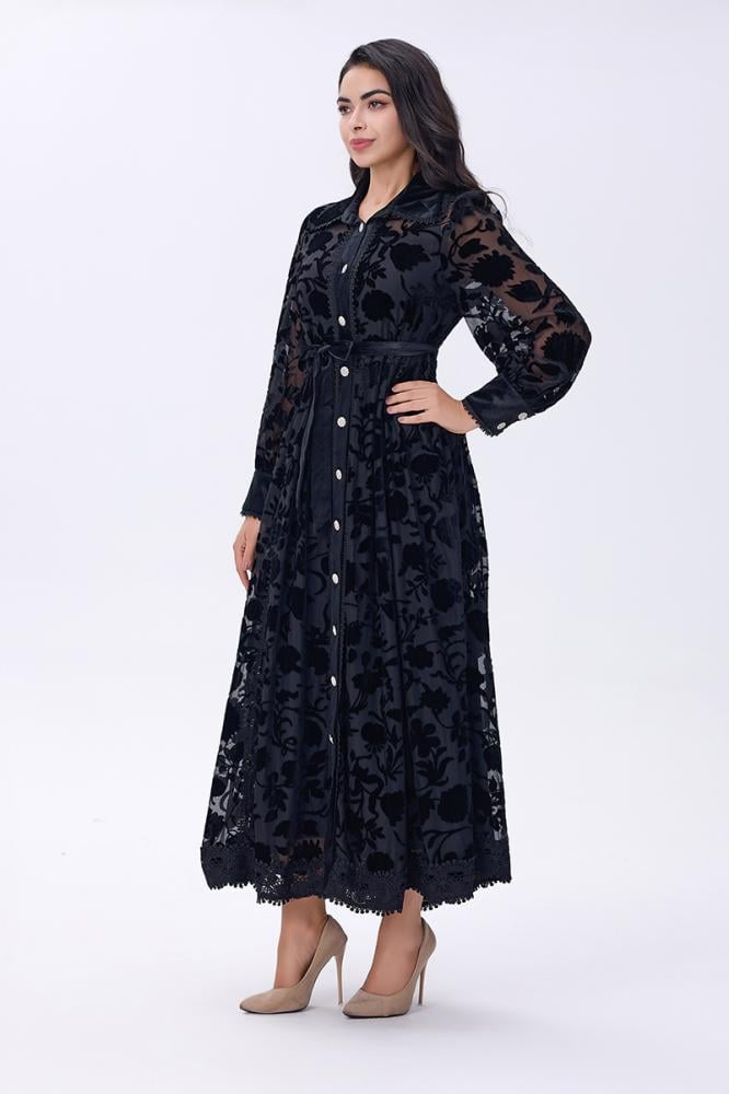 فستان أسود فاخر يجمع بين الأناقة الكلاسيكية والتفاصيل العصرية، بتصميم دانتيل ناعم وأزرار أمامية تضفي لمسة أنثوية راقية. يتميز بقصة متوسطة الطول وأكمام شفافة أنيقة مع حزام خصر يبرز جمال القوام ويمنح إطلالة متناسقة. خيار مثالي للمناسبات المسائية أو العشاءات الراقية.