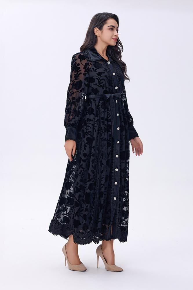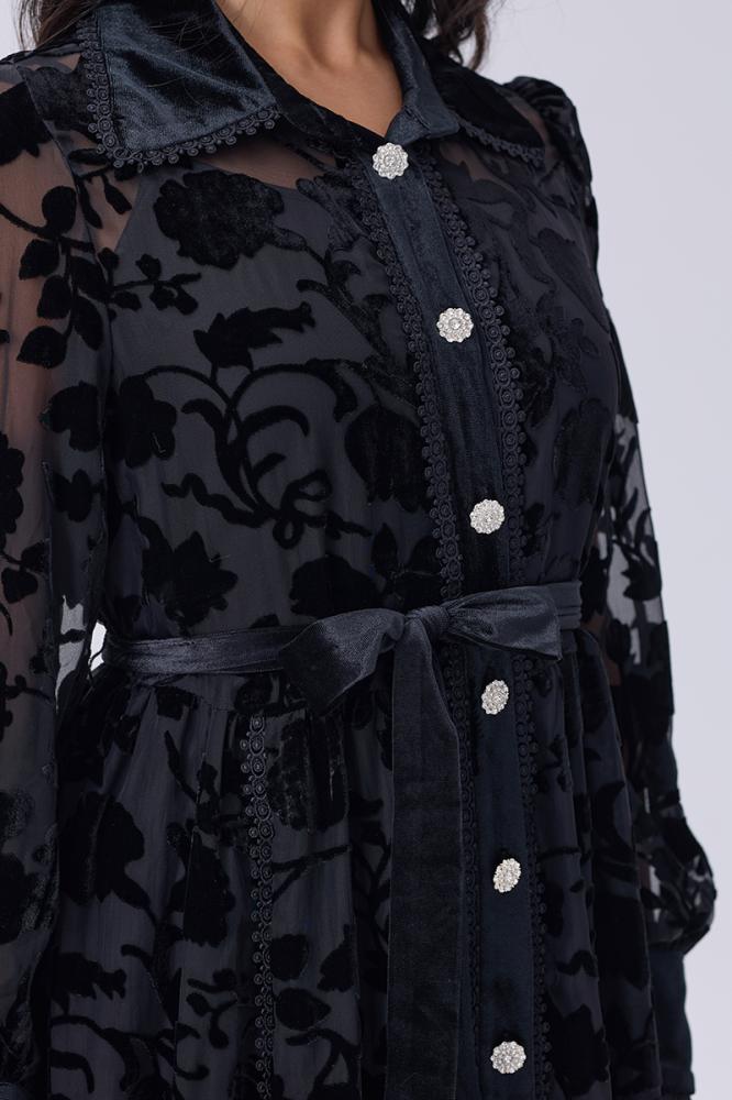 فستان أسود دانتيل بأزرار أمامية وحزام خصر