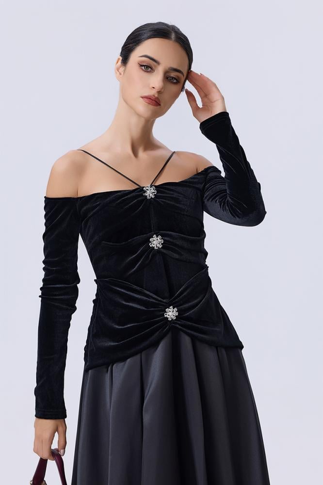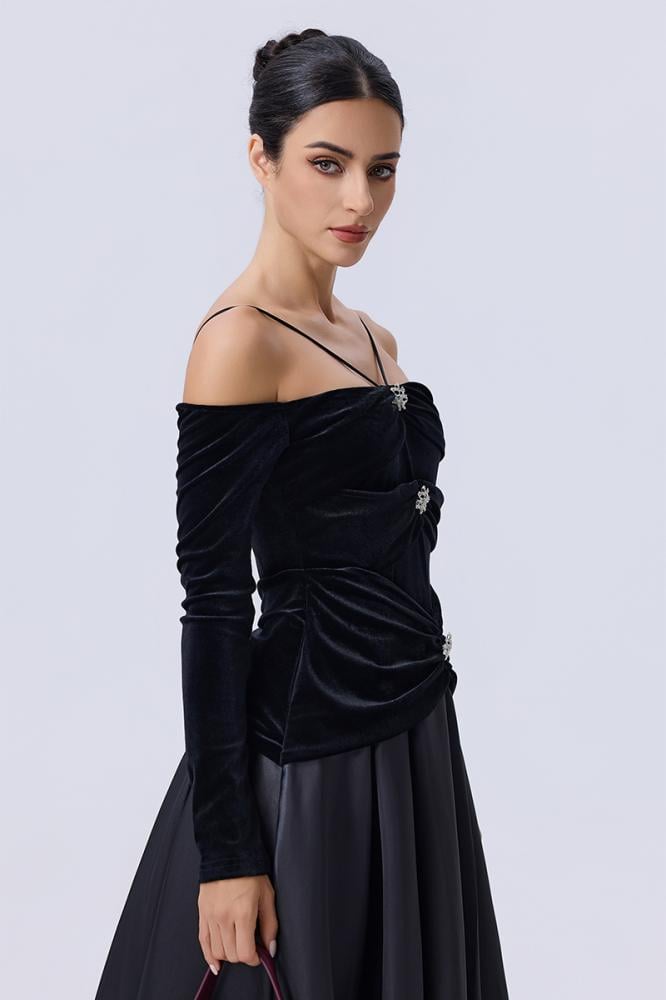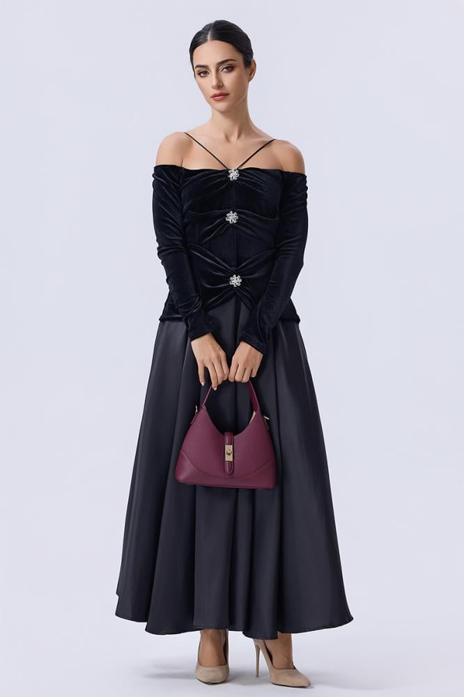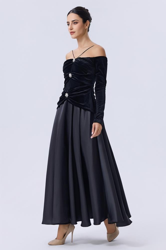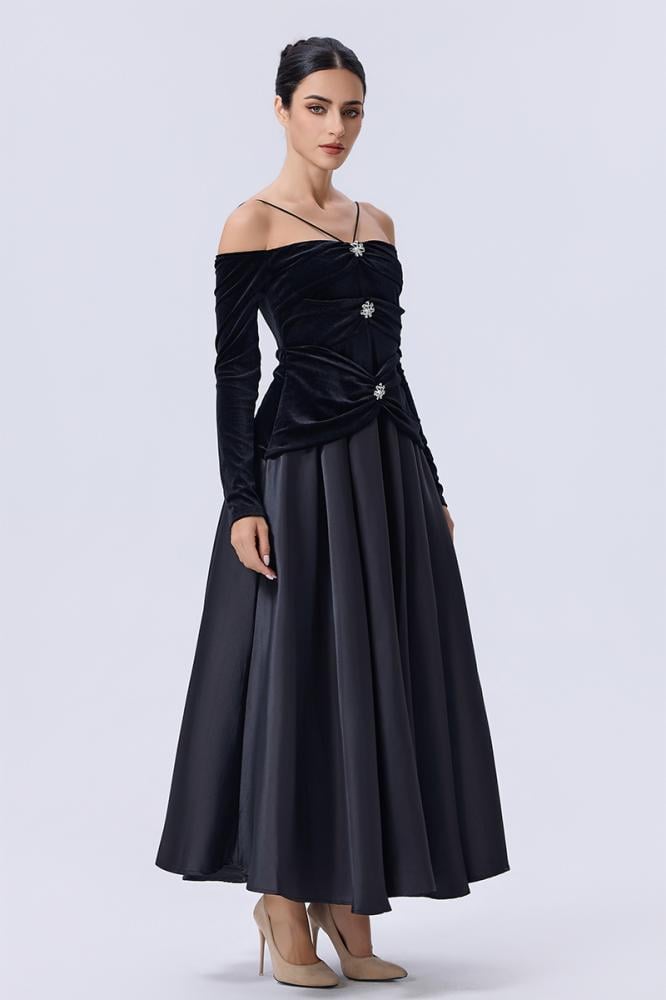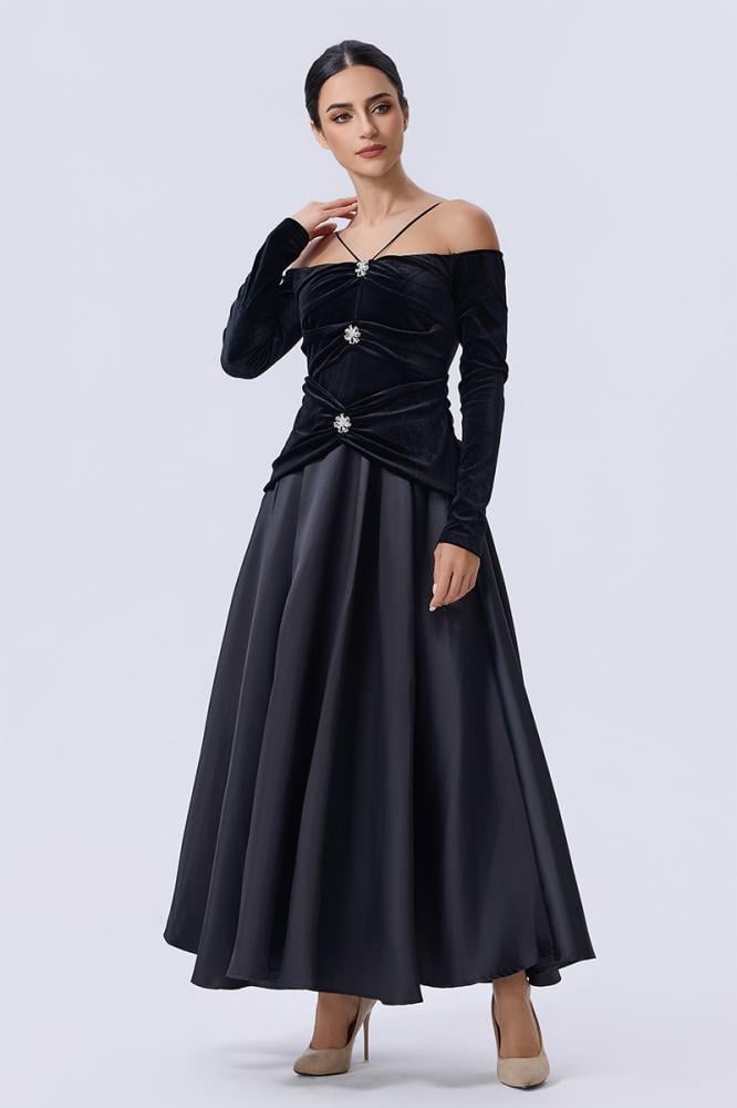 فستان أسود مخملي بأكتاف مكشوفة وتنورة واسعة
