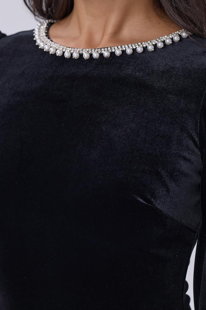 فستان أسود مخملي بتفاصيل لؤلؤية عند الياقة