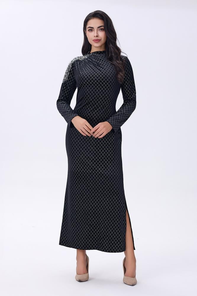 فستان فاخر بتصميم أنثوي راقٍ من المخمل الأسود الفاخر، تميّز بنقشة هندسية لامعة تضيف لمسة من البريق الناعم للإطلالة. قصّته الانسيابية تحتضن القوام برقي، مع فتحة جانبية أنيقة تمنح راحة وحركة انسيابية. خيار مثالي للسهرات والمناسبات الشتوية التي تبحثين فيها عن الأناقة الكلاسيكية مع لمسة عصرية جذابة.