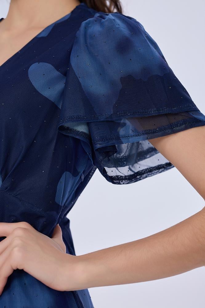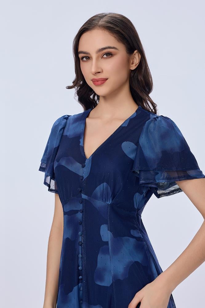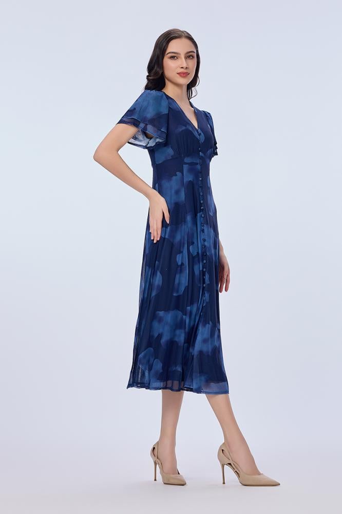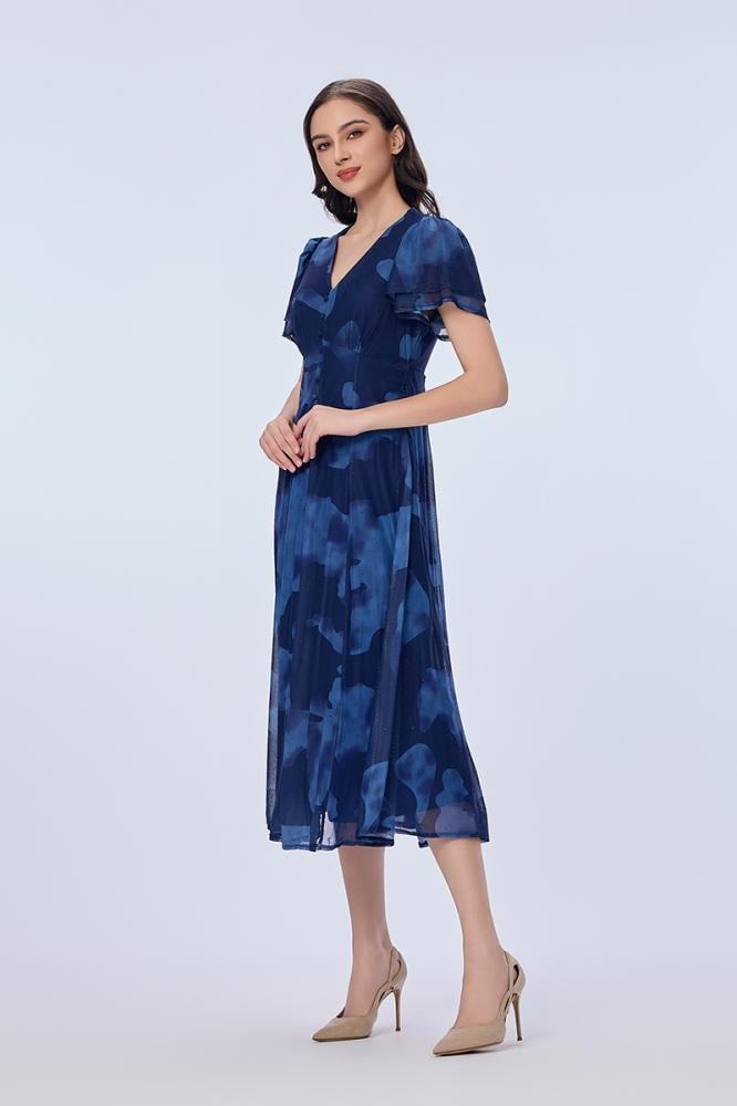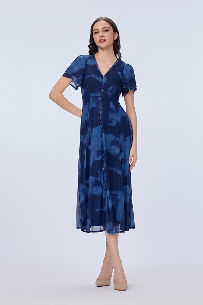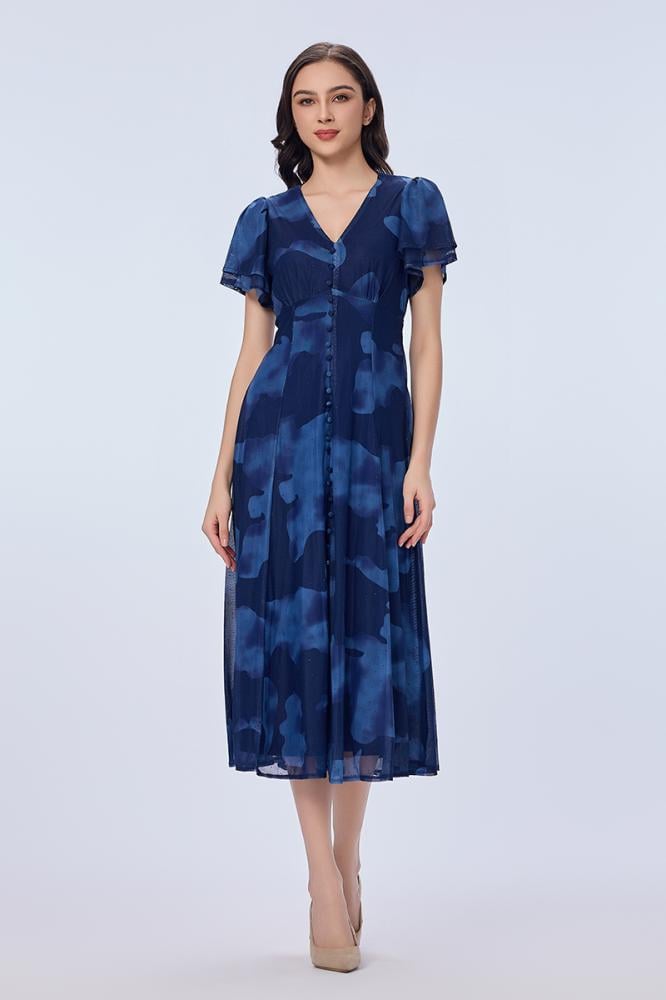 فستان يأتي بلون أزرق ملكي أنيق مع تصميم يجمع بين البساطة والرقي يتميز بقصة متوسطة الطول تنسدل بانسيابية، مما يمنحه مظهرًا أنثويًا ناعمًا. التصميم مزين بطبعات بدرجات الأزرق المتداخلة