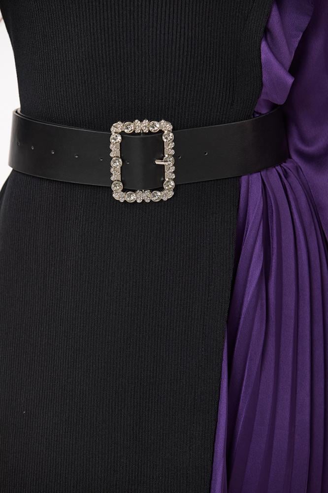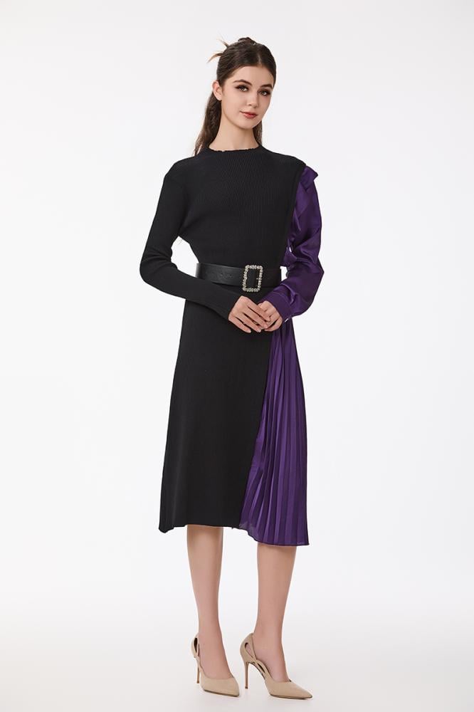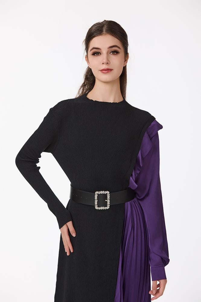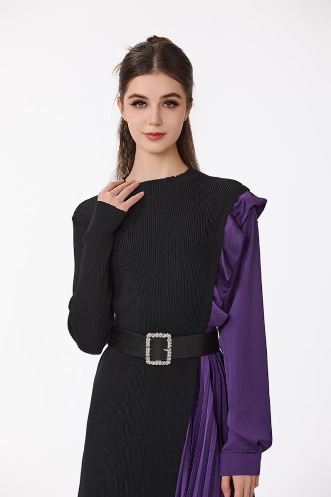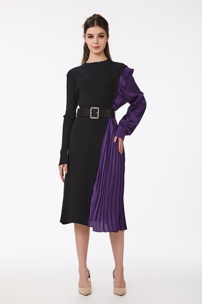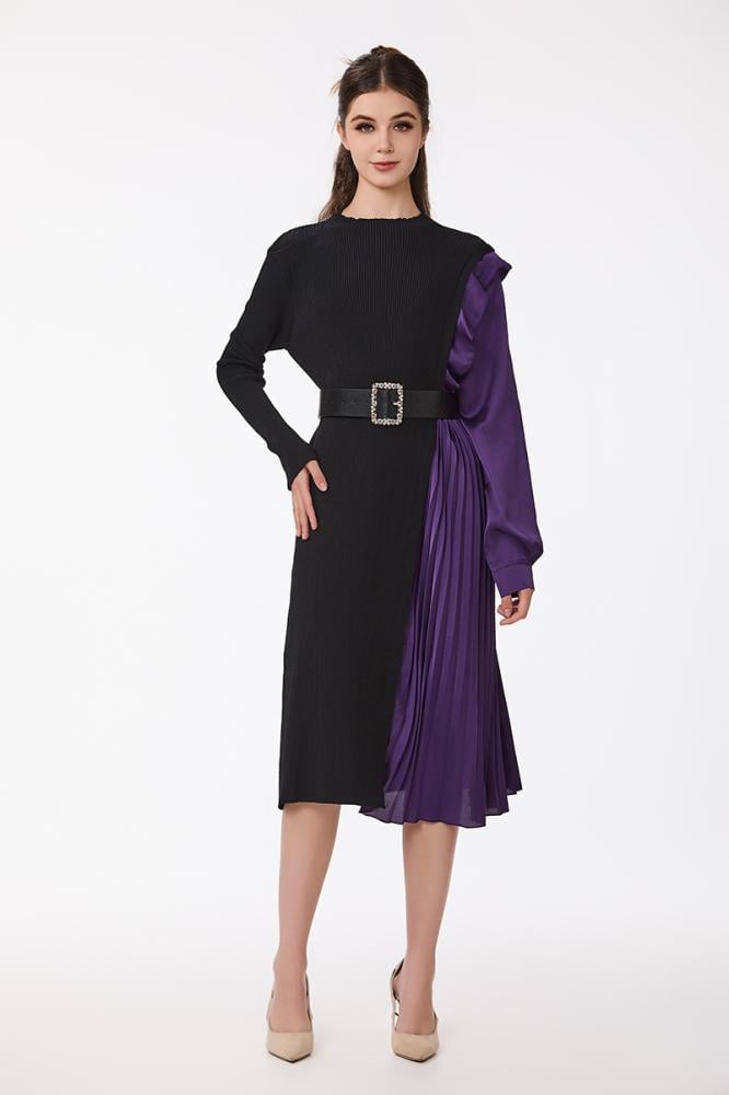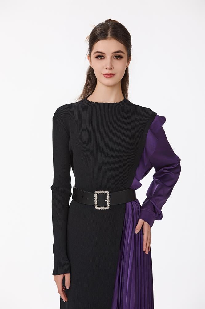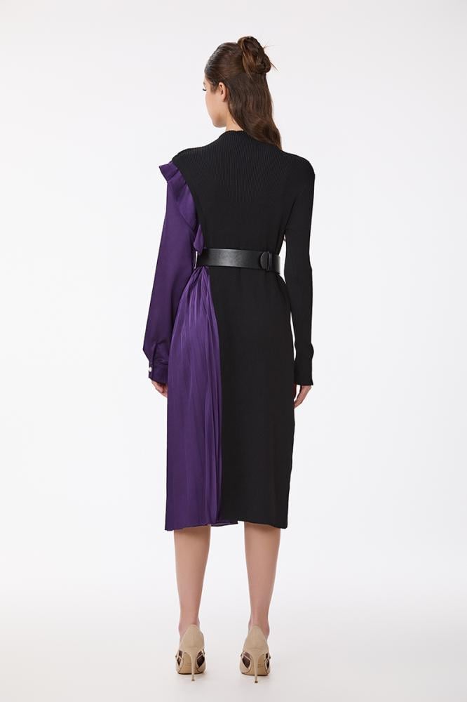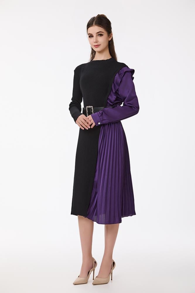 - الألوان والخامات: يتميز الفستان بلون أسود أنيق، مصمم من قماش استرتش يوفر لك الراحة والمرونة. بينما يضيف الستان البنفسجي لمسة من الفخامة، مما يجعل هذا الفستان مميزًا وجذابًا.