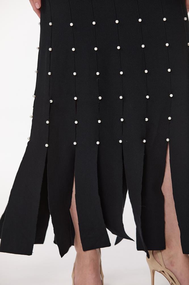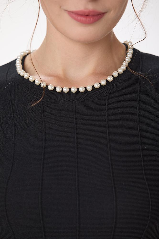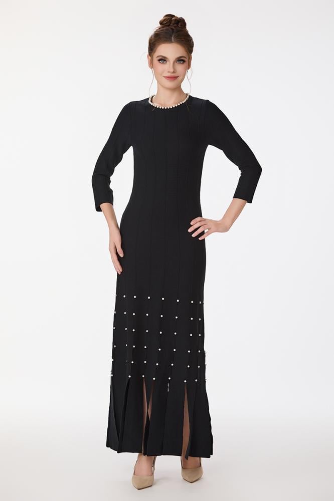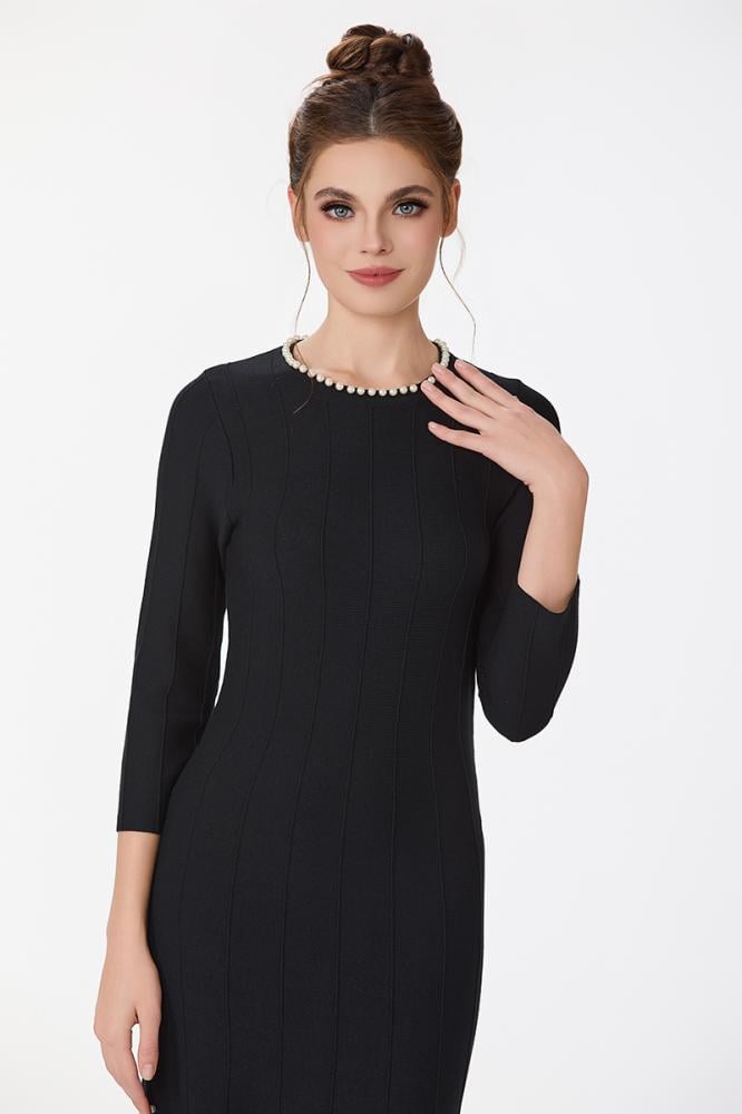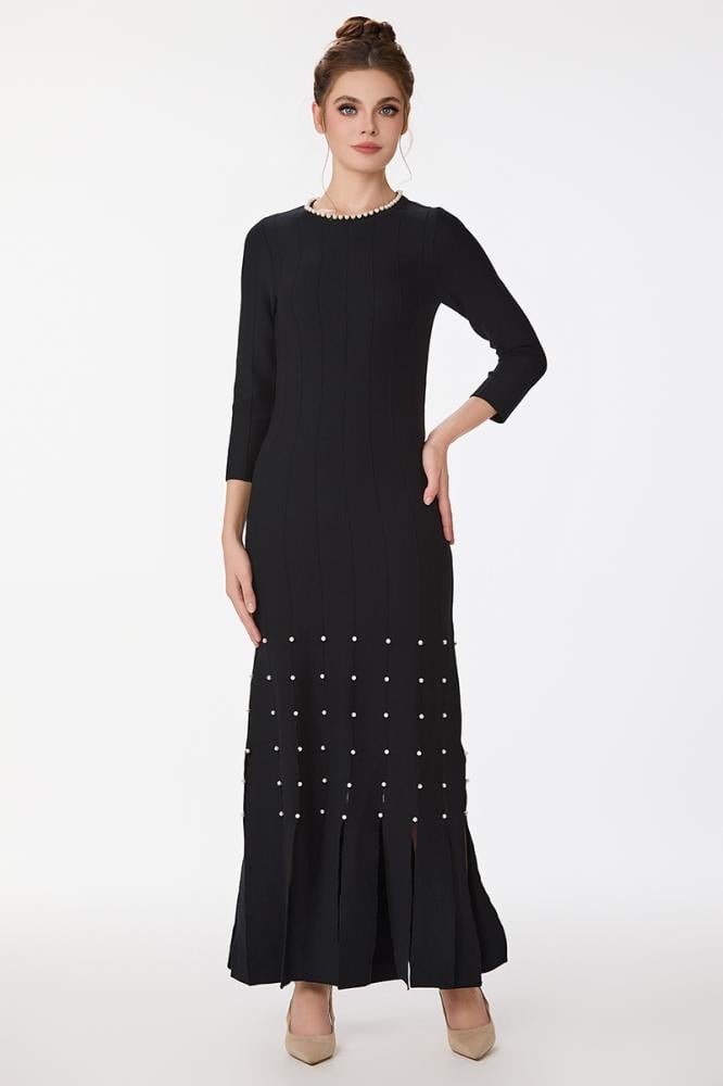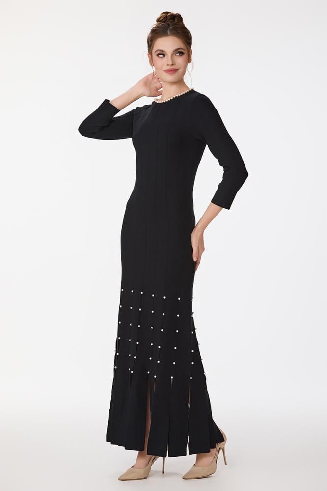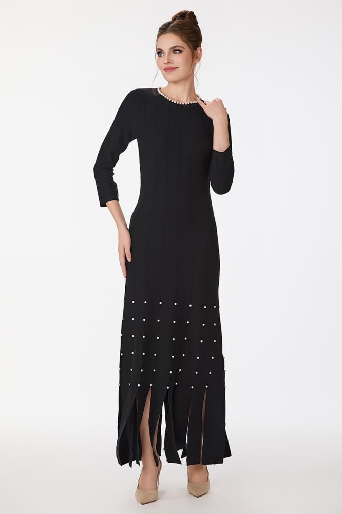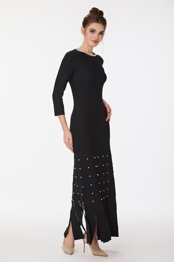 فستان استريتش اسود بقصة انثوية مميزة مع لؤلؤ على الياقة واطراف الفستان بقصات متعددة