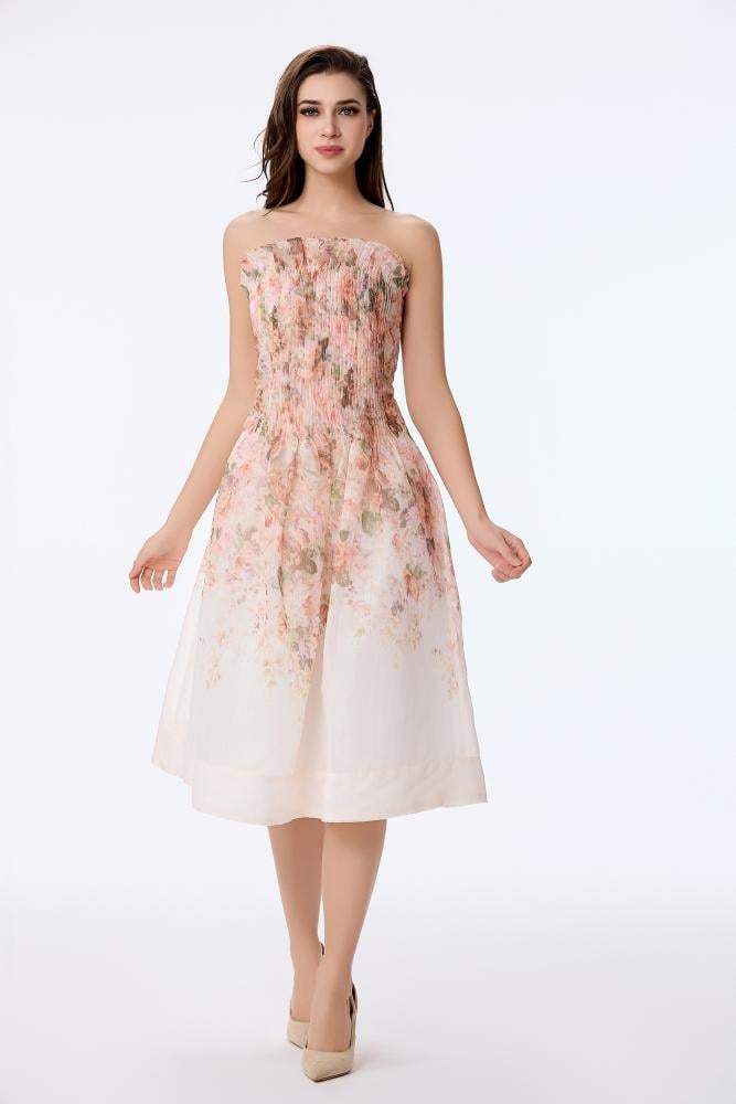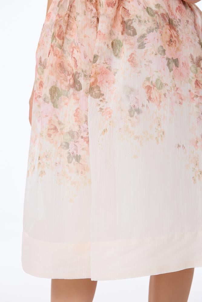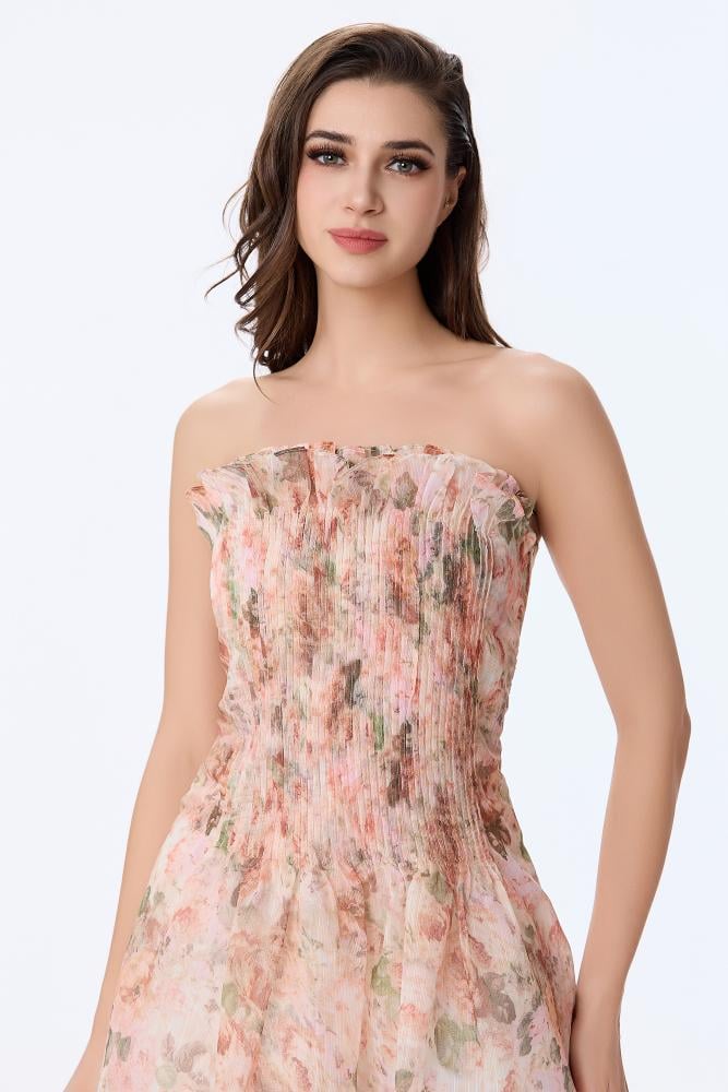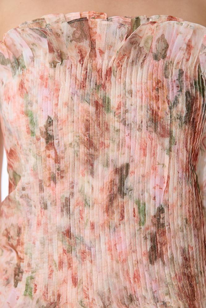 فستان اورغنزا بنقشة الورد بثنيات غنية على الصدر لقصة كورسيه مميزة مع تنورة كلوش