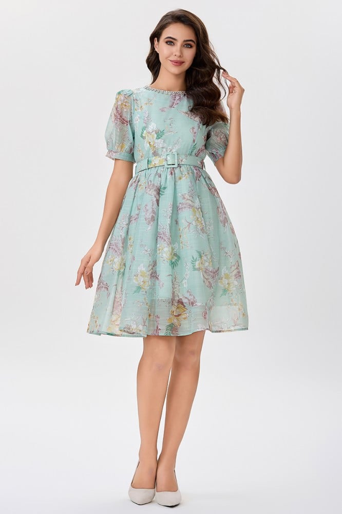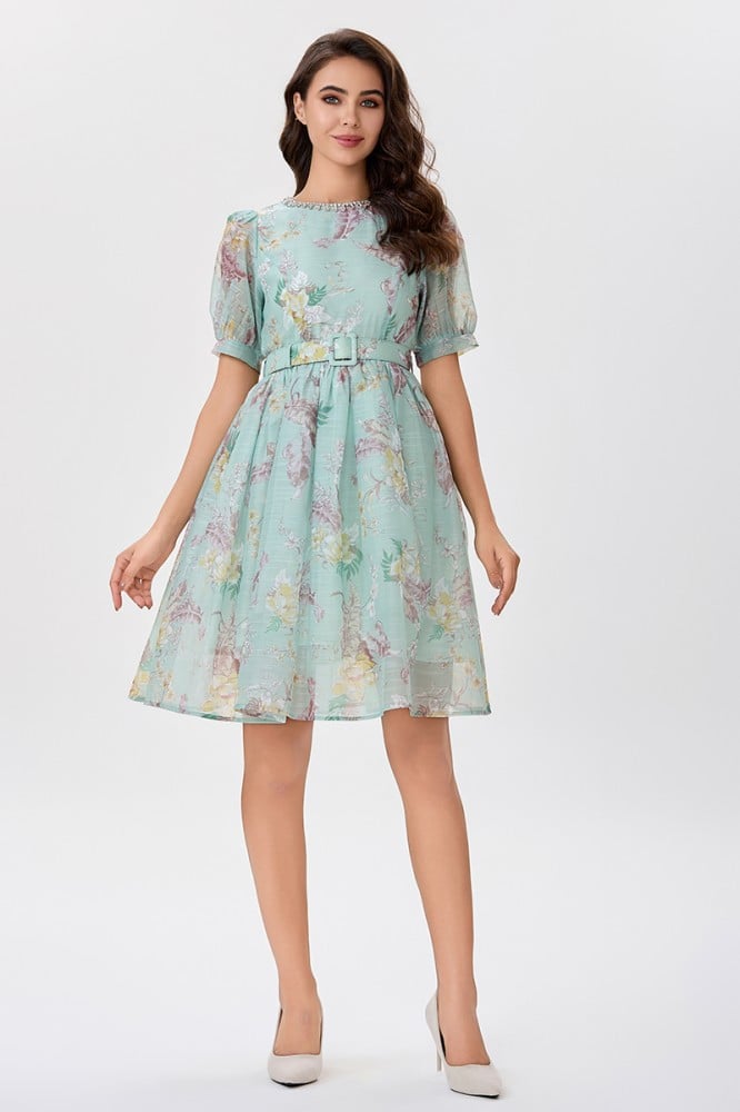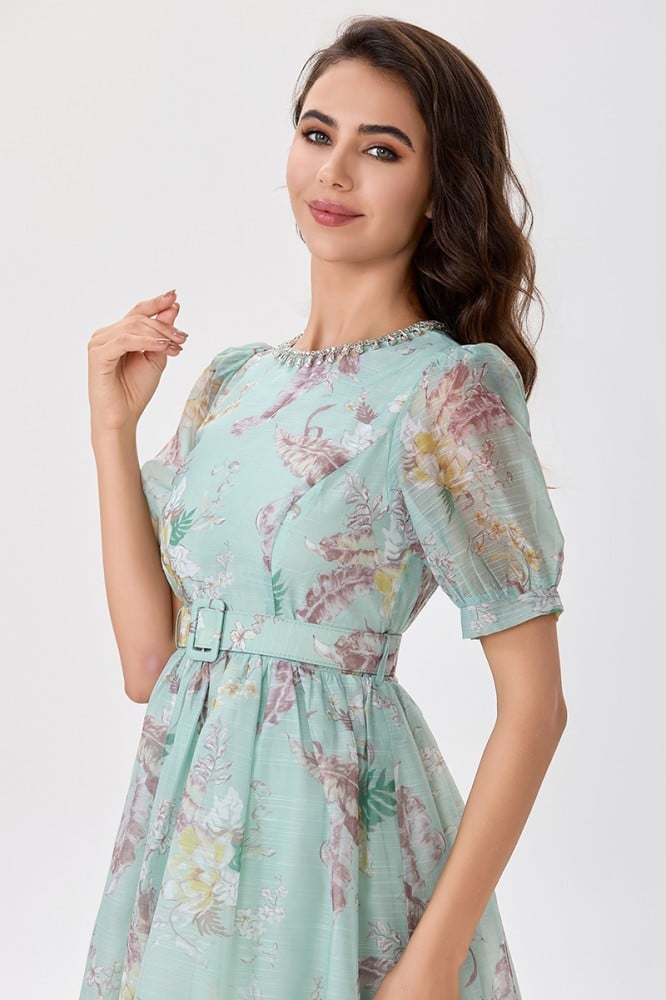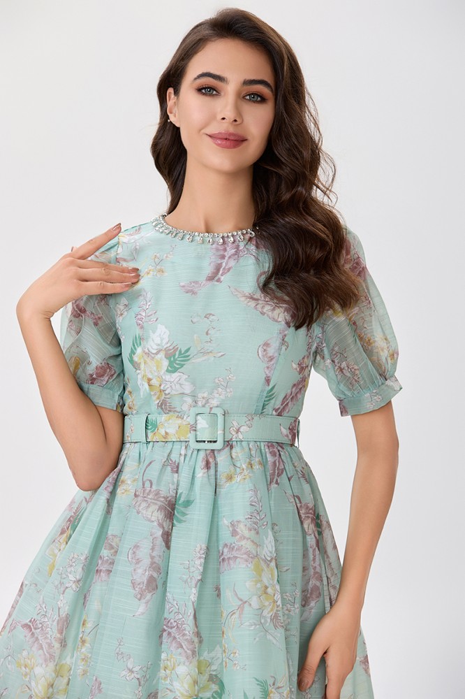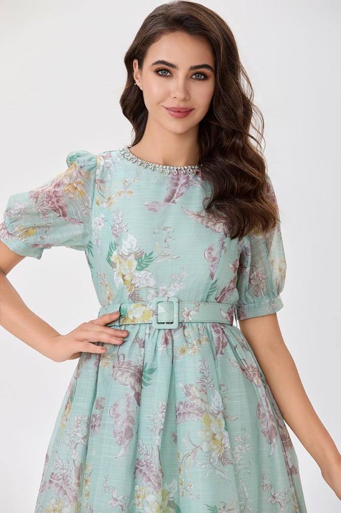 فستان اورغنزا تركواز بنقشة الزهور مع كريستال على الياقة وحزام عريض على الخصرالخامة اورغنزا : غير قابلة للتمددسماكى النسيج : خفيفةدليل المقاسات