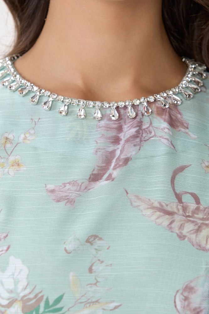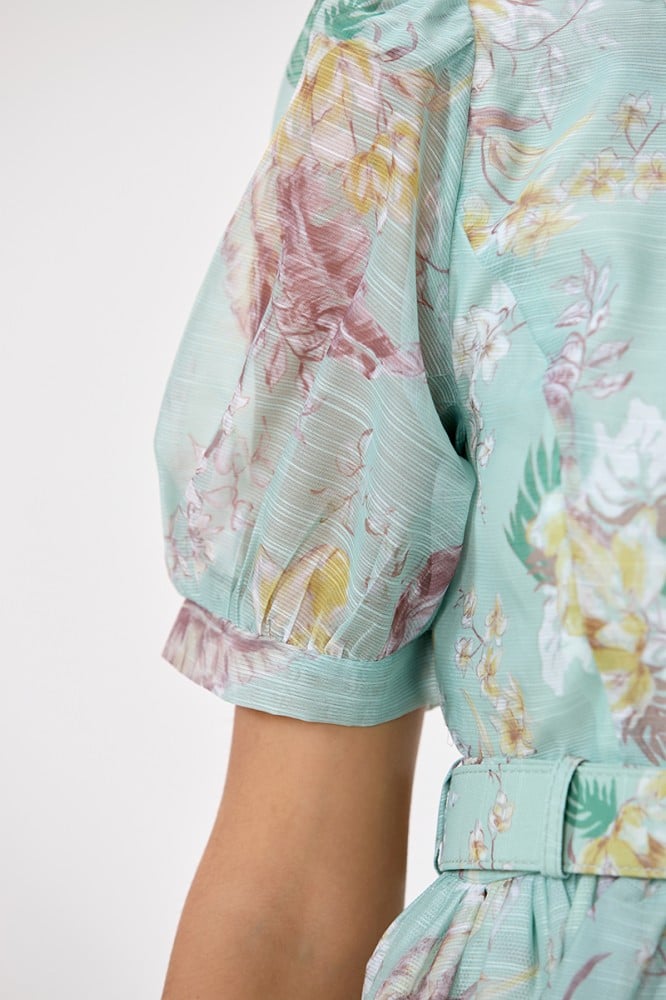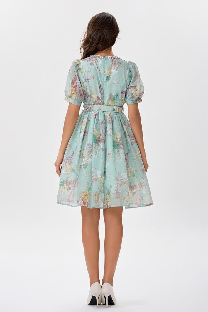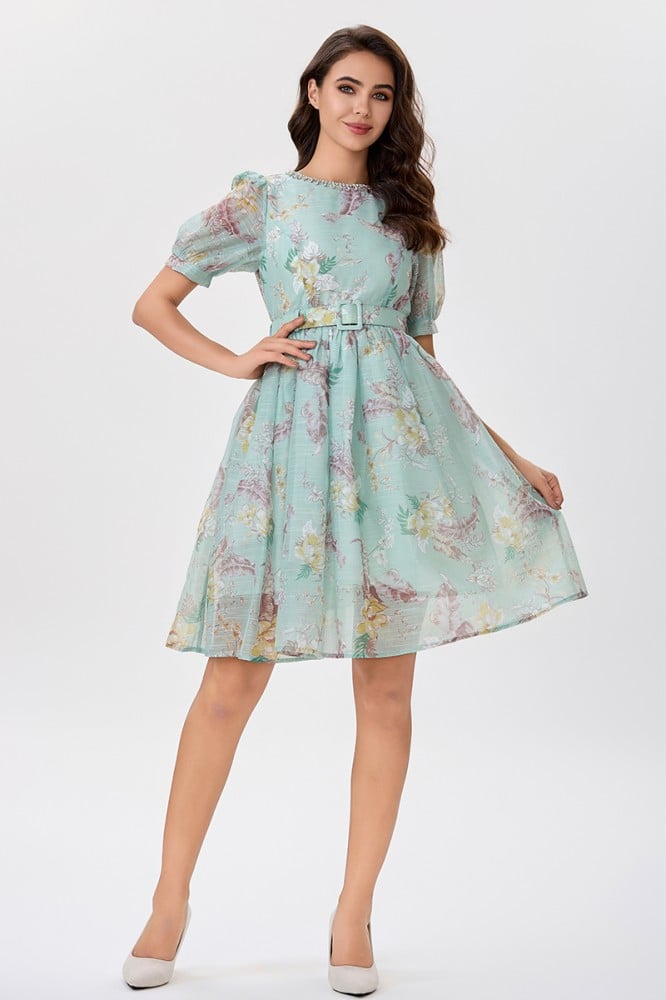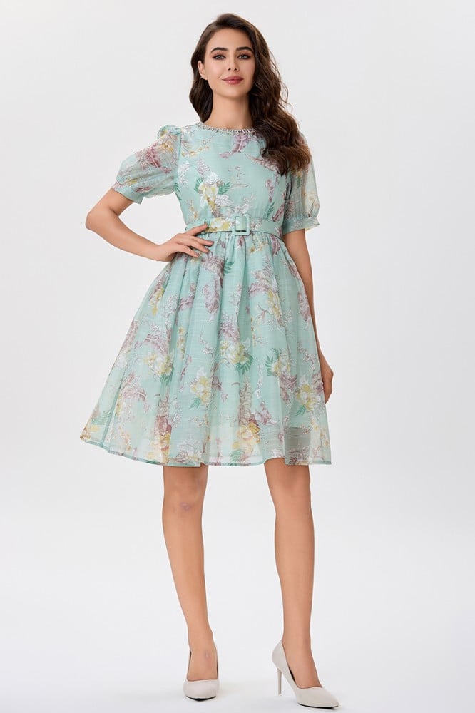 فستان اورغنزا تركواز بنقشة الزهور مع كريستال على الياقة وحزام عريض على الخصرالخامة اورغنزا : غير قابلة للتمددسماكى النسيج : خفيفةدليل المقاسات