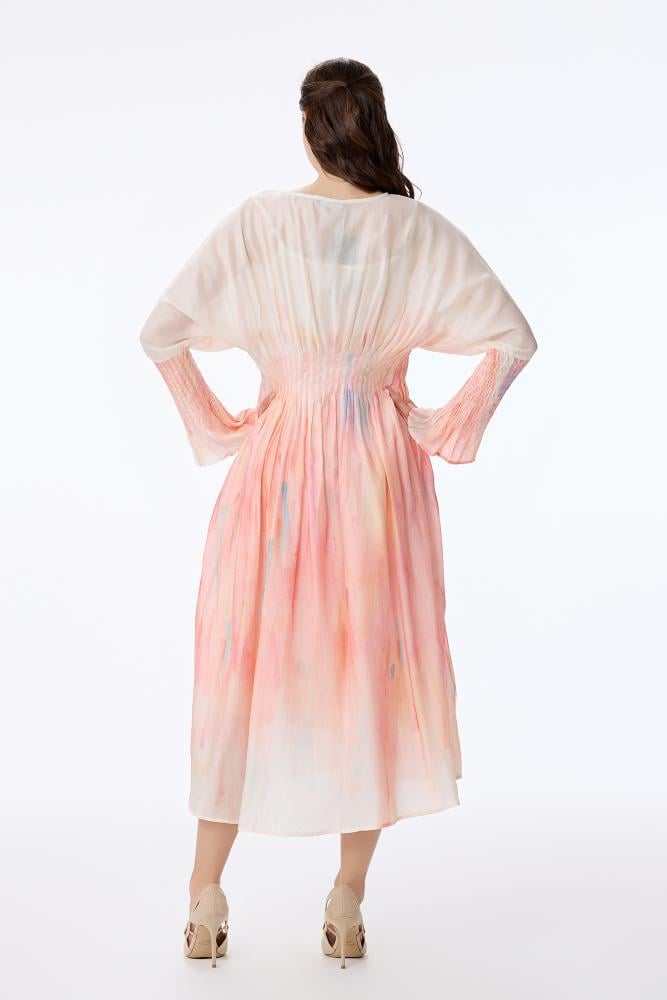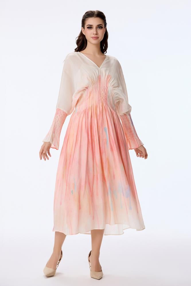فستان اورغنزا ناعم بيج بتدرجات الالوان الفاهية وثنيات غنية لتحديد الخصر في قصة الفراشة الفضفاضة