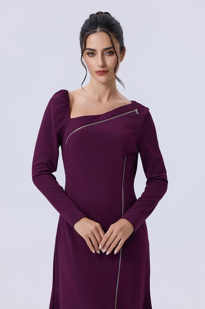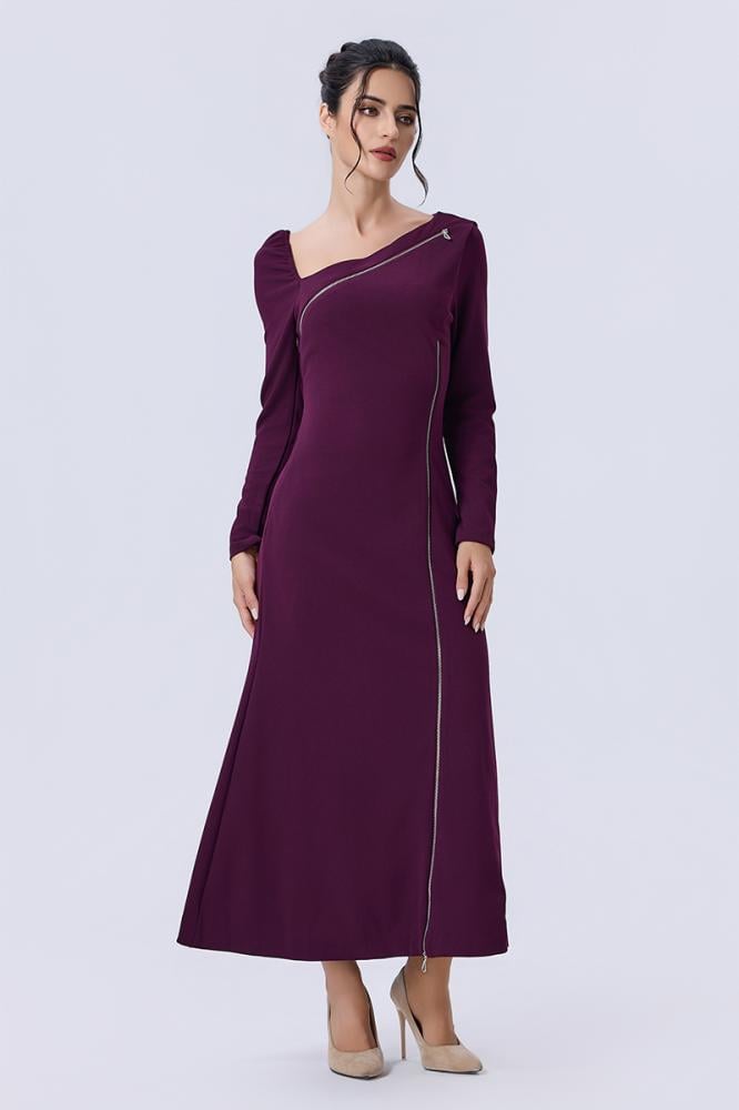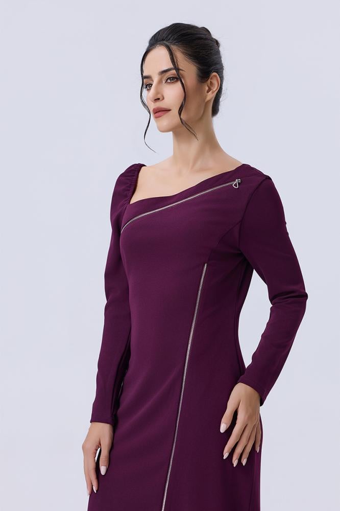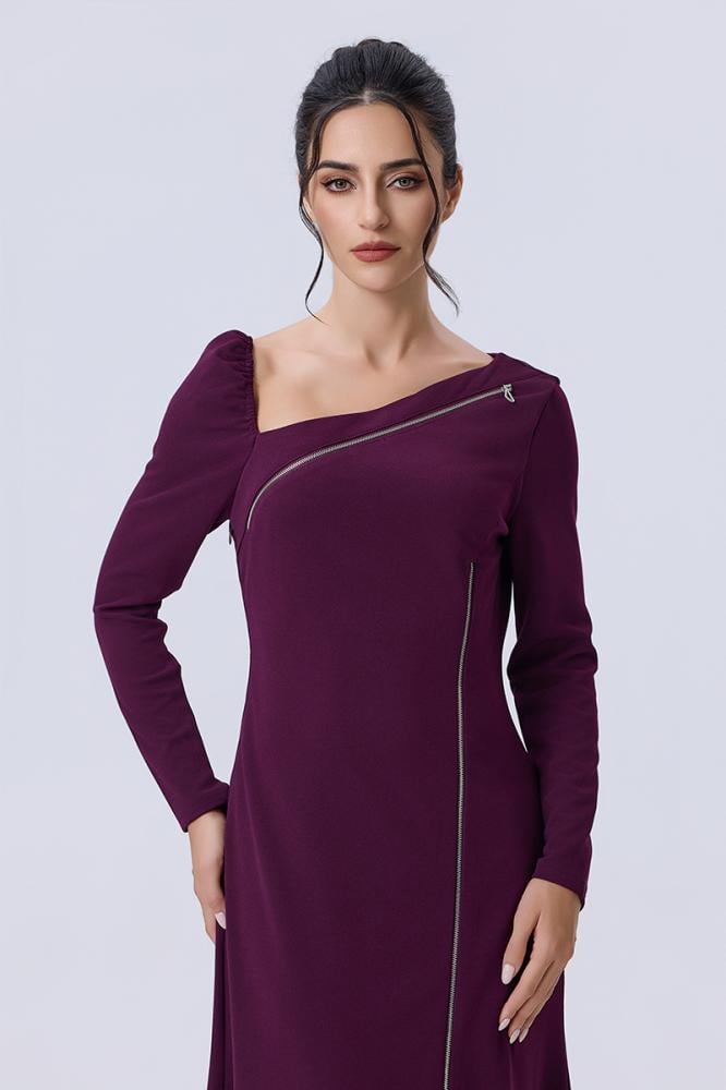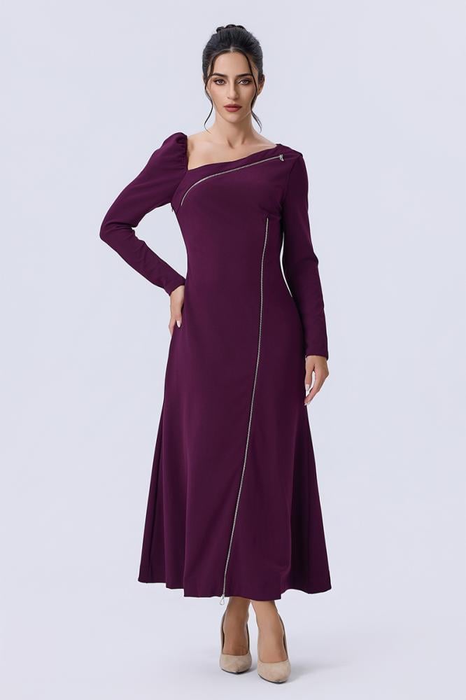 تميزي بإطلالة أنثوية عصرية مع هذا الفستان الأنيق باللون البنفسجي. تصميمه بفتحة كتف واحدة يضيف لمسة جريئة، مع سحاب مائل مزين بتفاصيل معدنية تمنحك أسلوبًا مختلفًا وجذابًا. قصته الطويلة تعكس فخامة وأناقة مثالية للسهرات والمناسبات الخاصة.