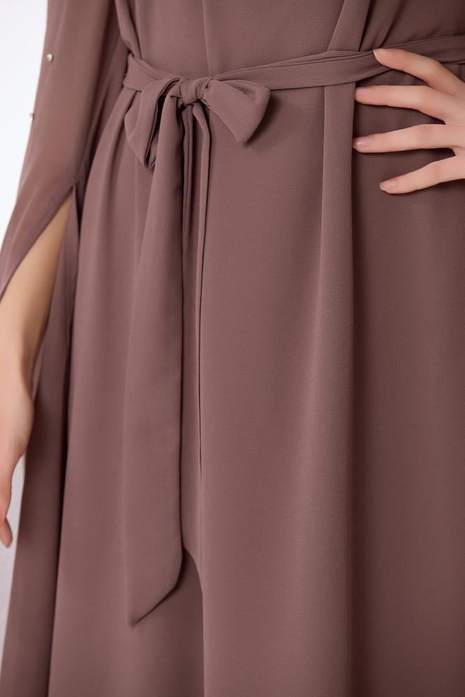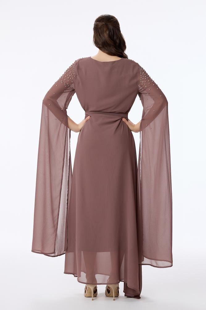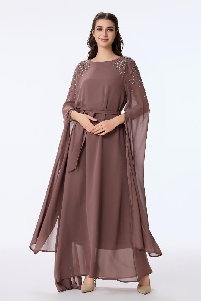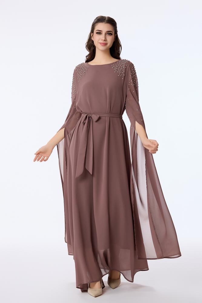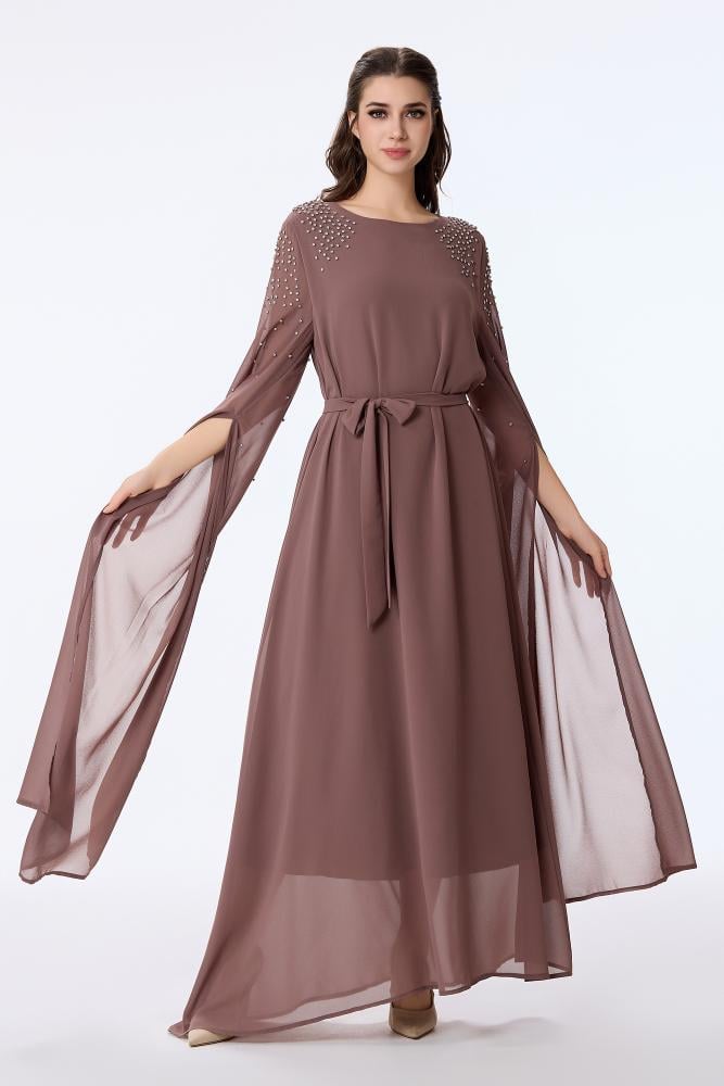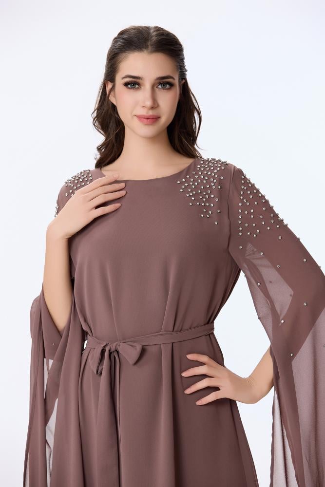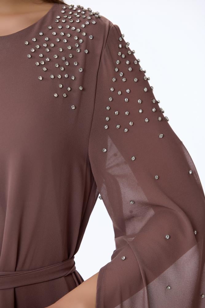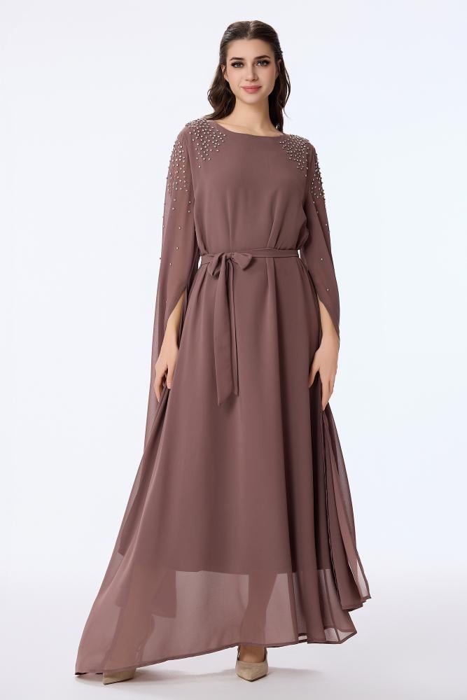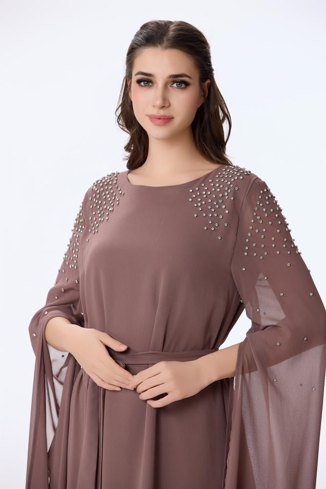 فستان بقصة الجلابية لون ترابي مع كريستال غني على الاكتاف وقصة فضفاضة مريحة