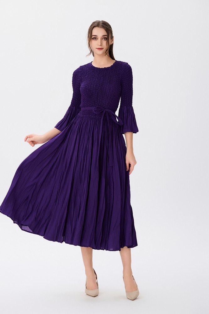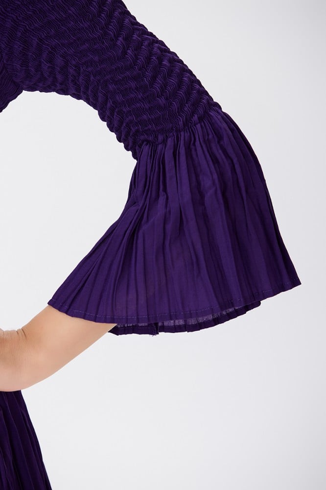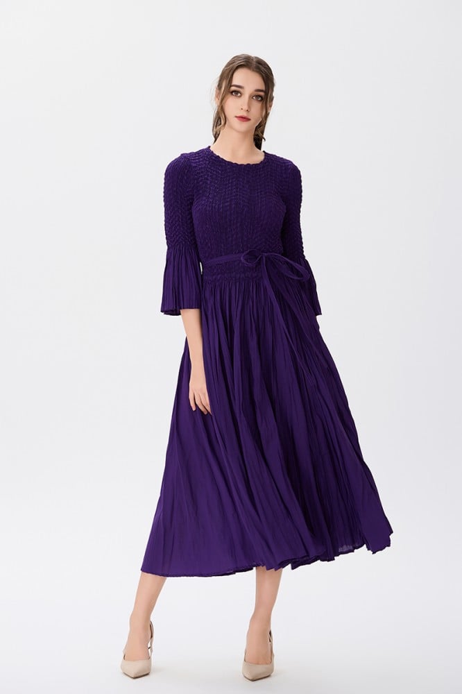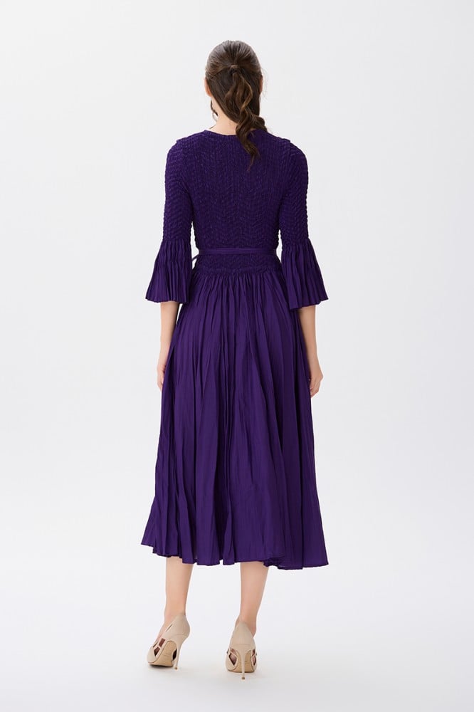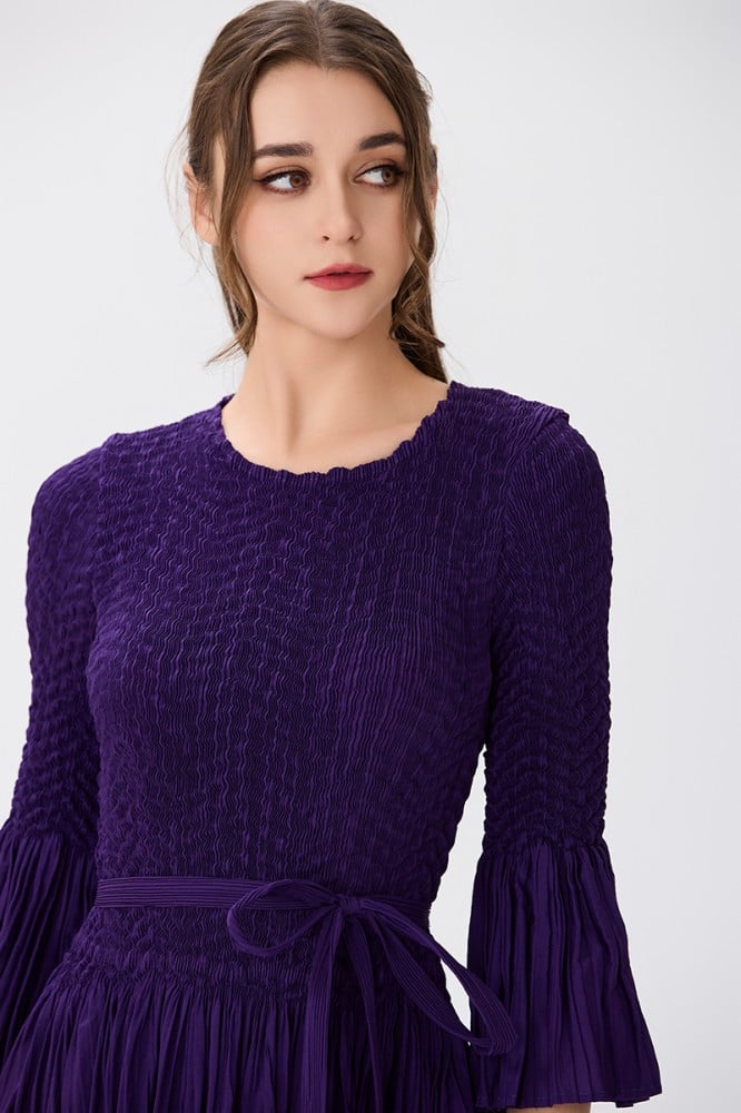 فستان شيفون بنفسجي بخياطة مميزة على الصدر تنورة كلوش وأكمام بأطراف فضفاضةالخامة شيفون : قابلة للتمددسماكة النسيج : خفيفةدليل المقاسات