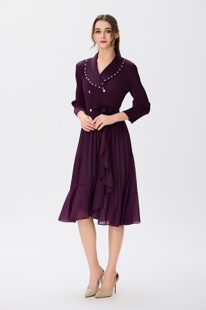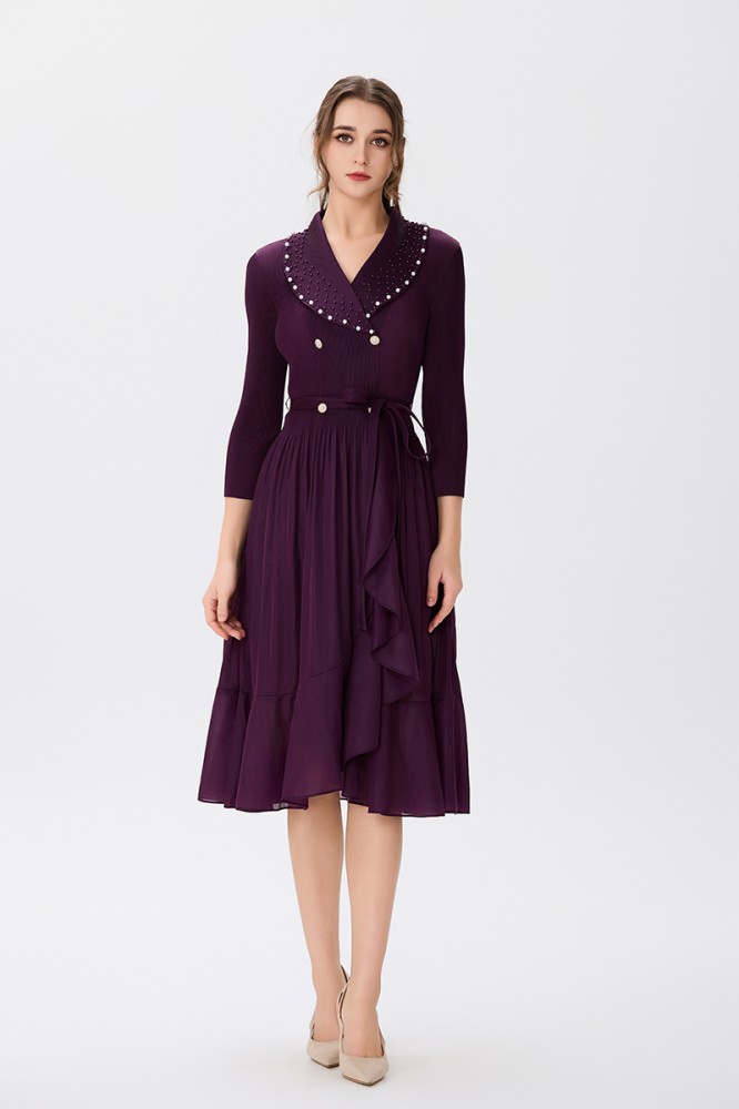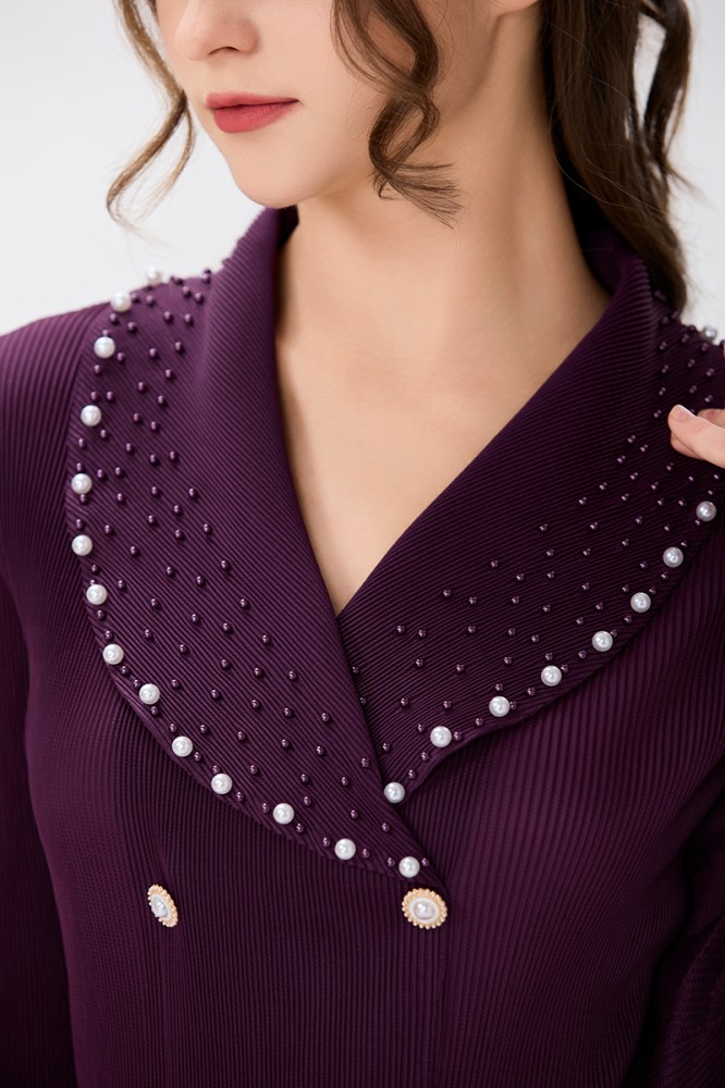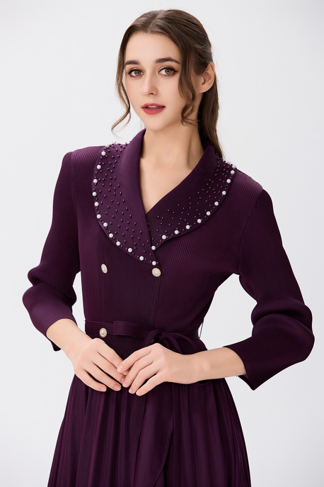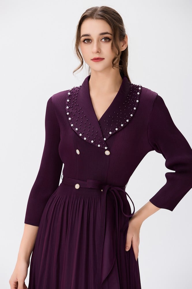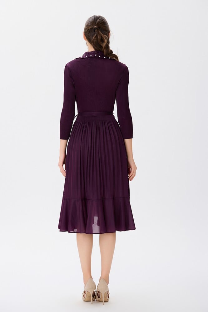 يتألق الفستان بلون عنابي غني وجميل، يُبرز أناقة القطعة ويُضفي لمسة من الفخامة. يتماشى هذا اللون العميق مع البليسية بشكل رائع، مما يخلق توازنًا جميلًا ويجعل الفستان ملفتًا للنظر.