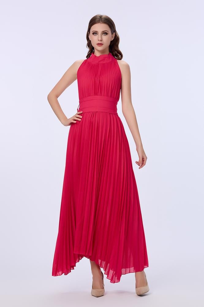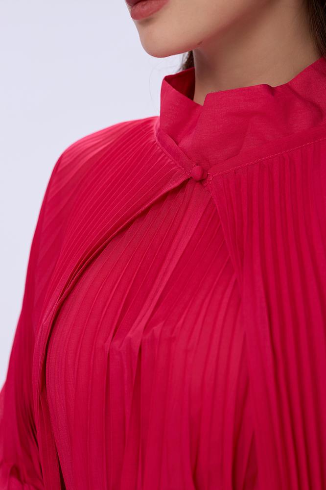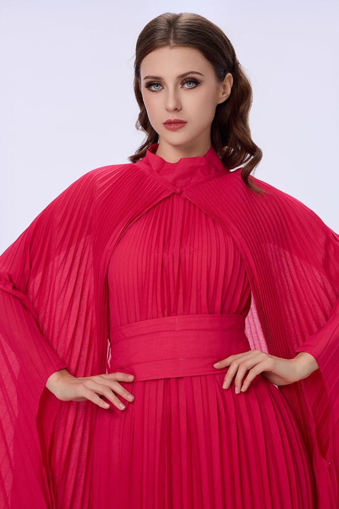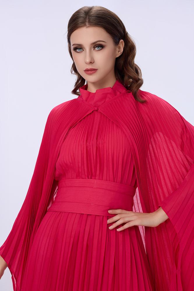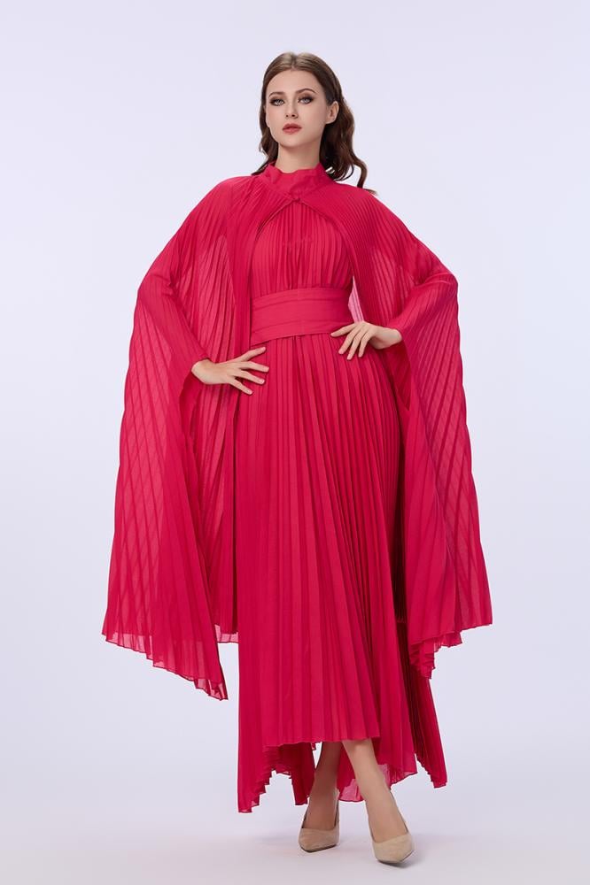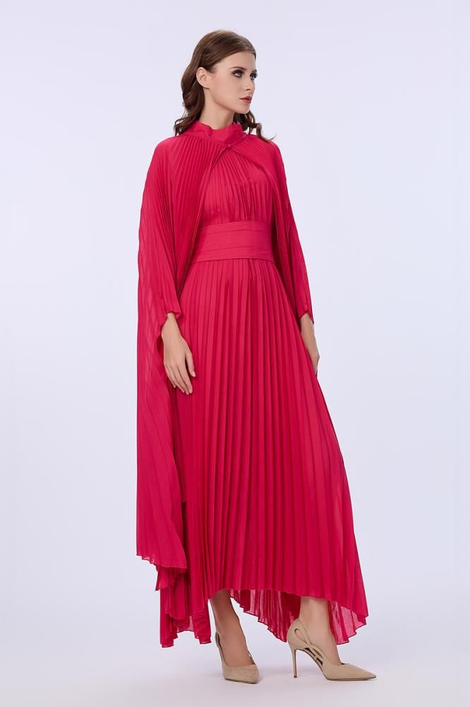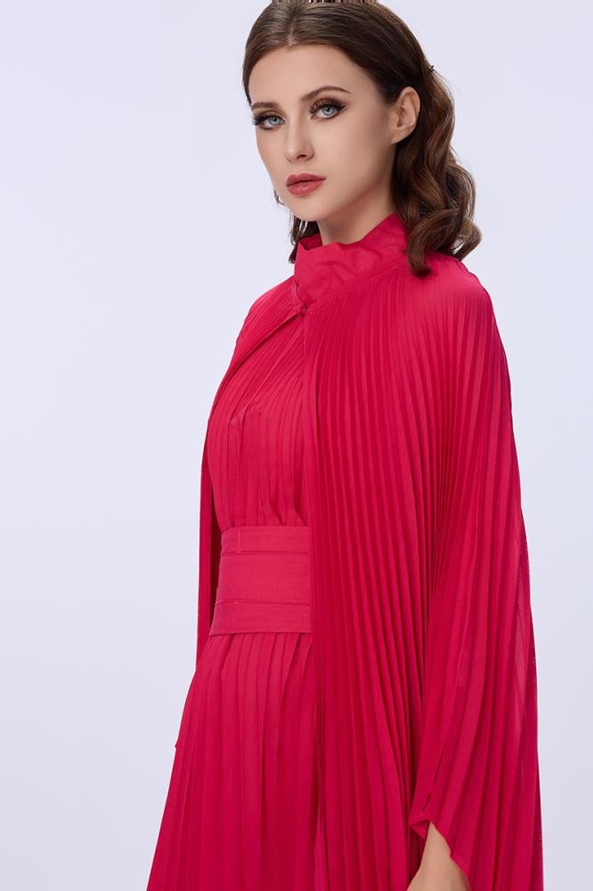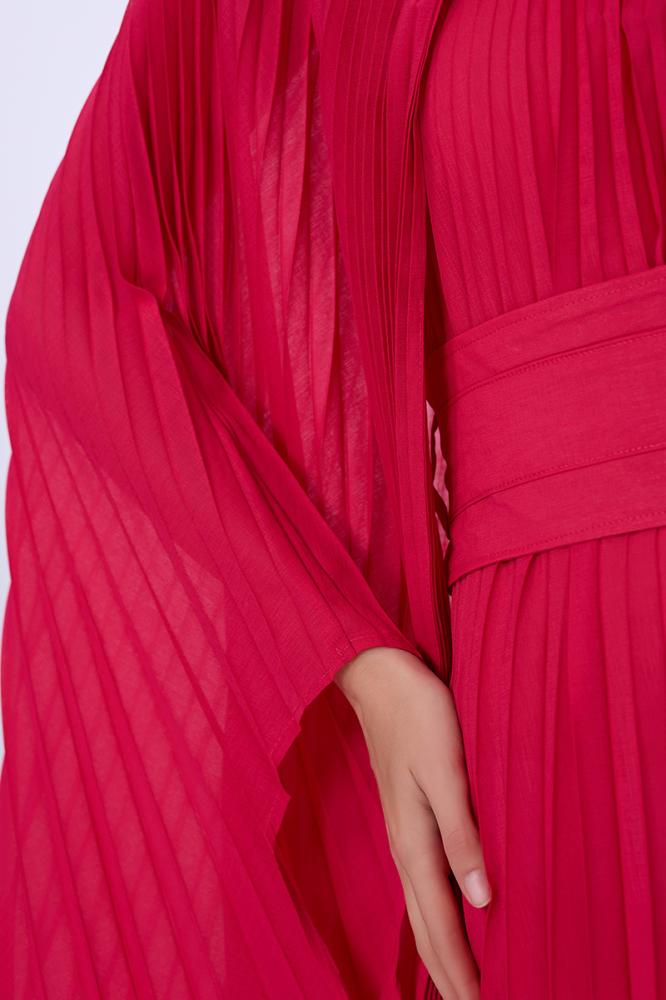 فستان أنيق بلون فوشي بتصميم بليسيه يمنحه مظهراً عصرياً وانسيابياً. يتميز بقصة واسعة وفضفاضة، مع أكمام طويلة تعطي إحساساً بالفخامة والرقي