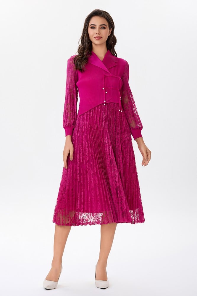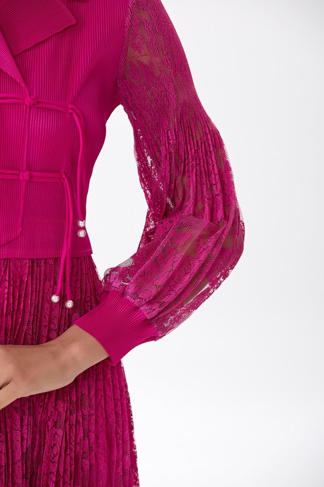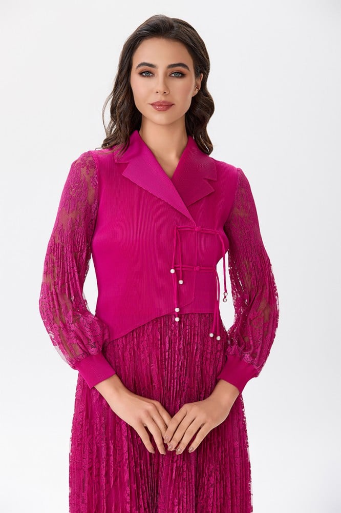 فستان بليسية خامة استرتيش لون فوشيا قصة جاكيت مع اكسسوار مميز على الصدر أكمام طويلة دانتيل مع طرف مغاط وتنورة دانتيل بليسية كلوشالخامة دانتيل : قابلة للتمددسماكة النسيج : خفيفة