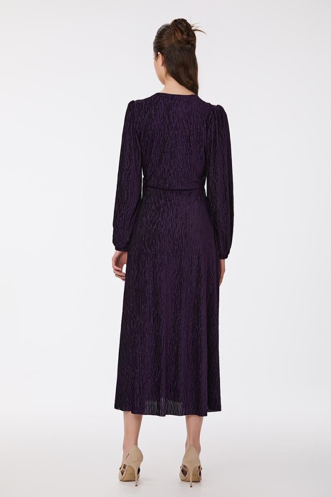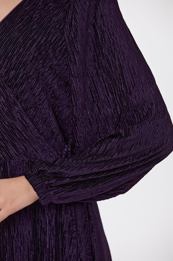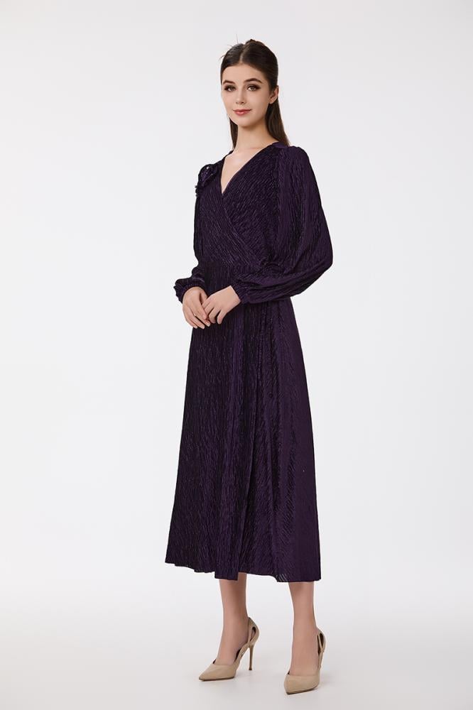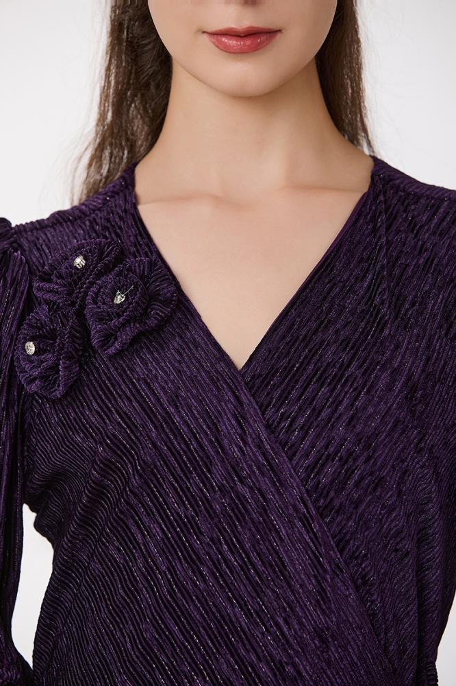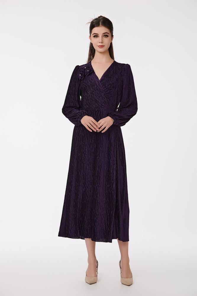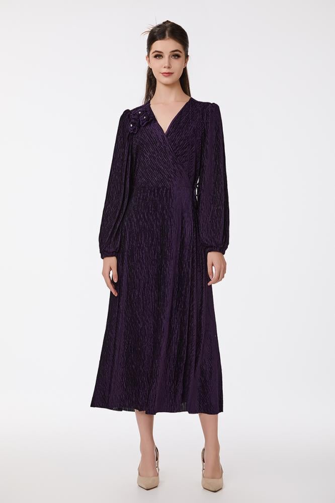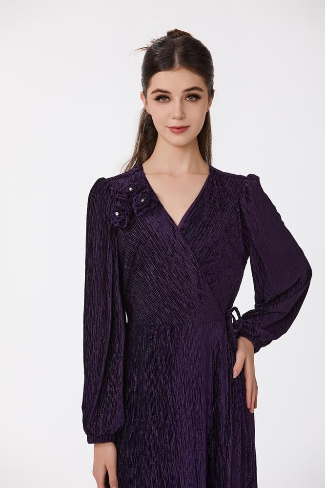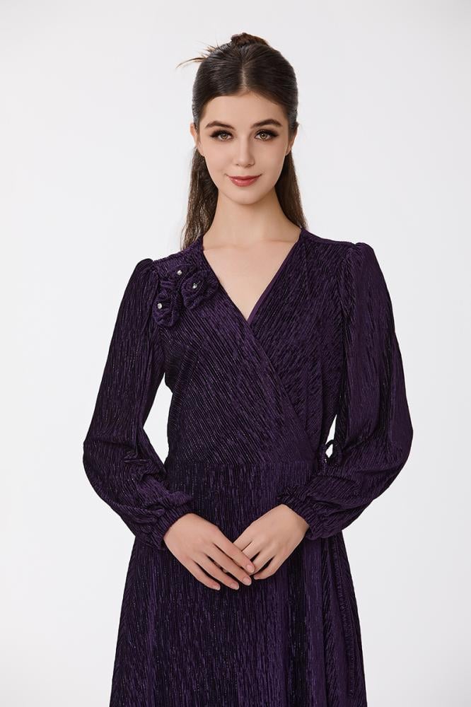 فستان بليسيه بنفسجي مع كريستال بقصة مزدوجة واكسسوار على الكتف مع تنورة كلوش