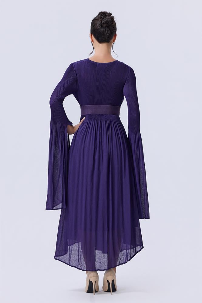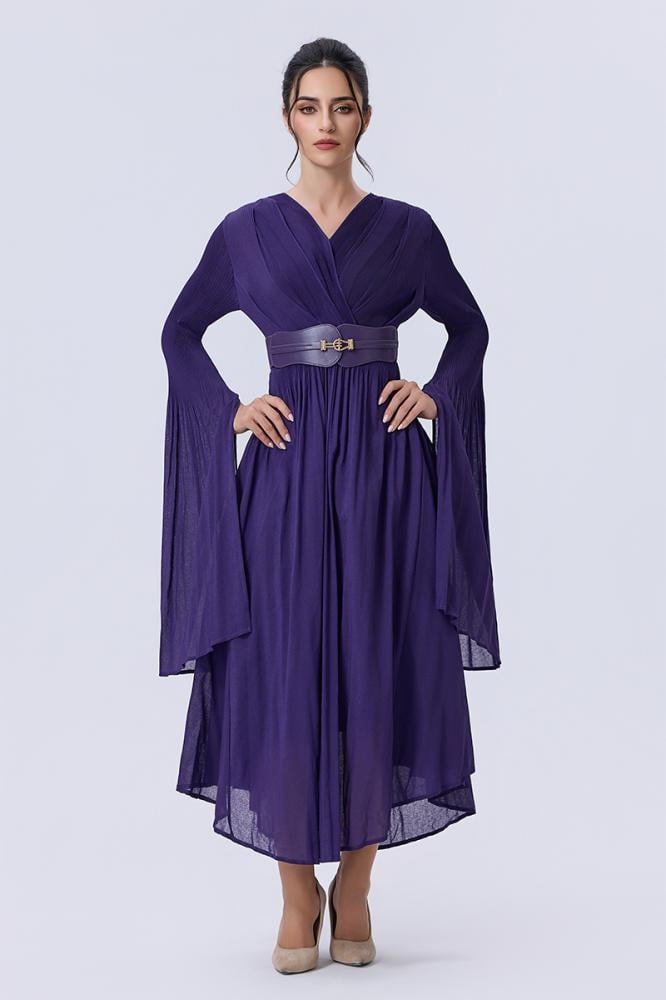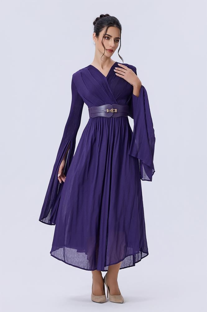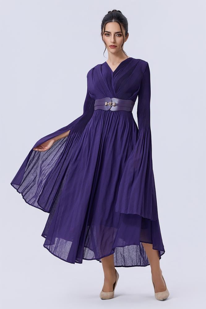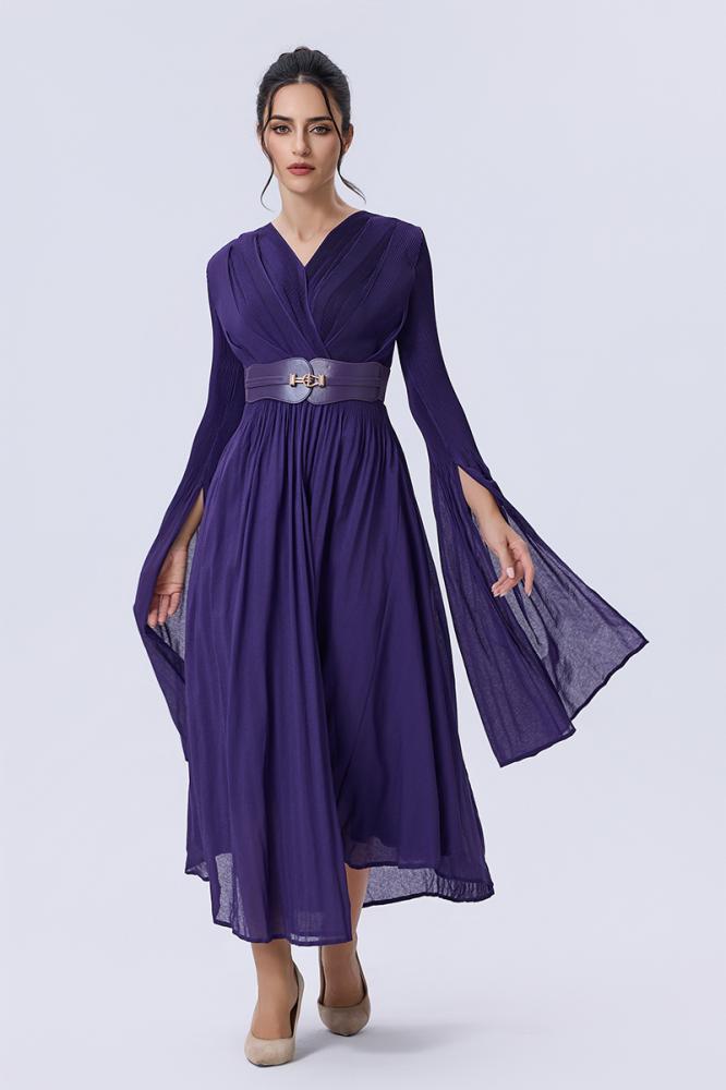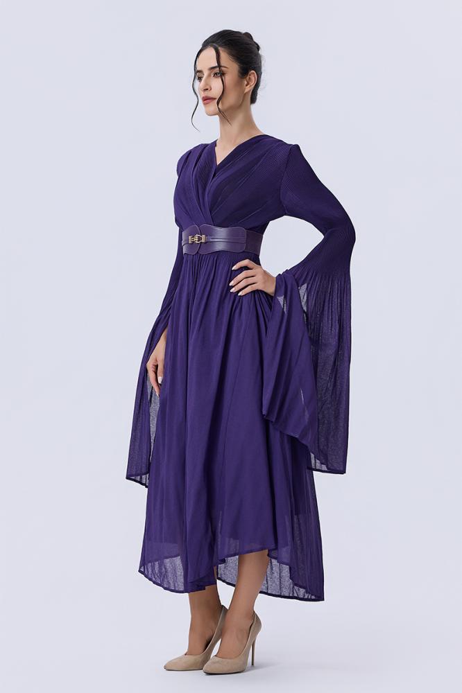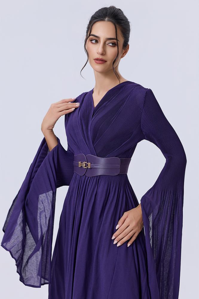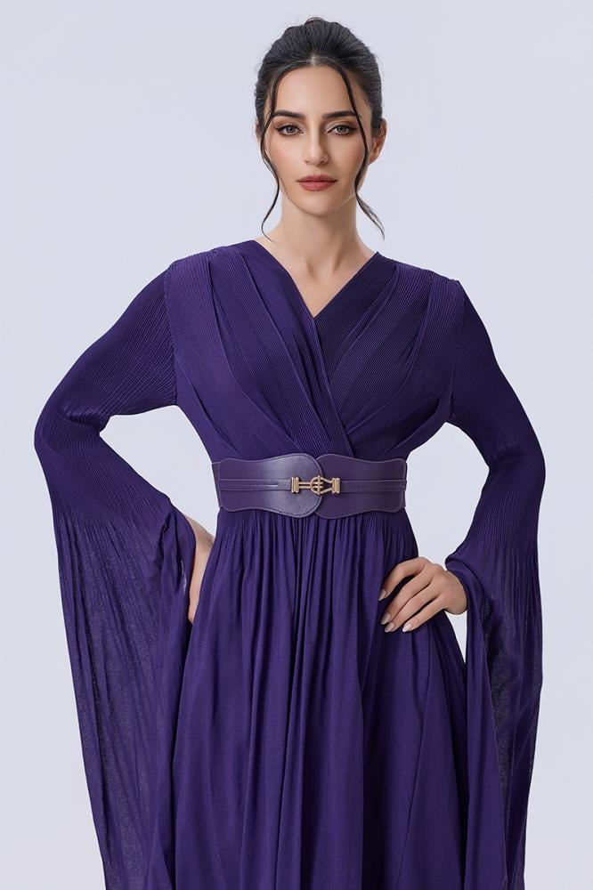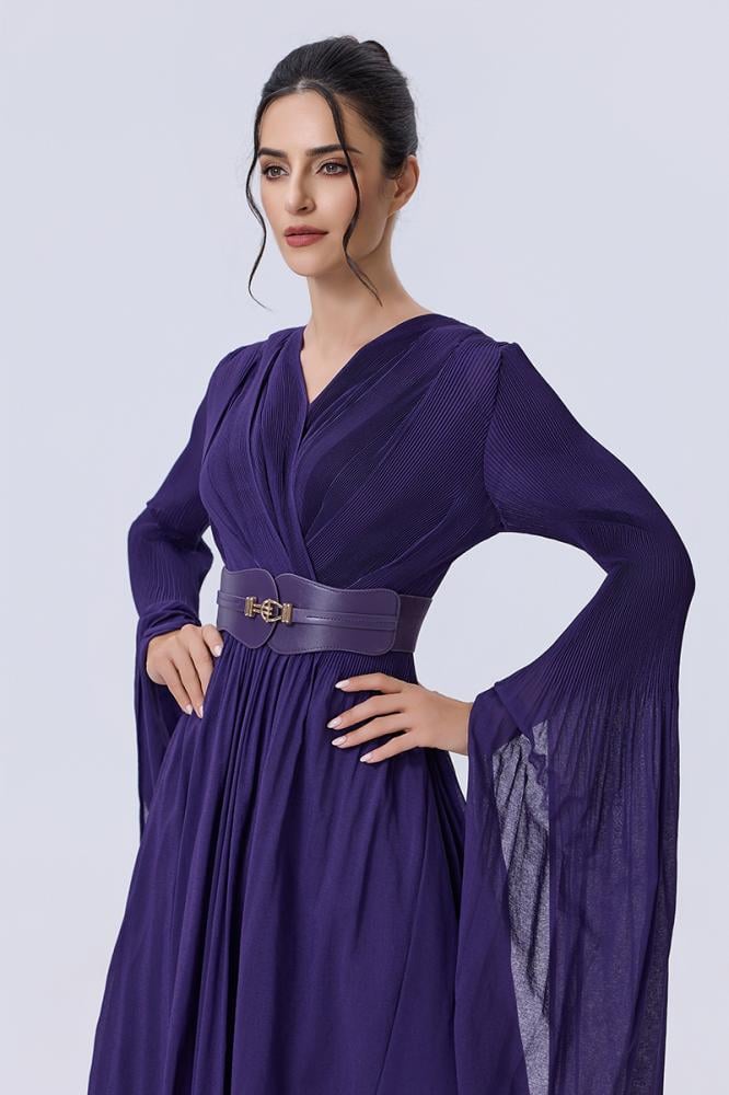 فستان بنفسجي بأكمام كاب واسعة وحزام خصر